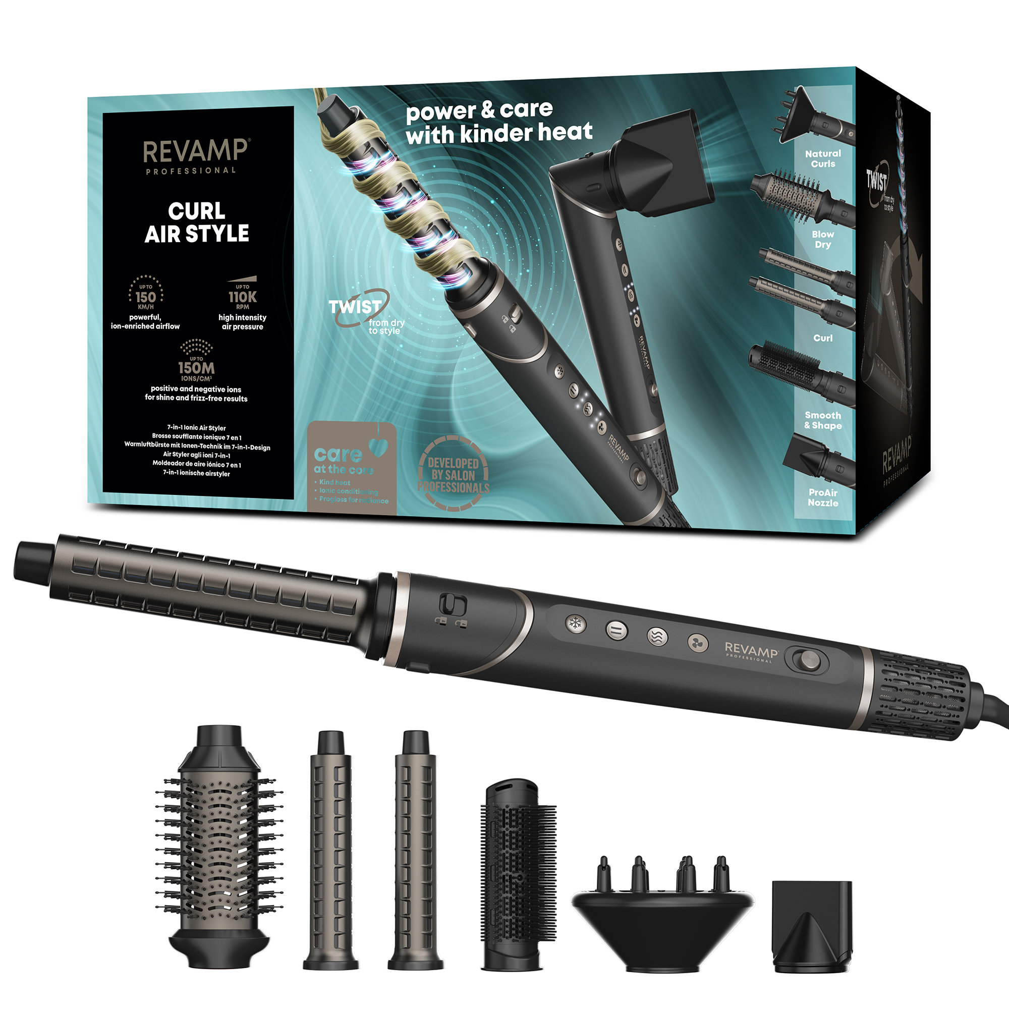 EAN Code : Individual Retail Pack 5010777165449 Product Width (cm) 13 Product Depth (cm) 35 Product Height (cm) 12 Outer Carton Weight (kg) 11.45 Outer Carton Width (cm) 39.5 Outer Carton Depth (cm) 46 Outer Carton Height (cm) 40.8 MAINS Power Mains Main Battery Quantity 0 Retail Product Title REVAMP Curl Air Style 7 in 1 Ionic Air Styler Short Retail Product Title (60) REVAMP Curl Air Style 7 in 1 Ionic Air Styler Short Description One styling tool. Endless looks. The REVAMP Curl Air Style is your hair hybrid must-have for creating multiple looks to suit your mood. From big bouncy curls to sleek, straight styles, the 6 interchangeable attachments put the power to customise your style in your hands. With 4 temperatures and 3 speed settings (plus a cold shot to lock in your style), this all-in-one dryer and styler lets you find the right temperature for your hair type. With a single twist, rotate between a powerful hair dryer and multi air styler with kinder heat delivery. Long Description One tool, infinite styling possibilities. The REVAMP Curl Air Style 7 in 1 Ionic Air Styler is your all in one, multi-styling tool crafted to create endless looks from big bouncy curls to a sleek, smooth finish. With a single twist, rotate between a powerful professional hair dryer and multi air styler with kinder heat delivery. FAST, FUSS-FREE DRYING Speed up your styling session with quick-dry technology thanks to a digital intelligent motor that spins at up to 110,000 rpm and generates a high-pressure, high-velocity jet of controlled air (up to 150km/h) for fast drying and precision styling (without extreme heat). An all-in-one, hybrid haircare must-have, this dryer and styler is engineered to take your hair from damp to defined styling using less time and energy. VERSATILE ATTACHMENTS Using 6 interchangeable styling attachments, this styler has the versatility to create a variety of styles to suit your mood. • x2 30mm barrels that automatically air wrap your hair either in a clockwise or anticlockwise direction for big, bouncy curls or loose, flowing waves. • Blow dry brush (37 x 58mm) for adding smoothness with either volume to the roots or shape at the ends • Straight & Shape paddle brush for a smooth sleek finish. • ProAir precision concentrator for removing excess moisture and fast drying. • Finger diffuser for reducing frizz and enhancing natural curls. • Beauty storage bag for styling on the go. IONIC TECHNOLOGY Enjoy faster drying and softer, high-shine results thanks to REVAMP 's deep conditioning active positive and negative ion technology - up to 150 million ions/cm3 coverage for ultimate conditioning and shine. Positive ions open up the hair cuticle adding volume and absorbing moisture while negative ions seal the cuticle to retain moisture, for hair that’s sleek, shiny and healthy. PROGLOSS™ SUPER SMOOTH OILS To ensure your hair is full of lustre and life, all products in the REVAMP haircare range are infused with our signature Progloss™ Super Smooth Oils, including Keratin, Argan, and Coconut oil. This unique combination cares for the hair, leaving it visibly smooth and shiny. FULL CONTROL Your style, your rules. With 4 precise digital temperature and 3 speed controls (including a cold shot to set your look in place), it features a clever pause button to temporarily halt the airflow to not disturb your finished look. This all-in-one dryer and styler also includes a dual filter to ensure optimal, long-lasting motor performance and even comes with a beauty bag for easy storage and a 3-metre salon swivel cable for freedom of movement. Feature 1 Twist & Rotate handle - With a single twist, rotate between a powerful professional hair dryer and an enhanced performance multi style air styler Feature 2 Digital Intelligent brushless motor operates at up to 110,000 rpm for faster drying and kinder styling Feature 3 6 interchangeable styling attachments: x2 30mm curl wrap barrels / Blow dry brush (37 x 58mm) / Straight & Shape paddle brush / ProAir precision concentrator / Curl diffuser Feature 4 4 heat, 3 speed settings, including cold shot to fix the style Feature 5 Pause function to temporarily halt airflow to release hair without disturbing the finished look Feature 6 Positive and negative anti-frizz technology – up to 150 million ions/cm3 coverage for ultimate conditioning and shine Feature 7 Every product in the REVAMP haircare range is infused with Progloss™ Super Smooth Oils - enriched with Keratin, Argan, and Coconut oils for ultimate smoothness, enhanced shine, and frizz-free results Feature 8 Beauty storage bag included Feature 9 3m salon swivel cable