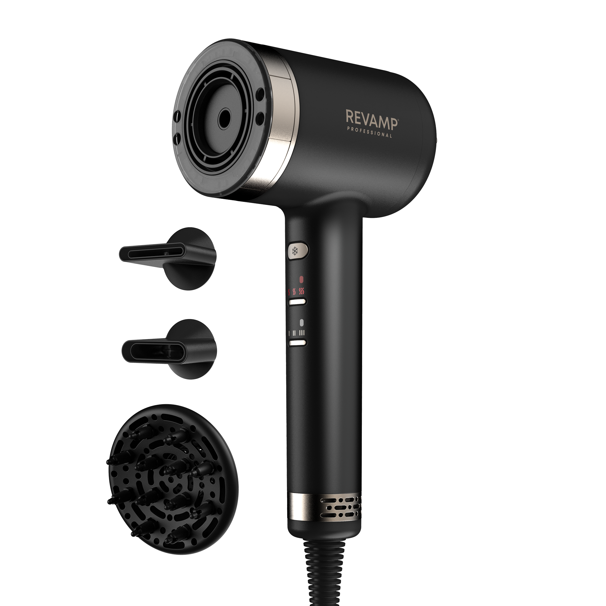 EAN Code : Individual Retail Pack 5010777165715 Product Width (cm) 10.5 Product Depth (cm) 14 Product Height (cm) 29.2 Outer Carton Weight (kg) 11 Outer Carton Width (cm) 54 Outer Carton Depth (cm) 33 Outer Carton Height (cm) 40 MAINS Power Mains Main Battery Quantity 0 Retail Product Title REVAMP Tri-Care Infrared Ionic Hair Dryer Short Retail Product Title (60) REVAMP Tri-Care Infrared Ionic Hair Dryer Short Description The ultimate upgrade to your hair care routine. The Tri-Care Hair Dryer takes your blow-dry to the next level using Infrared, Red & Blue light technology to care for your hair. Working in harmony with the digital intelligent motor, drying your hair without the need for excessive heat, enhancing shine and scalp comfort. Including 3 One-Click magnetic styling attachments that connect effortlessly and securely. This dryer comes with ionic anti-frizz technology, and for the ultimate finishing touch, is infused with our signature Progloss™ Super Smooth Oils, leaving your hair visibly smooth and shiny. Long Description Discover the next generation of drying with the REVAMP Tri-Care Infrared Ionic Hair Dryer. Using Infrared, Red, and Blue light technology with an air speed of 175 km/h, experience an advanced combination of ultra-fast drying and styling without the need for excessive heat, with holistic care for your hair and scalp. TRI-CARE TECHNOLOGY Our blend of Infrared, Red and Blue Light technology works in harmony with the digital intelligent motor to dry your hair with kind heat and intense speed, while enhancing shine and scalp comfort. More than just a tool to dry your hair, our infrared ionic hair dryer is a customised, soothing experience for your hair and scalp. ONE-CLICK MAGNETIC ATTACHMENTS Engineered for ease, this hair dryer includes 3 One-Click magnetic styling attachments that connect effortlessly and securely - no twisting or pushing required. 1 x curl diffuser to enhance and define natural curls 1 x wide dual-layered precision concentrator for ultra-fast drying 1x slim dual-layered precision concentrator for precise, customised styling PROGLOSS™ SUPER SMOOTH OILS To ensure your hair is full of lustre and life, all products in the REVAMP haircare range are infused with our signature Progloss™ Super Smooth Oils, including Keratin, Argan, and Coconut oil. This unique combination cares for the hair, leaving it visibly smooth and shiny. KINDER STYLING Redefine your styling experience with intelligent, ultra-powerful airflow and custom settings tailored to your hair. Featuring 4 heat settings, 3 speed settings, and a cold shot, our Infrared Hair Dryer is suitable for all hair types. With dual positive and negative ionic anti-frizz technology- up to 175 million /cm coverage ensures ultimate frizz-free results and enhanced shine. LIGHTWEIGHT & EFFICIENT Our Infrared Hair Dryer requires less energy (1600W) due to the intense drying air speed. Good for your hair, and better for the planet. You’ll also love how lightweight it feels in your hand, how quiet it is and the compact size for easy, flexible styling. Includes a 3m salon cable. Feature 1 Digital Intelligent motor with Infrared, Red and Blue light technology for enhanced shine and scalp comfort Feature 2 Digital motor (1600W) operates at up to 110,000 rpm and up to 175km/hour air speed for fast drying and kind styling without the need of excessive heat Feature 3 4 ionic jets combining positive and negative ions – up to 175 million /cm3 coverage for ultimate frizz-free results and enhanced shine Feature 4 3 Magnetic styling attachments: 1 x curl diffuser, 1x wide concentrator and 1x slim concentrator Feature 5 4 heat and 3 speed settings Feature 6 Compact & Lightweight Feature 7 Every product in the REVAMP haircare range is infused with Progloss™ Super Smooth Oils - enriched with Keratin, Argan, and Coconut oils for ultimate smoothness, enhanced shine, and frizz-free results. Feature 8 Easy clean dual filtration micro-filter system for optimum motor performance Feature 9 3m salon cable