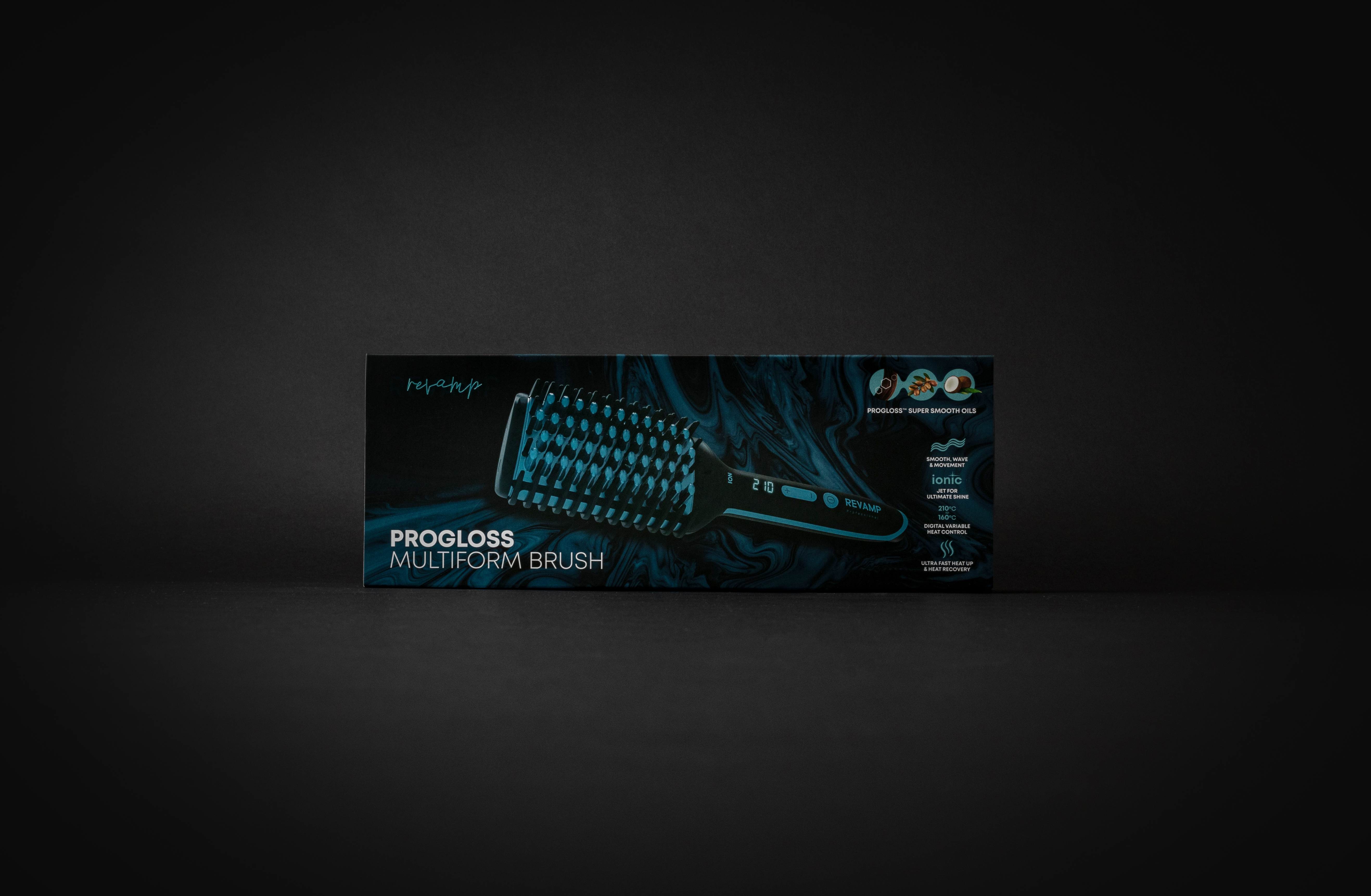 Retail Product Title Revamp Progloss Multiform Hot Styling Brush Short Retail Product Title (60) Revamp Progloss Multiform Hot Styling Brush Short Description Perfect for smooth, straight hairstyles with gloss and shine, the Revamp Progloss™ Multiform Brush is an essential tool for your hairstyling kit. Featuring a combination of ceramic heated bristles and longer cool plastic bristles for excellent gliding movement and maximum control. With unique curved edges to create natural movement. CERAMIC BRISTYLES & UNIQUE CURVED SIDES - Simply brush your hair to tame the frizz. Using Ionic Jet Technology in the ceramic bristles that heat up, this brush will ensure a sleek and smooth finish. Style large sections of hair with control and precision. Long Description Perfect for getting naturally smooth, straight hairstyles with gloss and shine, the Revamp Progloss Multiform Brush is an essential tool for your hairstyling kit. CERAMIC BRISTLES AND CURVED EDGES The ceramic bristles combined with the ionic jet technology, allow you to brush throuh your hair for quick and simple styling. With its unique hot curved sides, the Progloss Multiform Brush smoothens hair and creates waves and movement that hold all day long. ADJUSTABLE TEMPERATURE SETTINGS With a digital variable heat settings, ranging from 160ºC to 210ºC, you can be sure to style your hair in no time. The ultra-fast Pro PTC heater enables a faster heating speed and long-lasting effects. SMOOTH HAIRSTYLES WITH MOVEMENT Perfect for getting naturally smooth, straight hairstyles with gloss and shine, the Revamp Progloss Multiform Brush is an essential tool for your hairstyling kit. EASY TO USE This brush comes with a temperature lock and an auto-off feature that shut the device after 60 minutes of non-use. Designed with additional convenient features including a 3m long swivel cable and equipped with a Silicone heat-resistant mat. Feature 1 Smooth, wave and movement - Unique hot curved sides with heat protect outer combs Feature 2 Ionic smoothing jet - For smoothness and shine Feature 3 Progloss™ super smooth oils - Keratin, Argan and Coconut infused ceramic brush for ultimate smoothness Feature 4 Digital variable heat 210ºC -160ºC -ready to style in seconds Feature 5 Create a Myriad of styles - Perfect smoothness, movement and waves Feature 6 Ceramic bristles Feature 7 Ultra-fast Pro PTC heater - Fast heat-up and heat recovery Feature 8 Temperature lock Feature 9 Auto-off after 60 minutes