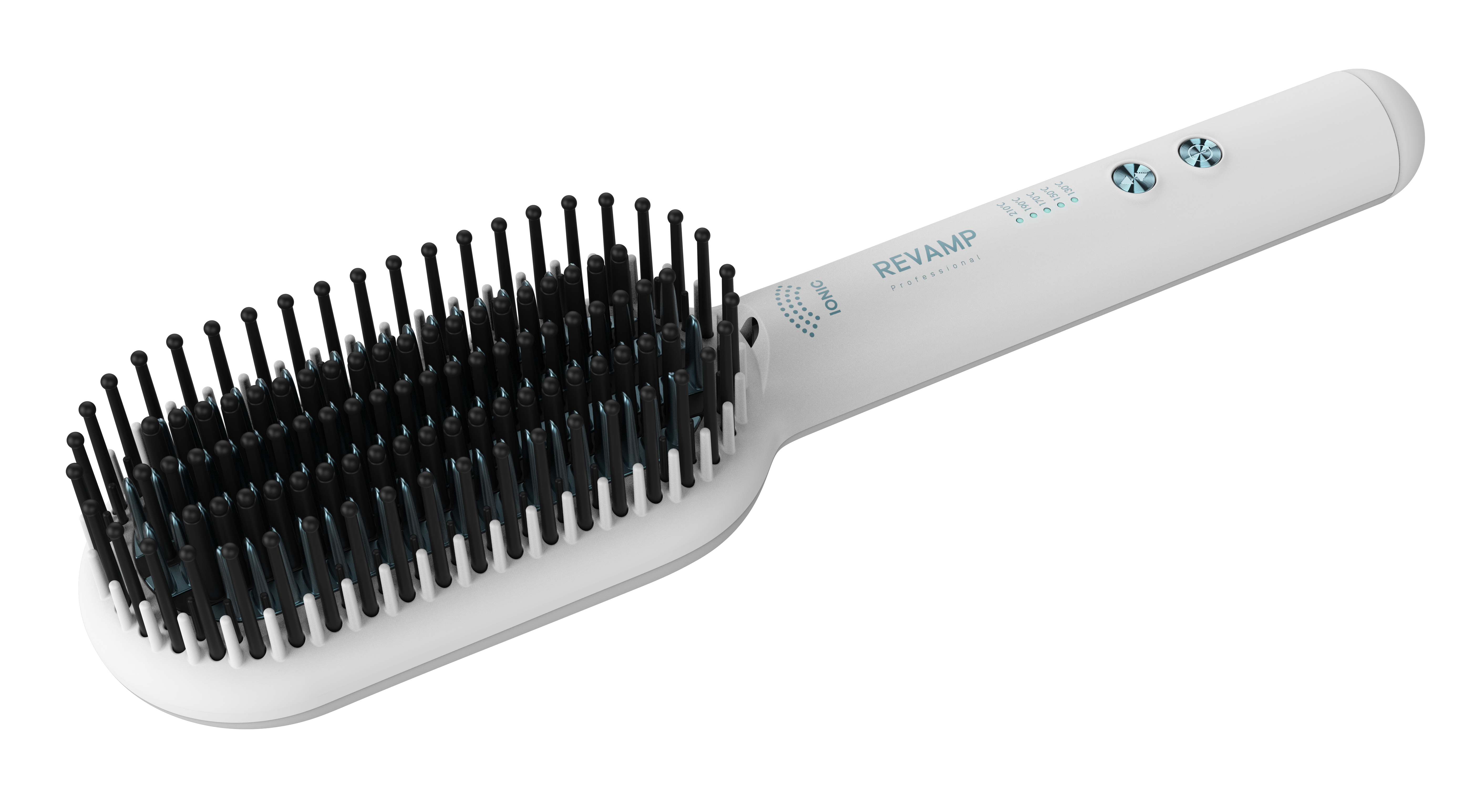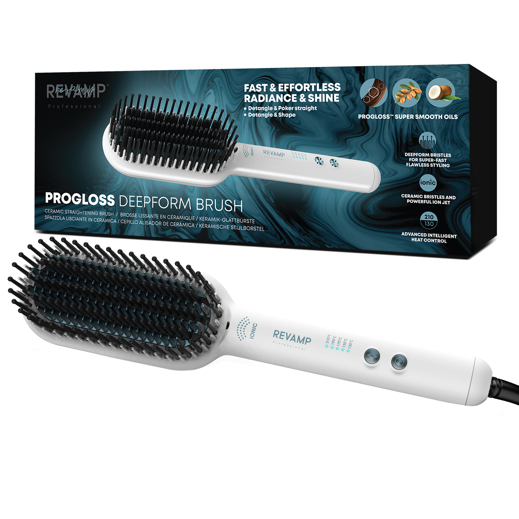 Retail Product Title Deepform Ceramic Straightening Hot Brush - White Short Retail Product Title (60) Deepform Ceramic Straightening Hot Brush - White Short Description The REVAMP Deepform Ceramic Straightening Hot Brush features extra-long bristles that allow for large sections of hair to be styled at once. The ionic and ceramic bristles are infused with Progloss™ super smooth oils, a blend of Keratin, Argan and Coconut oils that will leave the hair smooth with a glossy finish. The combination of hot and cold bristles allows to safely get close to the scalp for maximum root lift while creating straight, wavy or curly looks. Featuring adjustable temperature settings ranging from 130ºC to 210ºC. Silicone heat resistant mat included.