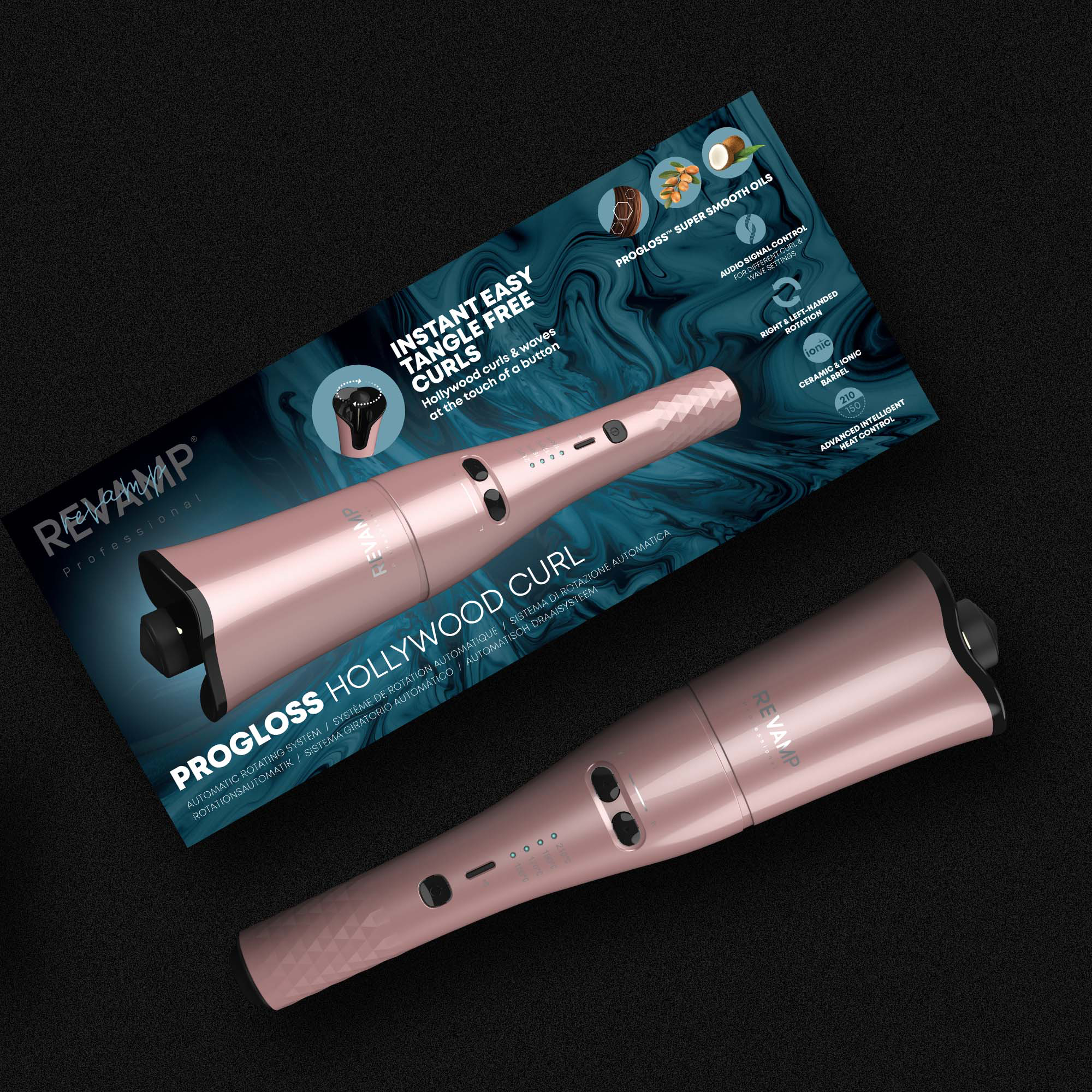 Retail Product Title Revamp Progloss Hollywood Curl Automatic Rotating Hair Curler Short Retail Product Title (60) Revamp Progloss Hollywood Automatic Hair Curler - Rose Gold Short Description Achieve Hollywood-worthy curls with the REVAMP Hollywood Curl Auto-Rotate Ceramic Curler. At the touch of a button, create tangle-free curls and waves with long-lasting results. The automatic rotating system makes styling effortless, with adjustable settings for loose or defined curls. Featuring variable temperature control ranging from 150°C to 210°C and a ceramic ionic barrel infused with our signature Progloss™ Super Smooth Oils, for smooth results with enhanced shine. Includes a silicone heat-resistant mat. Long Description Curl your hair with ease, using the Progloss Hollywood Curl Automatic Rotating Curler. At the touch of a button, you can create flawless curls and waves with long-lasting results. AUTOMATIC ROTATING SYSTEM The automatic rotating system takes the hassle out of styling your hair. Whether you prefer loose waves or defined curls, you can create a variety of hairstyles with the custom settings. Hair is automatically drawn into the curling chamber where it is gently heated to form beautiful curls and waves. To alternate the direction of your curls, simply select left or right rotation buttons. CUSTOM TEMPERATURE SETTINGS Featuring ultra-fast variable temperature control, from 150°C to 210°C for different hair types and textures. Simply select your styling temperature and the direction of rotation, and you're all set. CREATE A VARIETY OF HAIRSTYLES The hairstyles that are created are dependent on the time you leave your hair within the curling barrel. To give a clear indication of how long your hair has been heated, this hair styling tool features audible beeps. PRECISE STYLING WITH ENHANCED SHINE Whether you prefer Hollywood curls or soft waves, this styling tool will always ensure hairstyles that shine. This unique hair curler is infused with our unique combination of Progloss super smooth oils, including Keratin, Argan Oil and Coconut Oil. Feature 1 Automatic rotating system for easy, tangle-free Hollywood curls at the touch of a button Feature 2 Ultra-fast variable heat from 150ºC - 210ºC - for different hair types – ready to style in seconds Feature 3 Achieve different style curls and waves - audible beep for looser or tighter curls Feature 4 Right and left handed rotation for easy styling on each side of the head Feature 5 Progloss™ super smooth oils keratin, argan and coconut-infused ceramic plates and barrel for ultimate smoothness Feature 6 Ceramic and ionic barrel for frizz-free, smooth hair with less static Feature 7 Ultra-fast heat up and heat recovery Feature 8 Advanced intelligent heat that continuously regulates the temperature for minimum hair damage Feature 9 3-year guarantee