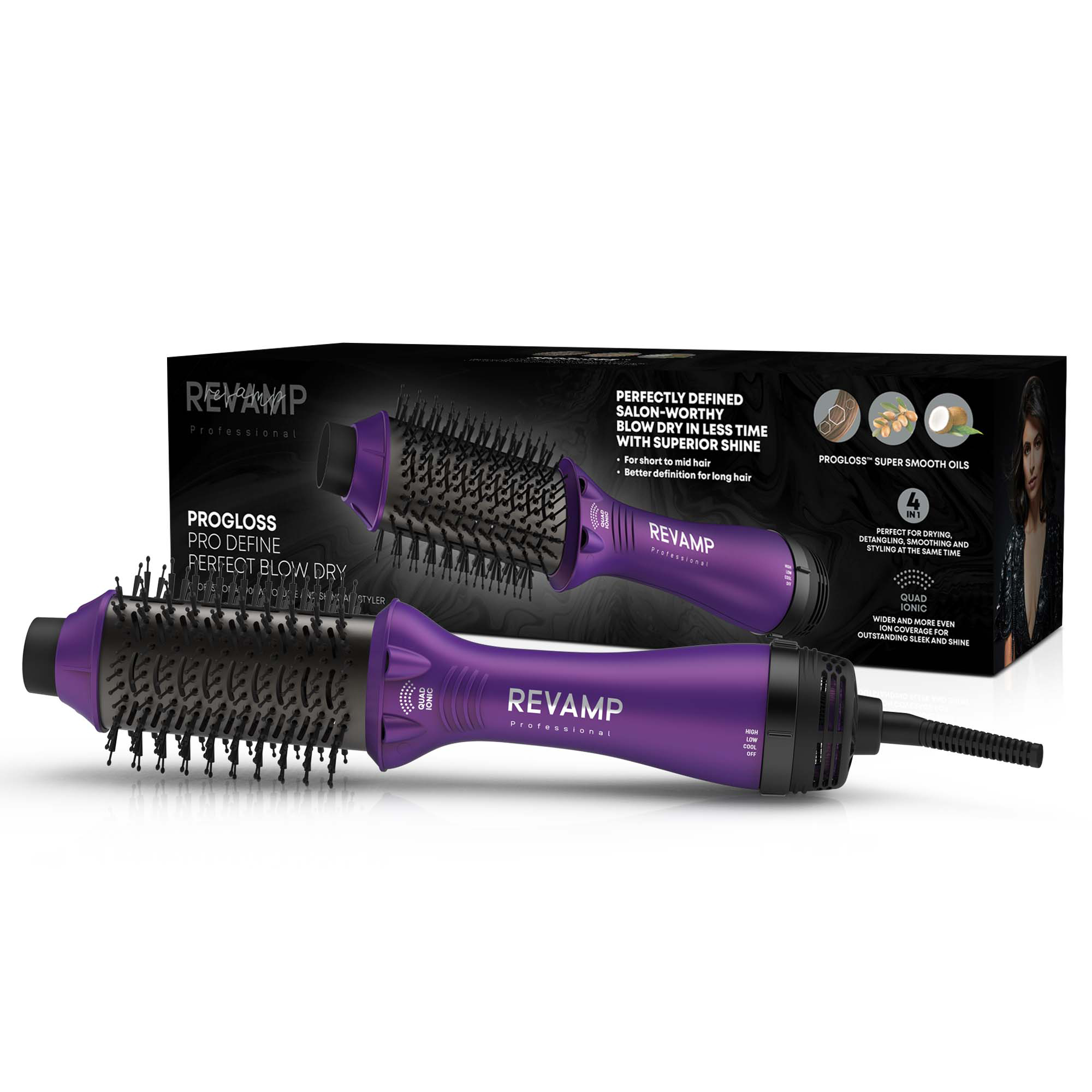 Retail Product Title Revamp Progloss Pro Define Perfect Blow Dry Volume & Shine Air Styler - Purple Short Retail Product Title (60) Revamp Progloss Pro Define Perfect Blow Dry Air Styler - Purple Short Description Give your hair an extra boost of volume whilst also drying your hair with the Revamp Progloss Pro Define Perfect Blow Dry Volume Air Styler. This time-saving styling tool will dry, detangle, and smooth your hair in just one pass. Designed with an oval barrel suited to style short and medium hair lengths, whilst adding enhanced definition for longer hair lengths. The rounded edges add volume at the root, whilst the bristles glide through the hair to help you create a salon-quality blow-dry at home. Choose from 3 adjustable Heat/Speed Settings, including a Cool option to set your hairstyles in place. The lightweight design, combined with the rotating cool tip and 3m salon swivel cable allow for comfortable styling, with additional flexibility. Infused with Progloss super smooth oils for an additional boost of shine. Long Description Creating a bouncy blow-dry is effortless with the Revamp Pro Define Perfect Blow Dry Volume Air Styler. There is no need to struggle with a round brush and a hair dryer when you can combine them with one easy-to-use air styler. DRY, DETANGLE AND TURN UP THE VOLUME Powerful drying and precise styling are combined with this multifunctional styling tool. Designed with a 37 x 58mm oval barrel to suit short to medium hair lengths. The rounded edges allow you to add volume, to create a glamourous look full of body and bounce, whilst the flexible bristles of the brush work to detangle hair, for a silky-smooth finish. CERAMIC & IONIC TECHNOLOGY Built with a combination of ceramic and ionic technology. This powerful air styler features a quad ionic system, to produce a powerful airflow, for faster drying and smoother styling. The specific design of the apertures within the ceramic barrel ensures heat is applied evenly to help reduce frizz and flyaways. CUSTOM HEAT AND SPEED SETTINGS Customise your styling experience with 3 adjustable heat/speed settings to suit different hair types and textures. • Cool – the airflow is powerful and cool • Low – the airflow is low and warm • High– the airflow is powerful and hot Use the cool setting to set your hair in place and ensure long-lasting hairstyles. FLEXIBLE STYLING The light-weight design, combined with a 3m salon swivel cable and rotating cool tip, ensure comfort and flexibility as you style. You can also use the styler as a traditional brush to glide through the hair for a smooth finish. ENHANCED SHINE The ceramic barrel is infused with our unique combination of Progloss™ super smooth oils – including Keratin, Argan Oil and Coconut Oil to create hairstyles with stunning shine. Feature 1 900W dry, smooth, detangle and volume air styler with unique quad ionising system for salon-worthy results Feature 2 Smaller barrel makes it perfect for use on short to mid length hair. When used on longer hair, it will give enhanced definition Feature 3 4-in-1 Multifunctional styler with combo of flexible and supple bristles -Perfect for drying, detangling, smoothing and styling at the same time Feature 4 Ceramic barrel and Super shine 4 ionic jet emitters offers greater ION hair coverage for smooth, shiny and frizz-free results with volume at the roots Feature 5 Lightweight and Functional design for ease of use and extra comfort while styling Feature 6 Progloss™ super smooth oils Keratin, Argan and Coconut infused ceramic barrel for ultimate smoothness Feature 7 Rotating cool tip gives you extra comfort while styling your hair Feature 8 3 heat / speed settings (High, Low, Cool) offer precise heat styling for all hair types Feature 9 Suitable for use on wet and dry hair