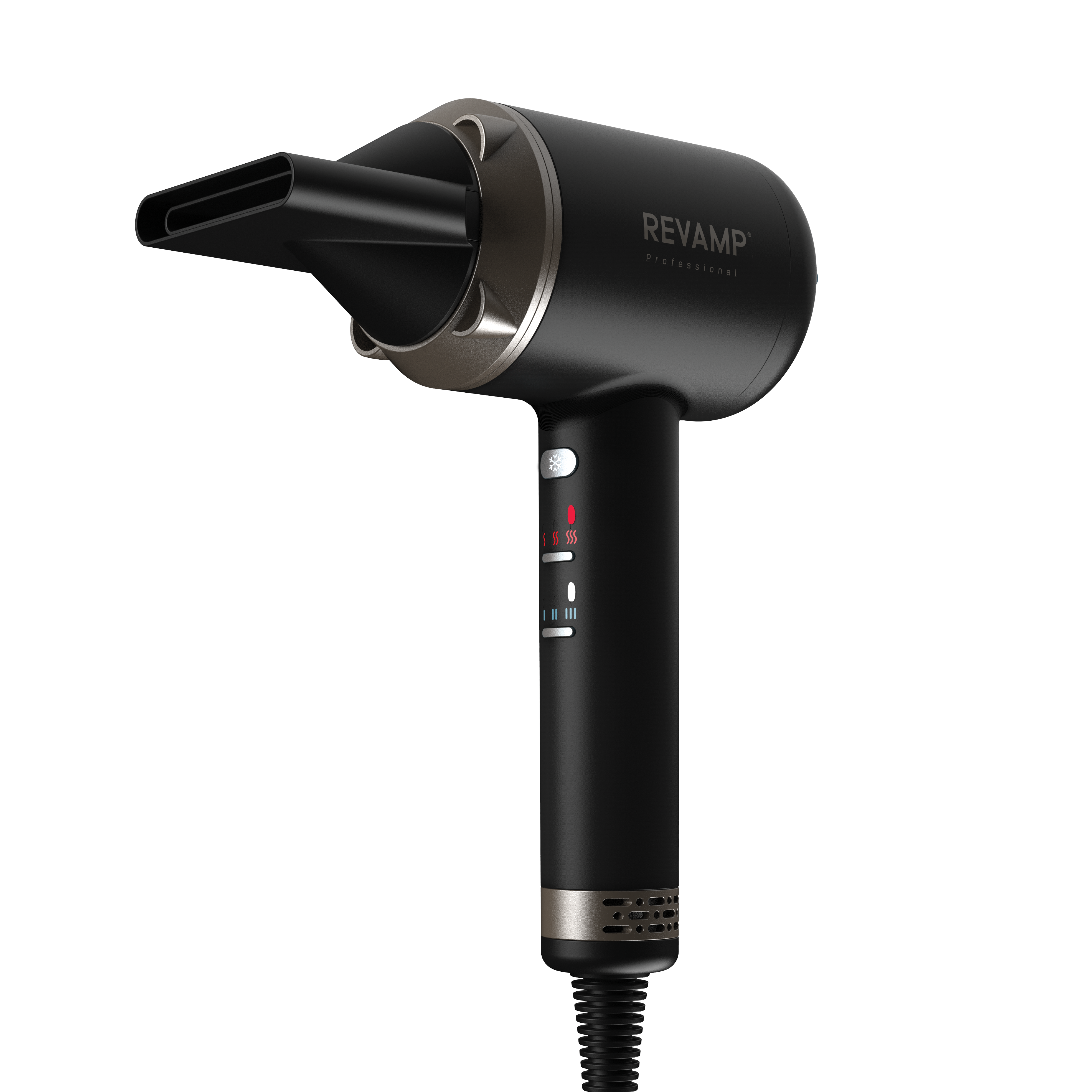 Retail Product Title Enigma PRECISION Hair Dryer Short Retail Product Title (60) Enigma PRECISION Hair Dryer Short Description The Revamp Enigma PRECISION Hair Dryer has a digital intelligent brushless motor that operates at up to 110,000rpm. Practical and powerful, it generates an air speed of up to 175km per hour for fast drying. The quad ionic system releases up to 170 million positive and negative ions per cm³ for added conditioning. Infused with Progloss™ oils (keratin, argan and coconut), the front grille promises softness and shine. With 3 speeds, 4 heat settings and 4 magnetic attachments for versatile styling, this dryer works for every hair type. Long Description Digital intelligent brushless motor for ultra-fast drying Built with a powerful, digital intelligent brushless motor that operates at up to 110,000 revolutions per minute, this hair dryer is both practical and powerful. Generating an air speed of up to 175km per hour, it promises a high-intensity airflow that requires less energy consumption* for fast and efficient drying. Quad ionic conditioning system for healthier looking hair This hair dryer's quad ionic conditioning system releases up to 170 million positive and negative ions per cm³, enveloping your hair in a cloud of little protectors. Keeping static and frizz at bay, these ions promote healthier-looking hair, as well as enhanced shine and smoothness. Variable heat settings and speed settings for all hair types Designed for every hair type, the Enigma PRECISION Hair Dryer has four heat settings and three speed settings to choose from (including a super cool shot for setting that style in place) so you can customise your experience to suit you and your hair. Four styling magnetic attachments Now, for our favourite part. This hair dryer comes with not one, not two – but four magnetic styling attachments. Why? We’re glad you asked. The flyaway 360° attachment tames unruly strands and creates sleek, polished styles without the static. The fast dry & lift booster raises each individual hair from the root for instant volume and separates them for faster drying, while the super-slim precision concentrator offers a more targeted airflow for precision styling. Finally, the curl diffuser attachment gently diffuses airflow to enhance natural curls and waves. Progloss™ oils for a soft and sleek finish In true Revamp style, this dryer’s front grille is infused with Progloss™ super smooth keratin, argan and coconut oils to keep that shine where it should be. Dual filtration micro-filter system The Enigma PRECISION Hair Dryer features an easy-clean, dual filtration micro-filter system which captures particles and prevents a build-up of debris to encourage a cleaner airflow – all while ensuring ultimate hair dryer performance and overall lifespan. Lower noise level Thanks to its innovative design, this hair dryer is a quiet one - allowing for a more peaceful and enjoyable styling experience. Compact and lightweight design Lightweight and ergonomic, this hair dryer makes for the ultimate haircare companion. 3-metre salon cable With a 3-metre salon cable and weighing 460g this hair dryer makes your styling session an easier, more enjoyable one. *Compared to DR-5500 AC Hair Dryer. Box includes • 1 x Enigma PRECISION hair dryer • 1 x Flyaway 360° attachment • 1 x Fast dry & lift booster • 1 x Super-slim precision concentrator • 1 x Curl diffuser Suitable for All hair types Feature 1 Professional, long-life digital intelligent brushless motor (up to 110,000 rpm) Feature 2 Up to 175km per hour air speed for intense air volume and lower noise levels Feature 3 Quad ionic conditioning system (releases up to 170 million positive and negative ions per cm³) Feature 4 Infused with Progloss™ super smooth keratin, argan and coconut oils Feature 5 4 heat settings and 3 speed settings including cold shot Feature 6 4 magnetic styling attachments (flyaway 360° attachment; fast dry & lift booster, super-slim precision concentrator and curl diffuser) Feature 7 Ultra-fine 2-stage filter for longer motor life Feature 8 Compact and lightweight design Feature 9 Suitable for all hair types