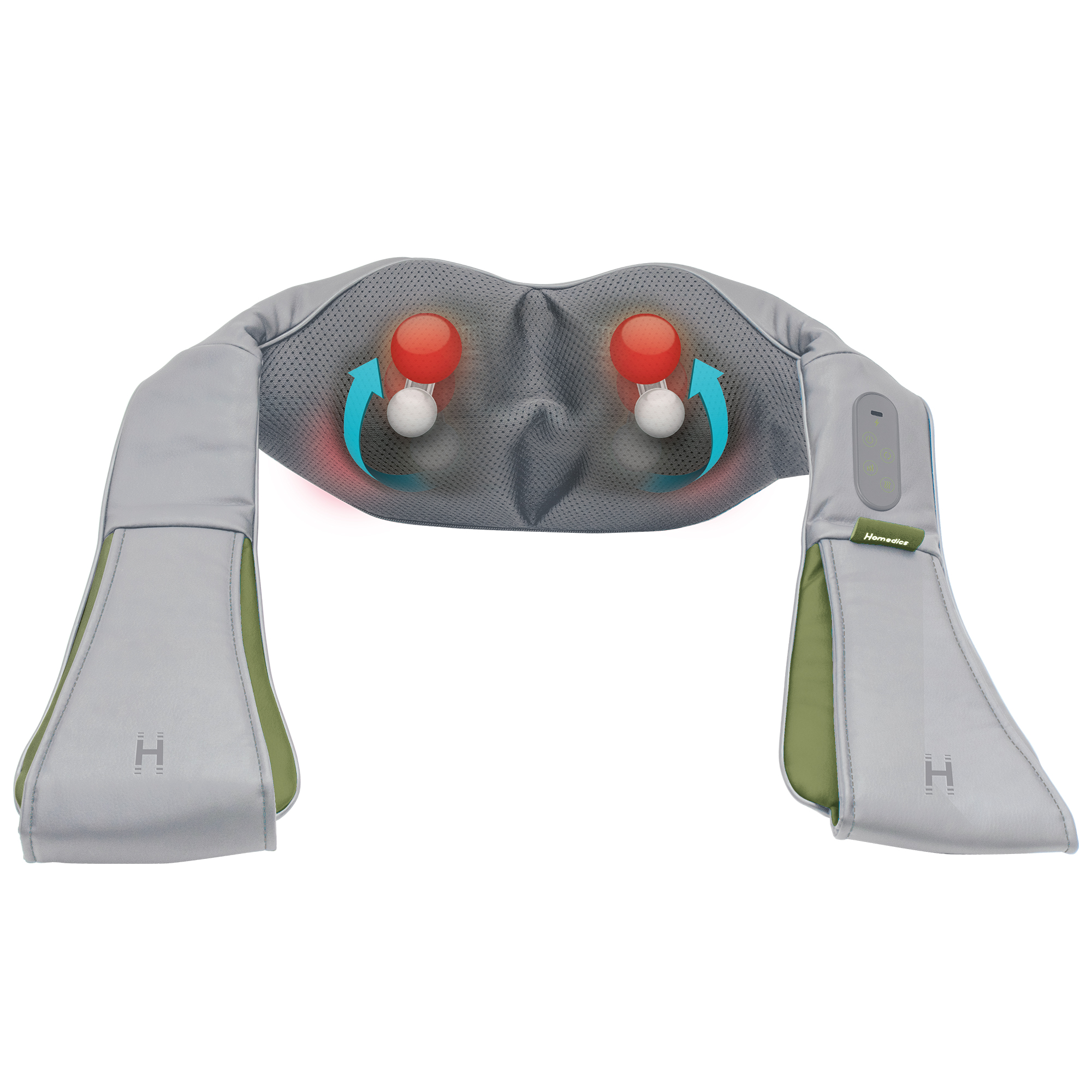 Retail Product Title Homedics Shiatsu Neck & Shoulder Massager + Heat Short Retail Product Title (60) Homedics Shiatsu Neck & Shoulder Massager + Heat Short Description Immerse yourself in a deep relaxation experience wherever you might be with the shiatsu neck & shoulder massager + heat. Designed to mimic the movement, pressure and feel of a traditional shiatsu massage, this massager offers three speed settings and features four nodes with clockwise and anti-clockwise rotation. Features an embedded touch control panel, convenient straps for positioning and a soothing heat option. USB-C rechargeable for on-the-go use. Long Description Shiatsu Massage Experience rest and relaxation at home by way of an innovative massager designed to mimic the traditional Shiatsu technique. Knead for Speed Enjoy a tailored massage thanks to both clockwise and anti-clockwise rotating nodes that offer three different speeds. Helpful Heat Let the deep heat setting soothe stiff necks and sore shoulders by stimulating blood flow within the muscle tissue – and in turn, speed up recovery and enhance relaxation. Immerse yourself in a deep relaxation experience wherever you might be with the shiatsu neck & shoulder massager + heat. Designed to mimic the movement, pressure and feel of a traditional shiatsu massage, this massager offers three speed settings and features four nodes with clockwise and anti-clockwise rotation. Looking for even deeper relaxation? Activate the soothing heat feature. By stimulating blood flow deep within the muscle tissue, the delivery of heat encourages recovery and enhances feelings of relaxation. With an embedded touch control panel within easy reach and convenient straps for positioning, this heated neck and shoulder massager promises comfort even before it’s switched on. Ideal for use on-the-go, this massager is USB-C rechargeable – so you can enjoy over an hour* of downtime wherever you are. *Homedics recommends this product be used for no more than 15 minutes at a time.