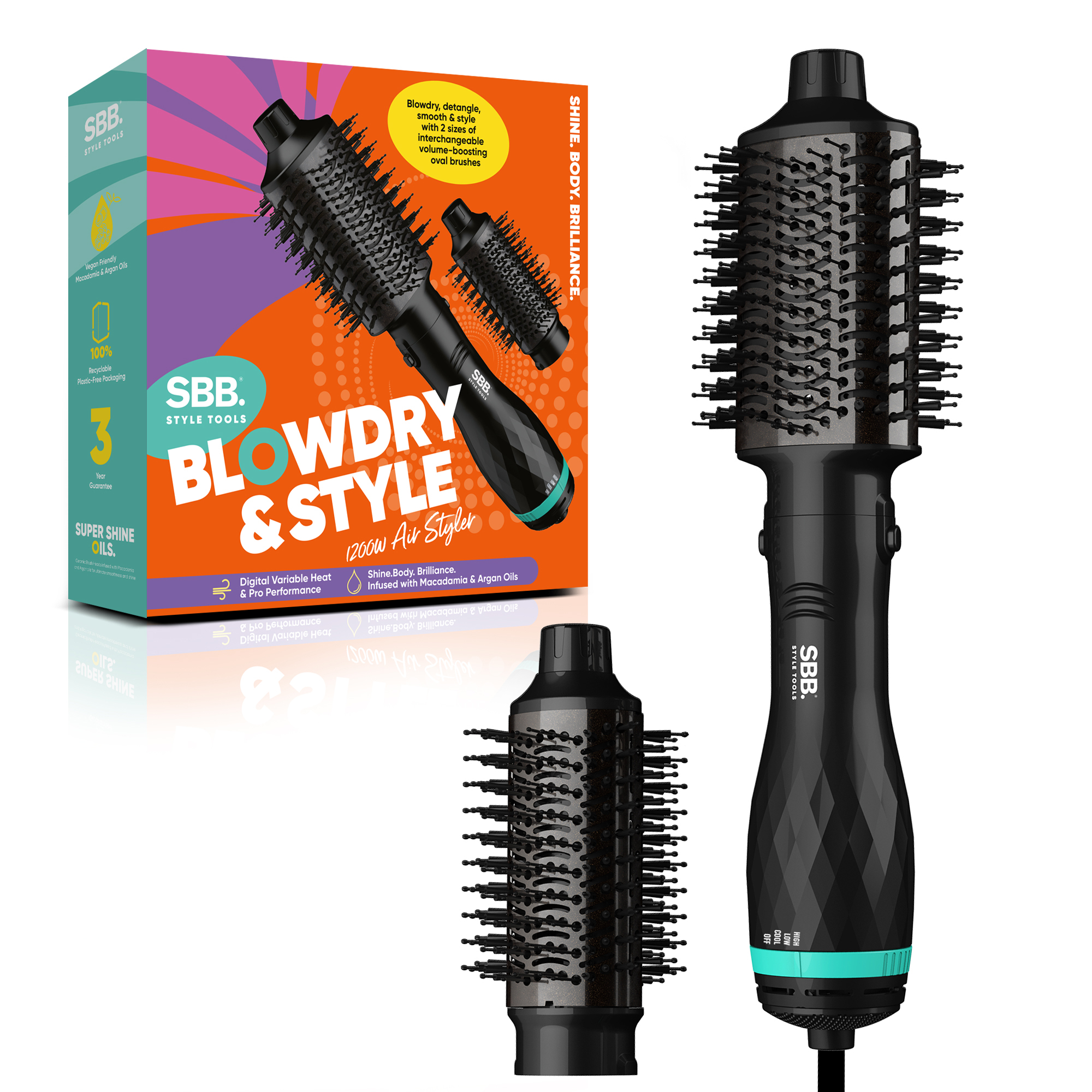 Retail Product Title SBB Dry & Style 1200w Air Styler Short Retail Product Title (60) SBB Dry & Style 1200w Air Styler Short Description Dry, detangle, smooth and style your hair quickly and easily with the SBB Blowdry & Style 2-in-1 hot brush styler. This air styler comes with two interchangeable brush heads – a large oval head (73 x 47mm) for a voluminous big blow dry finish, and a medium-sized oval head (56 x 39mm) for volume, precision styling and definition. The ceramic barrels are infused with super shine oils (a blend of macadamia and argan) to give your hair a radiant glow. Features three heat and speed settings, flexible bristles and a 2-metre swivel cable. Long Description What does it do? Honestly? A lot. This 4-in-1 air styler dries, detangles, smooths and styles your hair with ease. Who is it for? Everyone! This all-in-one wonder is suitable for every hair type. Why you’ll love it It’s easy to use, quick-drying and leaves a shine to be reckoned with. Discover a whole new way to dry, detangle, smooth and style your hair with the Dry & Style 1200w Air Styler. A multifunctional must-have, this air styler comes with two interchangeable oval brush heads – a large airbrush for a big blow dry finish, and a medium-sized airbrush for volume, precision styling and definition. Infused with super shine oils (a blend of macadamia and argan oils), the ceramic barrel will leave your hair with both shape and shine, so you can enjoy a reflective, radiant glow. Its ergonomic, lightweight design means it’s easy to hold and straightforward to use – so you can say goodbye to arm ache and awkward angles. With three heat and speed settings, hybrid flexible and supple bristles and a 2-metre swivel cable, the Dry & Style 1200w Air Styler offers the performance of a hair dryer and the simplicity of a hot brush to give you the ultimate at-home hair experience. The Dry & Style 1200w Air Styler is an all-in-one styling solution that leaves your hair soft and smooth with an undeniable shine. Remember to: • Towel or air dry your hair before use so it’s damp, not wet • Use heat protection spray • Divide your hair into sections while styling • Run some finishing serum through your lengths for an even longer-lasting shine The spec bit: • Big brush head: 73mm x 47mm • Small brush head: 56mm x 39mm Feature 1 1200w 4-in-1 multifunctional air styler Feature 2 2 interchangeable oval brush heads (large head: 73 x 47mm; medium-sized head: 56mm x 39mm) Feature 3 Hybrid flexible and supple bristles for optimum styling performance Feature 4 3 heat/speed settings Feature 5 Ceramic barrel infused with macadamia and argan super shine oils Feature 6 Suitable for all hair types Feature 7 2-metre swivel cable Feature 8 Weight: 440g Feature 9 3-year guarantee