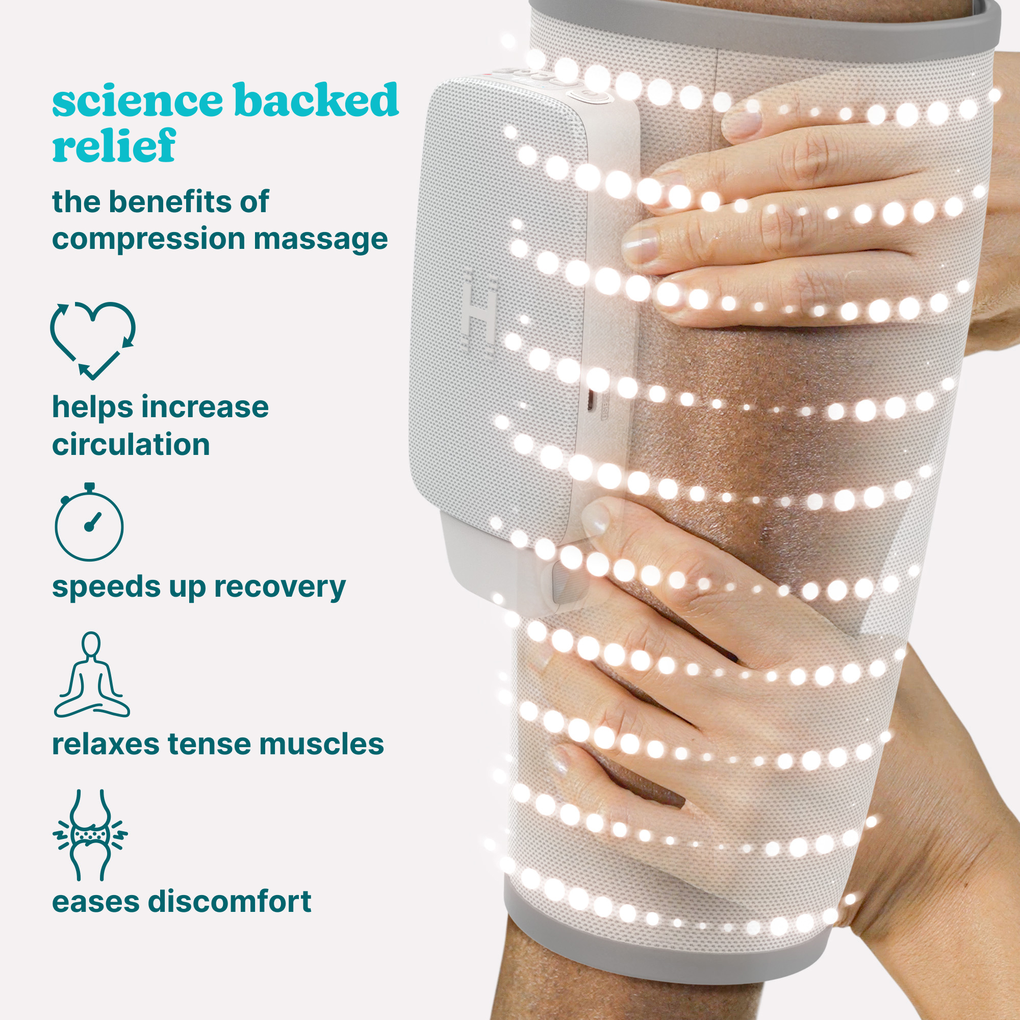 Retail Product Title Homedics Calf Compression Recovery Sleeve Short Retail Product Title (60) Homedics Calf Compression Recovery Sleeve Short Description Speed up your post-workout recovery with the Homedics Calf Compression Recovery Sleeve. Sore calves putting the brakes on your training plan? Designed to fit seamlessly into your active lifestyle, this air-powered calf support helps promote faster recovery from intense activity or injury. Air compression massage has been proven to help reduce swelling, ease inflammation, improve circulation, reduce muscle tension, enhance flexibility, encourage feelings of relaxation, and speed up recovery. This clever, cordless calf sleeve delivers an air compression massage by applying a gentle pulsating pressure to kickstart your body’s natural repair process – so you can spend less time recovering and more time training. Choose from 4 air compression programmes, 5 intensity settings, and 3 levels of soothing heat with the universal controller (included in your bundle) for deep, targeted relief tailored to your body. Ready to take your sports recovery to the next level? Long Description Speed up your post-workout recovery with the Homedics Calf Compression Recovery Sleeve. Designed to fit seamlessly into your active lifestyle, this air-powered calf support helps to promote faster recovery from intense activity or injury. Performed by sports massage therapists, air compression massage has been proven to help reduce swelling, ease inflammation, improve circulation, reduce muscle tension, enhance flexibility, encourage feelings of relaxation, and speed up recovery. This clever, cordless calf sleeve delivers an air compression massage by applying a gentle pulsating pressure, helping to kickstart your body’s natural repair process so you can spend less time recovering and more time training. Choose from 4 air compression programmes, 5 intensity settings, and 3 levels of soothing heat with the universal controller (included in your bundle). Featuring soft-touch fabric with a flexible, adaptive fit for comfortable wear and calf support. Take your sports recovery to the next level. Feature 1 Wireless, portable, and whisper-quiet to work around your schedule Feature 2 5 intensity levels and 4 air compression massage programmes Feature 3 3 heat settings and 2 active compression zones Feature 4 Suitable for left and right calf - max circumference 50cm Feature 5 Powered by the universal controller (included in your bundle) Feature 6 3-year guarantee