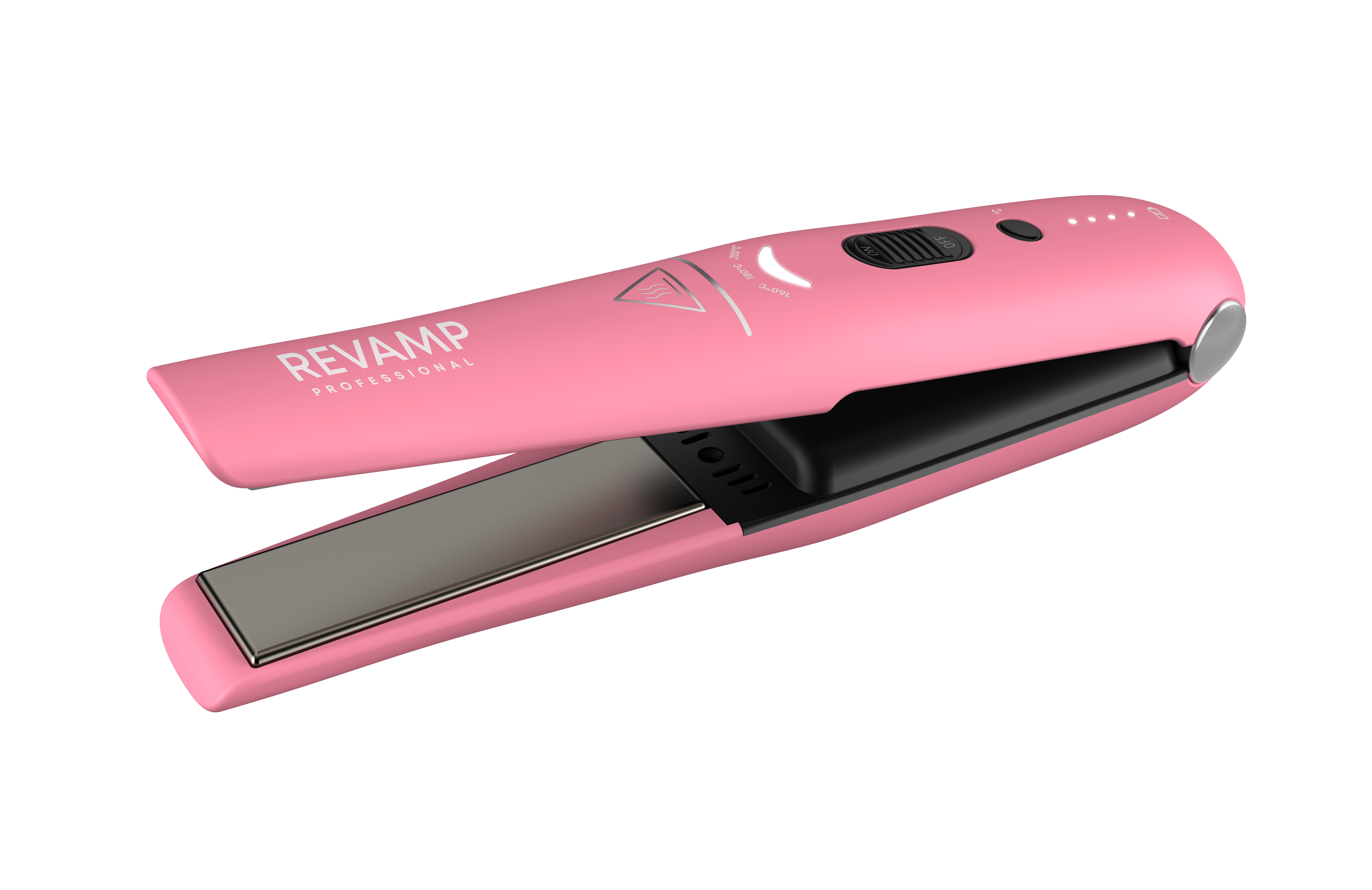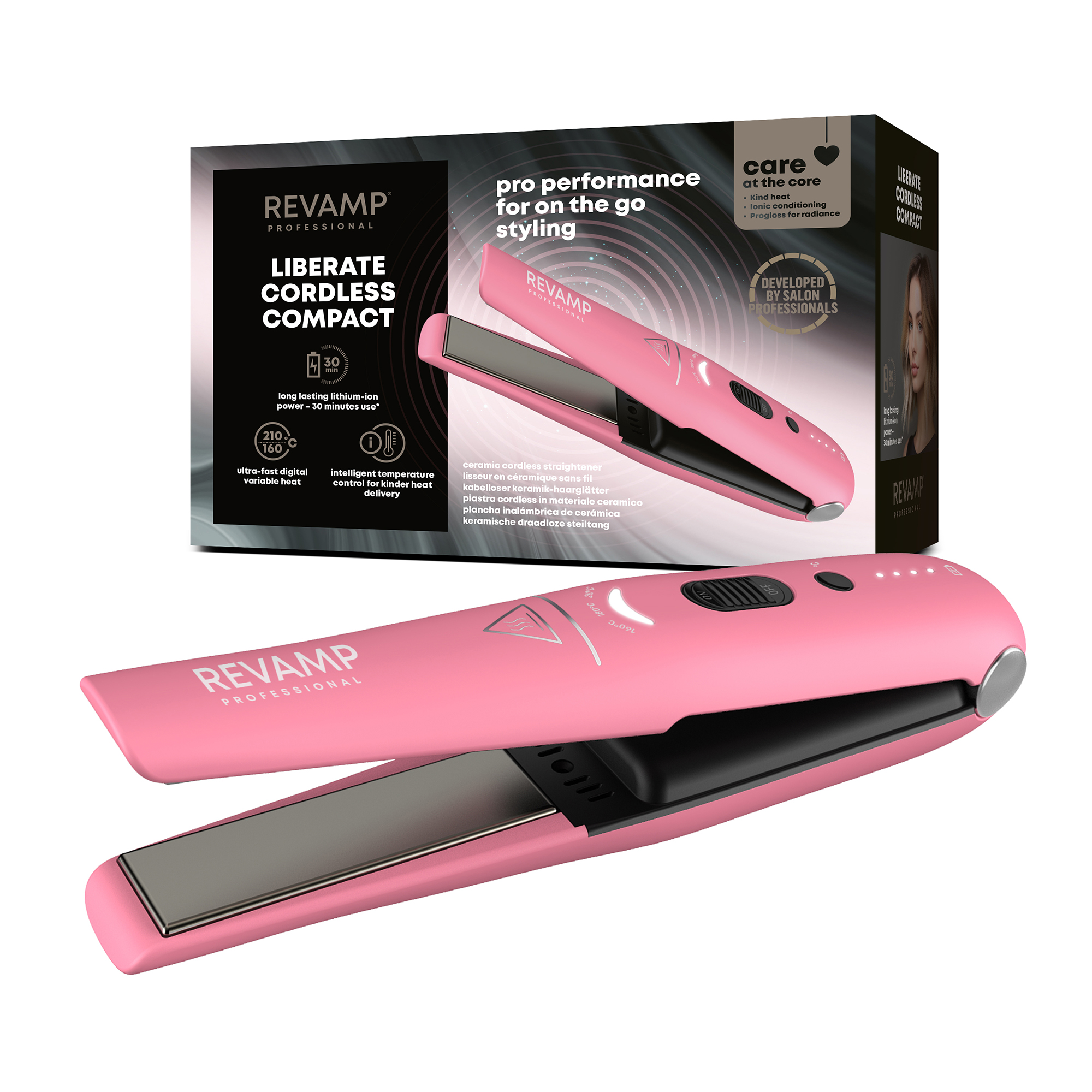 Retail Product Title REVAMP Liberate Cordless Compact Ceramic Hair Straightener Short Retail Product Title (60) REVAMP Liberate Cordless Compact Ceramic Hair Straightener Short Description Meet the REVAMP Liberate Cordless Compact Ceramic Hair Straightener. Designed with the performance of a corded model, cord-free, it offers ultra-fast heat-up and long-lasting results with portability in mind. Featuring ceramic and ionic floating plates infused with our signature Progloss™ Super Smooth Oils, it provides smooth results with enhanced shine. Choose from 3 adjustable heat settings (160ºC-210ºC) for styling on the go, suitable for all hair types. Includes a UK/EU interchangeable adaptor and heat-resistant travel pouch. Long Description Style without the hassle of cables with the REVAMP Liberate Cordless Compact Ceramic Hair Straightener. Compact and lightweight for pro styling on the go - cord-free. CORDLESS & RECHARGEABLE Enjoy the thermal performance of a corded straightener, cord-free. Powered by the latest lithium-ion technology to deliver up to 30 minutes of consistent styling. The intelligent battery life system will indicate the level of charge, so you’ll know when your portable straightener needs recharging. CREATE A VARIETY OF HAIRSTYLES Whether you’re creating straight styles, waves or curls, the ceramic and ionic cushioned floating plates minimize split ends and effortlessly glide through your hair for super smooth results. PROGLOSS™ SUPER SMOOTH OILS To ensure your hair is full of lustre and life, all products in the REVAMP haircare range are infused with our signature Progloss™ Super Smooth Oils, including Keratin, Argan, and Coconut oil. This unique combination nourishes the hair for visibly smooth results with enhanced shine. CUSTOM TEMPERATURE SETTINGS This travel straightener features 3 adjustable temperature settings, ranging from 160°C to 210°C, so you can customise your styling experience whether you have fine, medium or thick hair. The ultra-fast pro MCH heat technology provides quick heat-up and heat recovery for one-stroke styling whenever, wherever you need it. Also featuring advanced intelligent heat control to regulate the temperature 100 times per second to minimize hair damage. TRAVEL WITH EASE With an ‘on the go’ travel lock, worldwide voltage, heat-resistant pouch, charging cable with UK/EU inter-changeable adaptor and compact design, you can easily pop this rechargeable straightener in your bag and touch up your style anytime, anywhere. Feature 1 Ultra-fast and long-lasting (30 mins use for a typical user) high performance cordless styler powered by latest lithium-ion technology Feature 2 Delivers the thermal performance of a corded straightener, cord-free Feature 3 Advanced intelligent heat control that regulates the temperature 100 times per second for minimum hair damage Feature 4 Ultra-fast digital heat - High 210ºC / Medium 180ºC / Low 160ºC Feature 5 Intelligent battery life system that indicates the level of charge - can be fully recharged in 3 hours Feature 6 "On the go" travel lock - Close the plates together and carry your straightener anywhere with you Feature 7 Every product in the REVAMP haircare range is infused with Progloss™ Super Smooth Oils - enriched with Keratin, Argan, and Coconut oils for ultimate smoothness, enhanced shine, and frizz-free results Feature 8 Ceramic and ionic cushioned floating plates – minimizes split ends Feature 9 Charging cable with UK/EU inter-changeable adaptor