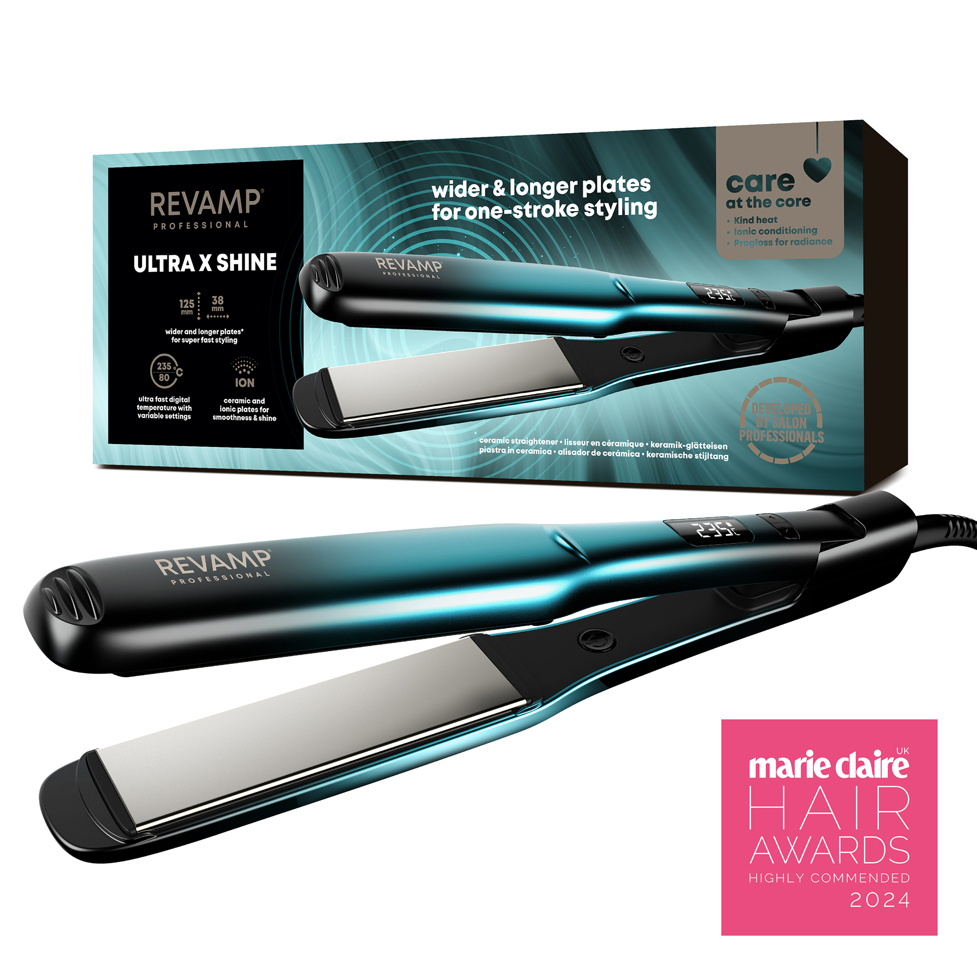 Retail Product Title REVAMP Wide Ultra X Shine Ceramic Hair Straightener Short Retail Product Title (60) REVAMP Wide Ultra X Shine Ceramic Hair Straightener Short Description Save time and create stunning hairstyles with the REVAMP Wide Ultra X Shine Ceramic Hair Straightener. The ceramic ionic cushioned floating plates are extra-long and wide to effortlessly create lasting, beautiful looks while styling larger sections of hair at once. Offering adjustable heat settings from 80ºC to 235ºC, you'll have complete styling control for all hair types. Infused with Progloss™ super smooth oils to ensure ultimate smooth results. Includes a 60 minute automatic shut-off, a temperature lock and a silicone heat-resistant mat. Long Description Searching for a wide plate straightener to tame thicker hair? Meet the REVAMP Wide Ultra X Shine Ceramic Hair Straightener. Featuring wider (38mm) and longer (125mm) plates, effortlessly create lasting, beautiful looks while styling larger sections of hair at one time. EXTRA LONG & LARGE CERAMIC PLATES When it comes to styling, sometimes you need something quick and easy for rushed mornings. We’ve kept this in mind with our extra-long (125mm) and wide (38mm) ceramic ionic cushioned floating plates helping you cover more of your hair in a shorter space of time. CUSTOM TEMPERATURE SETTINGS Featuring adjustable temperatures from 80ºC to 235ºC to ensure optimum styling for fine, medium and thick hair, as well as artificial extensions and wigs (using the lowest setting). Once you have selected your temperature, a lock will be set to ensure consistent styling. The Pro PTC heater ensures the ceramic plates heat up in seconds and heat is distributed evenly and quickly throughout the plates. Also, the advanced intelligent heat control regulates the temperature to minimize hair damage. CREATE STRAIGHT & CURLY HAIRSTYLES Create a range of styles, with frizz-free results in a matter of minutes - the contoured edges help you create flawless curls and waves, while the plates are positioned near the edge of the straightener to get close to the roots. PROGLOSS™ SUPER SMOOTH OILS To ensure your hair is full of lustre and life, all products in the REVAMP haircare range are infused with our signature Progloss™ Super Smooth Oils, including Keratin, Argan, and Coconut oil. This unique combination nourishes the hair for visibly smooth results with enhanced shine. QUICK & EASY STYLING To give you extra peace of mind, the straighteners will automatically shut off after 60 minutes, and with the 3m salon-swivel cable, you will have greater flexibility when it comes to styling your hair. A silicone heat-protection mat is also included for additional safety. Worldwide voltage for international use. Feature 1 Extra-long (125mm) and wide (38mm) plates for super-fast flawless styling - straighten, wave or curl more hair in larger sections at one time. Feature 2 Ultra-fast digital variable heat 80ºC to 235ºC - ready to style in seconds for long lasting, beautiful looks whatever your hair type, even artificial hair (using lowest setting) Feature 3 Pro PTC heat technology gives ultra-fast heat-up and heat recovery for one stroke styling. Feature 4 Advanced intelligent heat control that continuously regulates temperature for minimum hair damage Feature 5 Every product in the REVAMP haircare range is infused with Progloss™ Super Smooth Oils - enriched with Keratin, Argan, and Coconut oils for ultimate smoothness, enhanced shine, and frizz-free results Feature 6 Ceramic and ionic cushioned floating plates – minimizes split ends Feature 7 Temperature lock Feature 8 3m salon swivel cable Feature 9 Silicone heat-resistant mat