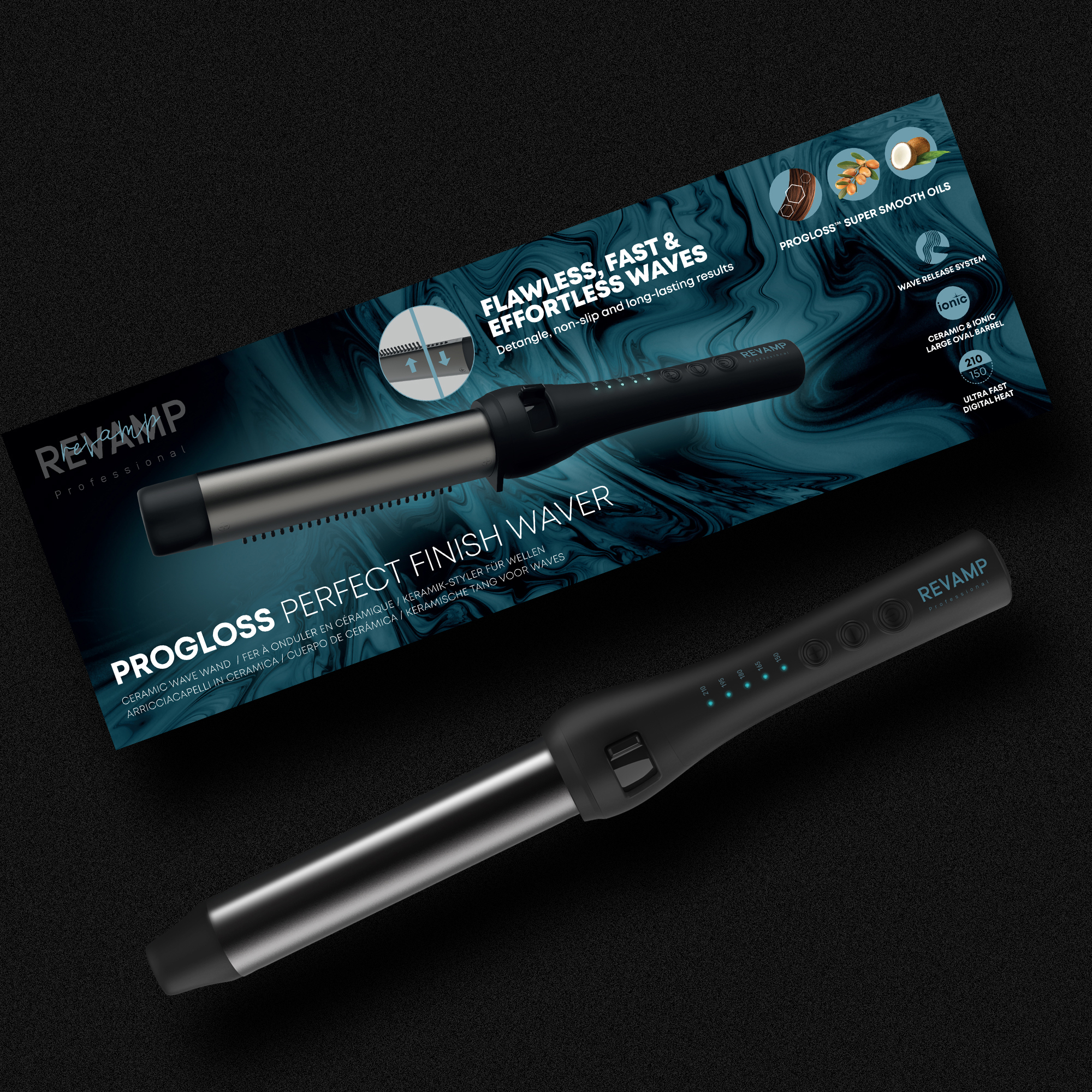 Retail Product Title Revamp Progloss Perfect Finish Hair Waver Short Retail Product Title (60) Revamp Progloss Perfect Finish Hair Waver Short Description If you want to create bouncy waves with ease, the Revamp Progloss Perfect Finish Waver is the ideal styling solution. Featuring retractable bristles for snag-free styling. The 32mm barrel combines ceramic and ionic technology for even styling, with our Progloss super smooth oils also infused for enhanced shine. Adjustable temperatures are available from 150°C to 210°C to suit different hair types. The cool tip provides a safe way for you to hold your hair in place, and the built-in stand allows you to place the wand down, without damaging surfaces. With a 3m salon swivel cable for flexible styling and automatic shut off after 72 minutes. Includes heat-resistant glove to protect your hands. Long Description Treat your hair with kindness whilst styling, with the Revamp Progloss Perfect Finish Waver. With the retractable bristles, you’ll be ready to wow with your waves in no time. RETRACTABLE BRISTLES Our unique Perfect Ending system allows you to gently style your hair, whilst ensuring a smooth finish. The bristles will hold the hair in place, so the hair will not slip away from the barrel – perfect for styling those hard-to-reach sections. Gently release your hair by retracting the bristles and reveal flawless curls and waves. FLAWLESS WAVES Create a variety of hairstyles, including soft waves and bouncy curls, with complete ease. The 32mm barrel combines ceramic and ionic technology to create long-lasting, smooth hairstyles with a beautiful glossy finish. Before wrapping your hair around the barrel, you can softly glide the bristles through your section of hair to ensure there are no tangles. ADJUSTABLE TEMPERATURE SETTINGS Whether you have thick or fine hair, you can adjust the styling temperature to suit your hair texture, from 150°C to 210°C. You’ll be ready to style in seconds to create beautiful waves, with ultra-fast pro MCH heat technology with ultra-fast heat-up and heat recovery. FLEXIBLE STYLING The cool tip provides additional safety for you to hold the hair in place whilst styling. A heat resistant glove is included to protect your hands, whilst the built-in stand allows you to place the styling tool down without damaging your surfaces. For extra peace of mind, the Auto Shut Off feature will ensure the styling tool is switched off after 72 minutes. Feature 1 Hot ceramic 32mm wave wand for movement, flawless waves and bouncy curls Feature 2 Perfect Endings wave release system - Cool bristles replace tong spring lever for less hair damage while keeping the same styling benefits Feature 3 Lock function - Use it as a regular wand according to your envy of the day Feature 4 Ultra-fast pro MCH heat technology gives ultra-fast heat-up and heat recovery for flawless glossy waves Feature 5 Progloss™ super smooth oils Keratin, Argan and Coconut oils infused ceramic barrel for ultimate smoothness Feature 6 Ultra-fast digital heat 210ºC - 150ºC - ready to style in seconds for long-lasting styles Feature 7 Cool Tip gives you extra comfort while styling your hair Feature 8 Ceramic and Ionic barrel for smooth, shiny and frizz-free hair results Feature 9 Auto shut off after 72 minutes