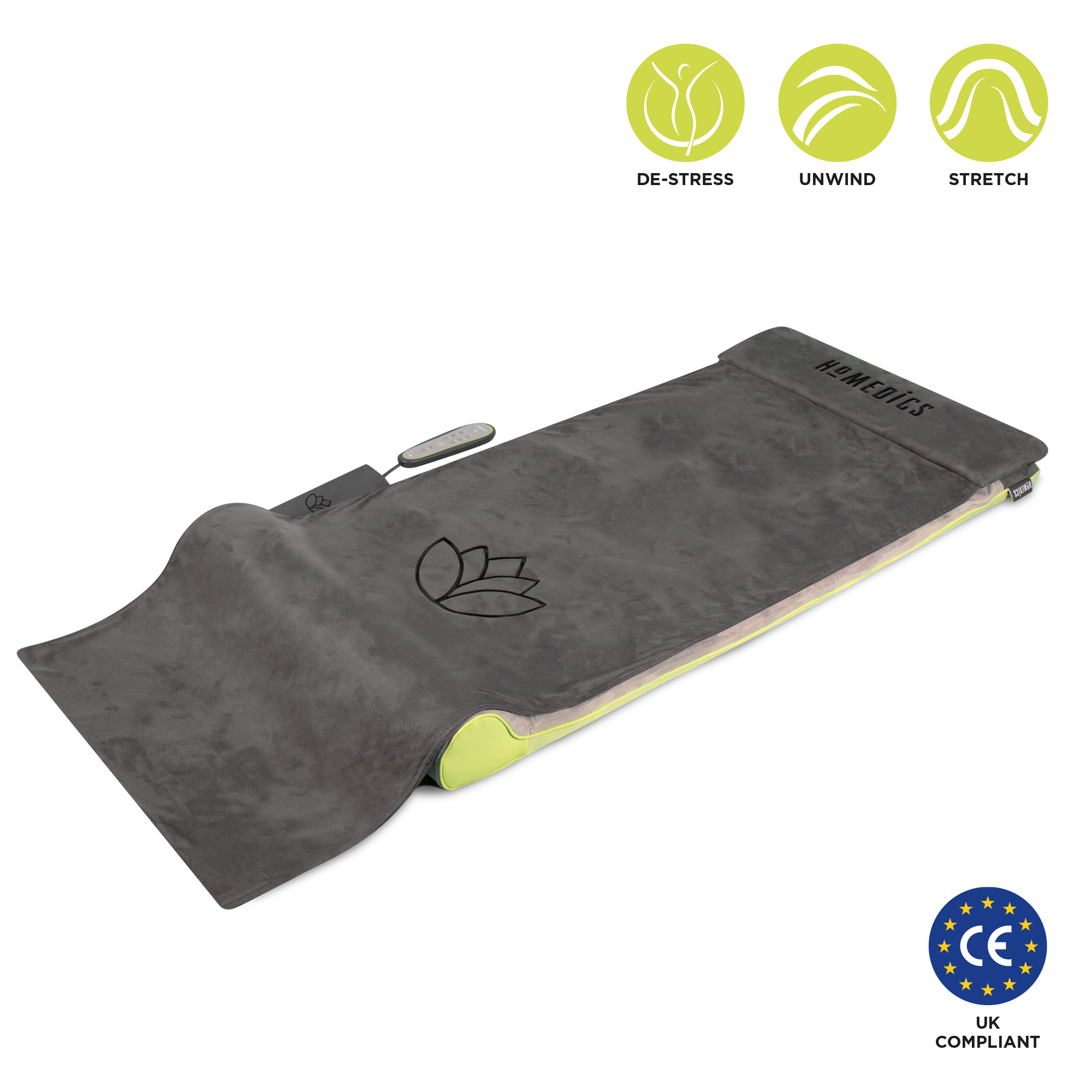 Retail Product Title HoMedics STRETCH+ PLUS Short Retail Product Title (60) HoMedics STRETCH+ PLUS Short Description A stress relieving, tension reducing, and relaxation focused back stretching mat. Lay back and relax as STRETCH+ PLUS moves your body through a gentle yet powerful sequence of yoga inspired stretches and twists. Long Description A stress relieving, tension reducing, and relaxation focused back stretching mat. Lay back and relax as STRETCH+ PLUS moves your body through a gentle yet powerful sequence of yoga inspired stretches and twists. An effortless way to experience the relaxing benefits of yoga, STRETCH+ PLUS guides you through a range of 6 sequences, calming and gently encouraging your body to stretch and unwind from the comfort of your home. Feature 1 7 precision-controlled air chambers Feature 2 6 Programs, including new 'Unwind' & 'Recover' Feature 3 Release tension and improve flexibility Feature 4 Feel immediate benefits in shoulders, back and hips Feature 5 Folds for easy storage Feature 6 Full function remote control