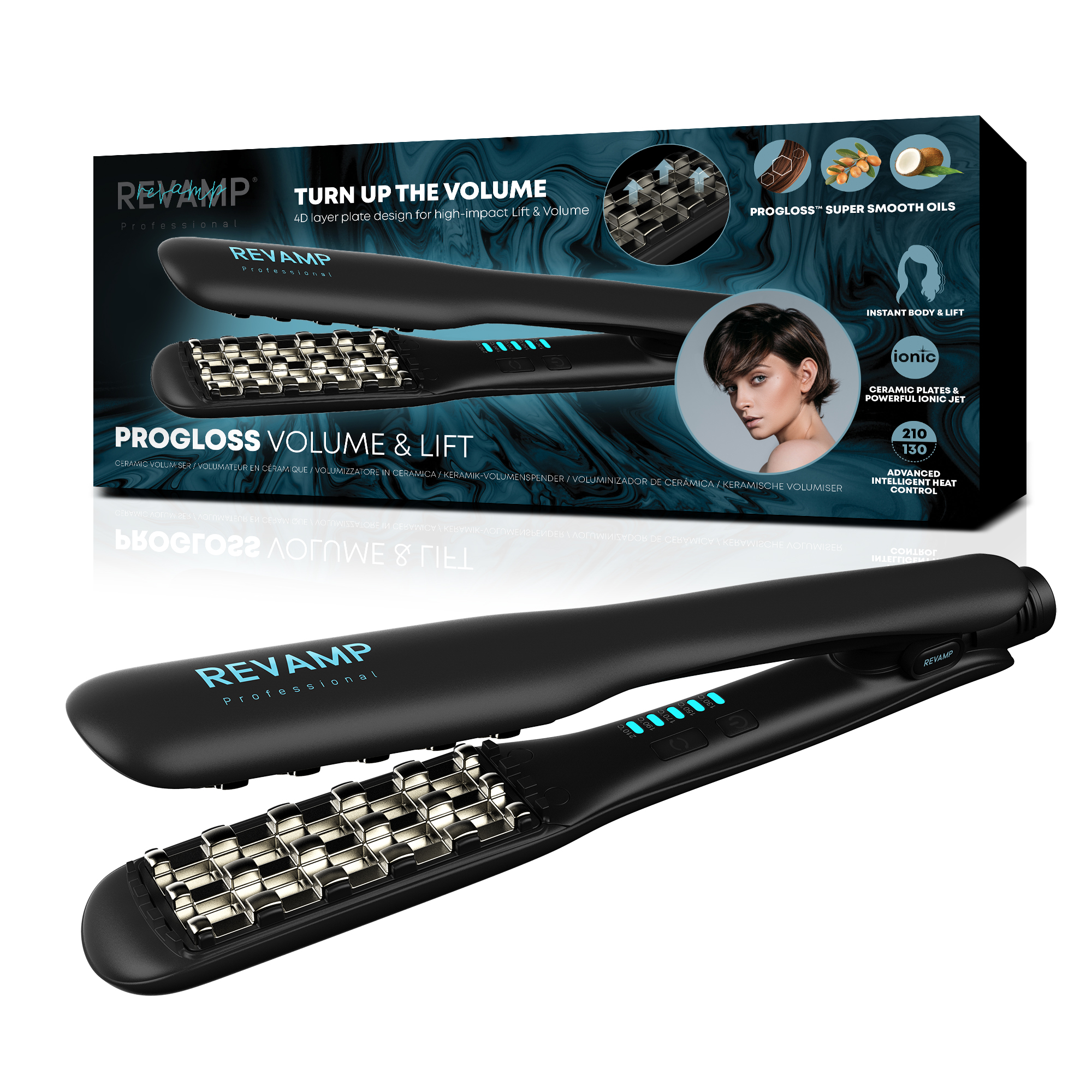 Retail Product Title Volume & Lift Ceramic Volumiser Short Retail Product Title (60) Volume & Lift Ceramic Volumiser Short Description The REVAMP Volume & Lift Ceramic Volumiser boosts the under layers of your hair at the roots to give you instant, undeniable volume. With 3D ceramic plates, an ionic jet and variable digital heat settings from 130°C to 210°C, you can select the temperature that suits your hair type. The built-in ionic jet conditions your hair from root to tip, so your final look is free from frizz and flyaways. Features a lock for secure storage, a heat resistant mat and an auto shut-off too – meaning a safer styling session. Long Description Searching for ways to achieve more volume and hair that demands a double take? Well, look no further. The Progloss Volume & Lift Ceramic Volumiser works on the under layers of your hair to lift it from the roots – meaning you can enjoy instant, undeniable volume and hair that has a new lease of life. With innovative, 3D ceramic plates, an ultra-fast pro PTC heater and an ionic jet, this volumiser will give your hair a fuller, more voluminous appearance and a salon-worthy shine in minutes. Featuring variable digital heat settings from 130°C to 210°C, you can select the temperature that suits your hair type and relax knowing your hair isn’t receiving more heat than it needs. The built-in ionic jet conditions your hair from root to tip, so your final look is free from frizz and has a radiant shine. This volumiser has a lock for secure storage, a heat resistant mat and an auto shut-off too – meaning you can expect a safer styling session. The Revamp Progloss Volume & Lift Ceramic Volumiser is a fast-acting favourite (and it's not difficult to see why). Feature 1 Innovative 3D plates for instant lift and volume from the roots Feature 2 Advanced intelligent heat control monitors and regulates the temperature for minimal hair damage Feature 3 Ceramic plates infused with Progloss™ super smooth keratin, argan and coconut oils Feature 4 Powerful ionic jet for frizz-free volume and reduced static Feature 5 Fast, digital variable heat settings from 130°C to 210°C Feature 6 Ultra-fast heat-up and recovery time Feature 7 Auto shut-off after 30 minutes Feature 8 Secure plate lock for safe storage Feature 9 Suitable for all hair types