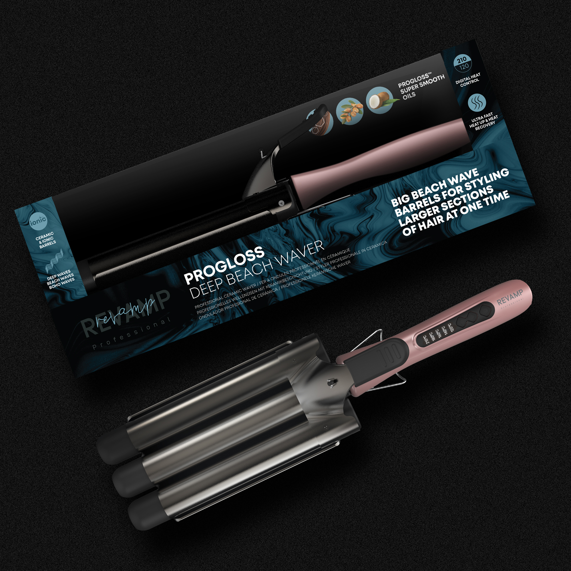 Retail Product Title Revamp Progloss Deep Beach Waver - Rose Gold Short Retail Product Title (60) Revamp Progloss Deep Beach Waver - Rose Gold Short Description Create effortless, long-lasting beach waves with the REVAMP Deep Beach Professional Ceramic Waver (even when beach season is over). Featuring 25mm triple ceramic barrels, it creates perfectly formed beach waves or lazy boho waves for a more relaxed look without creases or static. Infused with our signature Progloss™ Super Smooth Oils, the ceramic ionic barrels leave your hair soft, silky, and radiant - with that perfect beach-ready finish all year round. Suitable for all hair types, with customised heat settings (120ºC-210ºC). Long Description Flawless, bouncy beach waves are made effortless with the Progloss Deep Beach Waver. The triple barrel design creates beautiful S-shaped waves, with long-lasting results and stunning shine. BOUNCY BEACH WAVES – QUICK & EASY Our triple barrel hair waver has been designed to make it quick and easy to create beautiful beach waves. Simply open the clamp and feed a section of hair between the barrels, close and hold it down for a few seconds, before moving further down the section of hair and repeating. The combination of ceramic and ionic technology works to seal cuticles, eliminate frizz, and create smooth hairstyles. With minimal effort, you will have flawless, flowing waves that will last all day. ADJUSTABLE TEMPERATURE SETTINGS With ultimate fast variable heat, you’ll be able to cater your styling experience to your specific hair type and texture. Whether you have fine, medium or thick hair, you can choose from 5 adjustable temperature settings, ranging from 120°C to 210°C. ENHANCED SHINE To ensure your waves stand out with enhanced shine, the barrel of this styling tool is infused with our Progloss Super Smooth Oils -including Keratin, Argan oil and Coconut oil. This unique combination nourishes the hair for visibly smooth results, with enhanced shine. STYLING FLEXIBILITY The cool tip provides additional safety for you to hold the hair in place whilst styling. A heat resistant glove is also included to protect your hands, whilst the built-in stand allows you to place the styling tool down without damaging your surfaces. For extra peace of mind, the auto shut-off feature will ensure the hair waver is switched off after 60 minutes. Built to last with a 3-year guarantee. Feature 1 Hot ceramic deep triple big wave barrels for flawless bouncy beach waves Feature 2 Crimp-free design to create flowing boho or beach waves that will not leave any creases in the hair Feature 3 Ultra-fast Pro PTC heater for ultimate fast heat-up and heat recovery Feature 4 Progloss™ super smooth oils Keratin, Argan and Coconut infused ceramic triple barrels for ultimate smoothness Feature 5 Ultimate fast variable heat from 120ºC - 210ºC - ready to style in seconds to suit all hair types and looks Feature 6 Ceramic and ionic barrels for frizz free, big waves with less static Feature 7 Auto shut-off after 60 minutes Feature 8 3m salon swivel cable Feature 9 Built-in product stand