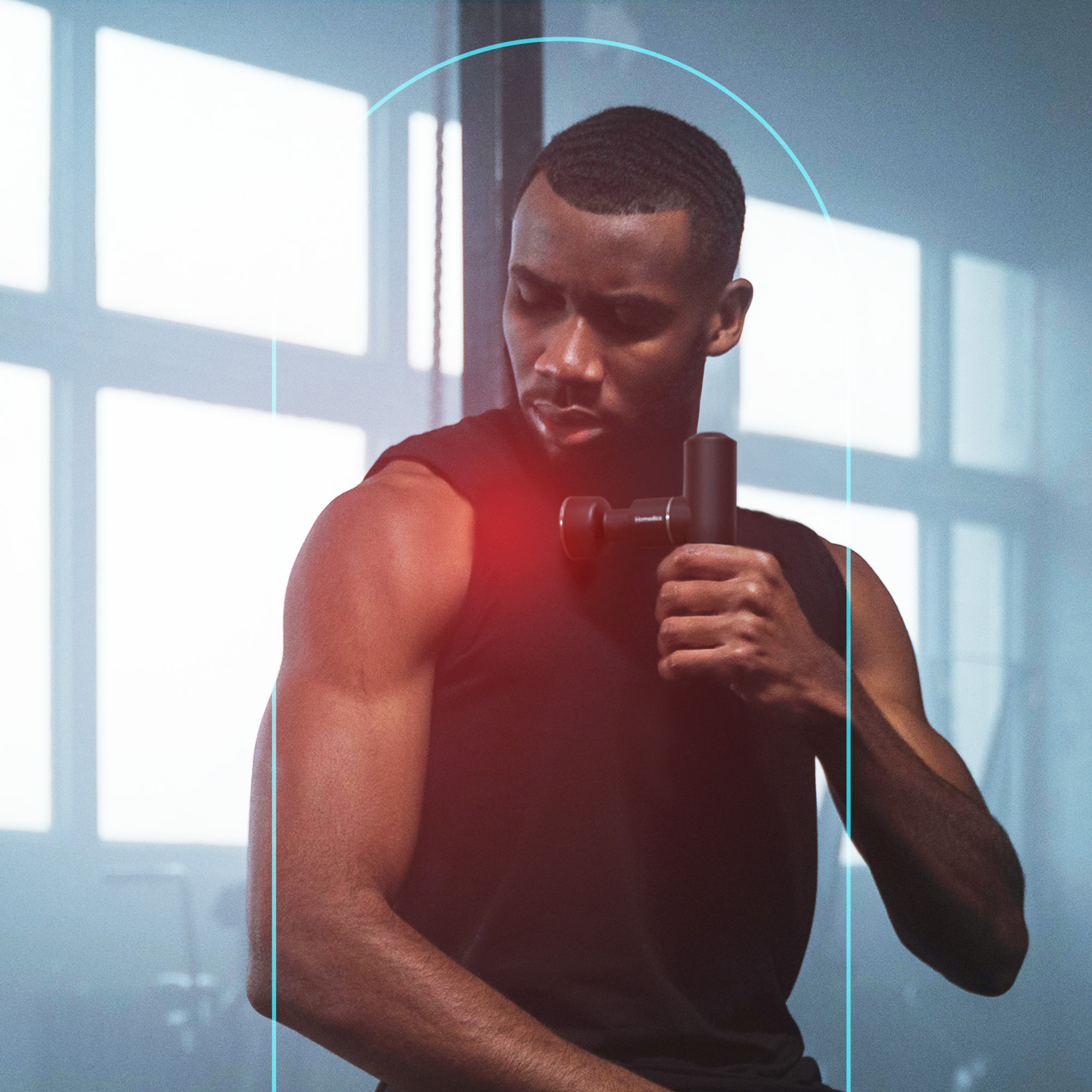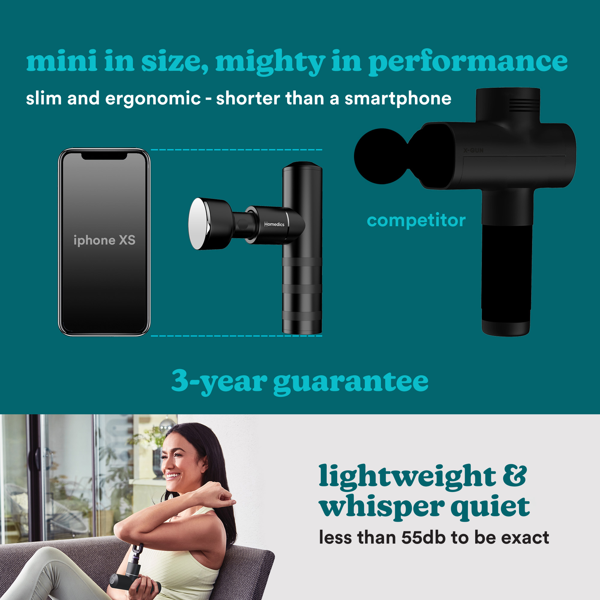 - Downsize your gym bag. Upgrade your recovery. The Homedics MYTI Mini Massage Gun puts the power of elite recovery comfortably in the palm of your hand, using high-powered massage to soothe sore muscles anytime, anywhere. With 5 attachments and 4 intensity settings, including a heated head reaching 45°C in seconds, MYTI delivers full-body recovery targeted to you. Heated: up to 45°C of heat to stimulate recovery deep within the muscle tissue. Round: use on larger muscle groups such as arms, thighs, waist, back and buttocks. U-Shaped: use on shoulders, neck, the Achilles tendon area, ankles and calves. Bullet: use for a more targeted massage on smaller areas such as the feet. Flat: use on areas of deep muscle tissue following intense exercise. USB-C rechargeable, with a sleek travel case included, MYTI was crafted to keep up with your lifestyle. Enjoy the 3-hour runtime on your way to the gym, commuting to a meeting or heading off on a long weekend - no matter the time or place, MYTI has your recovery covered.