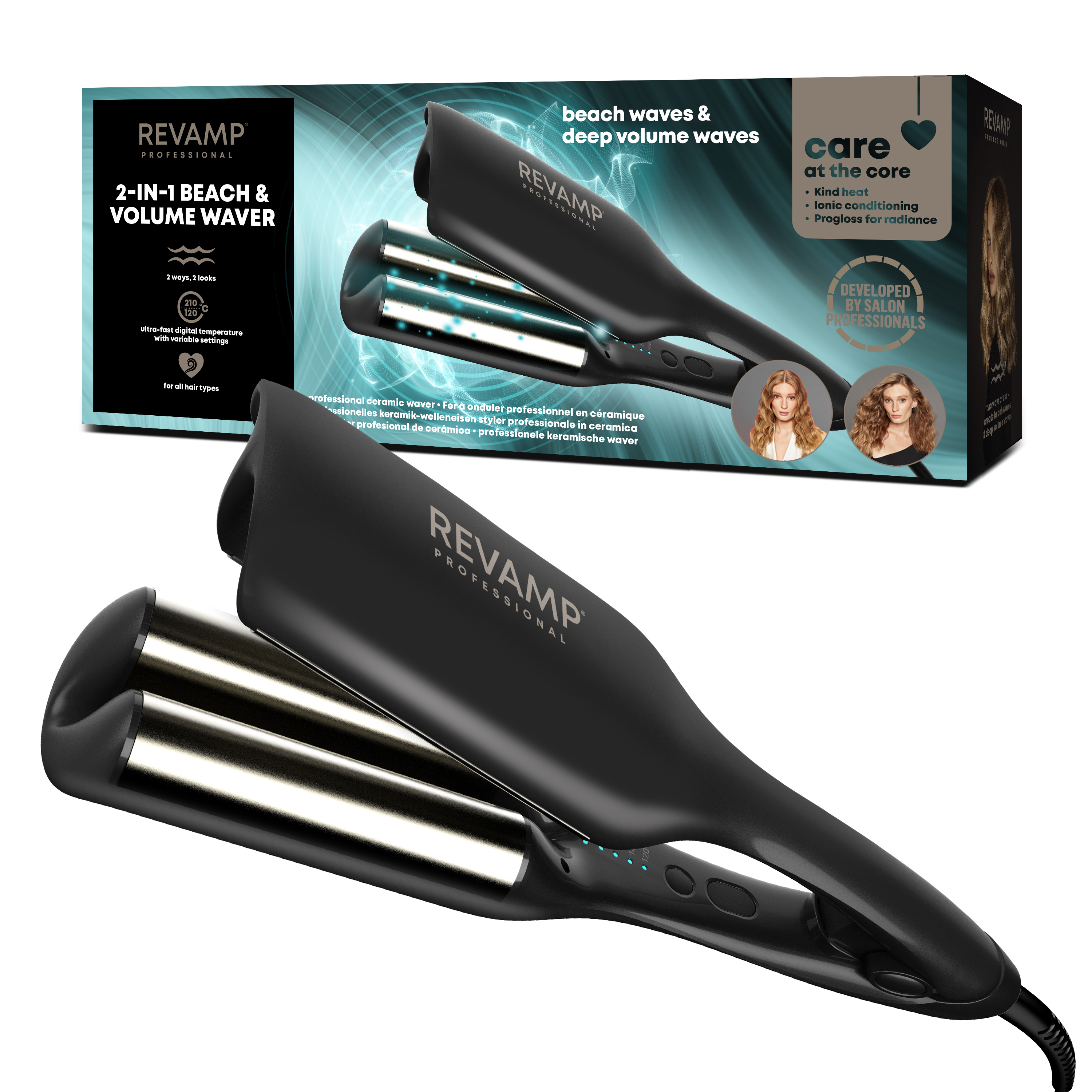 EAN Code : Individual Retail Pack 5010777158014 Product Width (cm) 34 Product Depth (cm) 7.5 Product Height (cm) 4 Outer Carton Weight (kg) 6.58 Outer Carton Width (cm) 34.7 Outer Carton Depth (cm) 26.5 Outer Carton Height (cm) 28 MAINS Power Mains Main Battery Quantity N/A Retail Product Title Ondulador profesional de cerámica 2 en 1 para ondas playeras con volumen de REVAMP Short Retail Product Title (60) Ondulador profesional de cerámica 2 en 1 para ondas playeras con volumen de REVAMP Short Description Cree unas divertidas ondas playeras tipo festival o unas ondas con movimiento y mucho volumen con el ondulador profesional de cerámica 2 en 1 para ondas playeras con volumen de REVAMP. Este aparato, fácil de usar, alcanza la temperatura necesaria rápidamente y cuenta con placas curvadas que combinan tecnología iónica y cerámica para lucir un acabado brillante. Con los aceites Progloss™ característicos de REVAMP (una nutritiva mezcla de aceites de queratina, argán y coco), este ondulador dejará el cabello suave, sedoso y con un brillo saludable. Adecuado para todo tipo de cabellos, ofrece una temperatura variable que va de 120 a 210 °C, apagado automático y una alfombrilla resistente al calor. Long Description Realce su melena con el ondulador profesional de cerámica 2 en 1 para ondas playeras con volumen de REVAMP y disfrute creando increíbles ondas de alto impacto u ondas playeras naturales, lo que desee. ONDAS A SU GUSTO Sus ondas, sus normas. Cree dos estilos diferentes de ondas según su estado de ánimo. ¿Busca unas ondas sueltas tipo festival? Use el ondulador con el logotipo de REVAMP hacia fuera. Si desea unas ondas con movimiento y más volumen, solo tiene que girar el ángulo de forma que el logotipo de REVAMP quede hacia usted. Disfrute de una suavidad y brillo máximos en ambos tipos de ondas. CUESTIÓN DE SEGUNDOS Pase menos tiempo peinándose y más alardeando de sus ondas. Con la tecnología térmica Pro PTC ultrarrápida, el ondulador está listo en cuestión de segundos, independientemente del tipo de cabello o la textura. IDEAL PARA TODO TIPO DE CABELLOS Con ajustes de temperatura variables (de 120 a 210 °C) y una rápida recuperación del calor, podrá crear las ondas que vayan con su estado de ánimo y con cualquier tipo de cabello. ACEITES SUPERSUAVES PROGLOSS™ Para garantizar un cabello rebosante de vida y brillo, todos los productos para el cuidado del cabello de REVAMP están tratados con nuestros aceites supersuaves Progloss™, enriquecidos con aceites de queratina, argán y coco. Esta combinación única nutre el cabello para obtener resultados visiblemente suaves con mayor brillo. FÁCIL DE USAR Con un diseño elegante y ligero y un Cable giratorio profesional de 3 m, el ondulador profesional de cerámica 2 en 1 para ondas playeras con volumen de REVAMP está diseñado para peinar con facilidad y flexibilidad. Para mayor tranquilidad, este ondulador se apaga de forma automática tras 60 minutos sin usar. Incluye un guante resistente al calor. Voltaje universal. Feature 1 Dos formas de uso: se pueden crear intensas ondas voluminosas con movimiento u ondas playeras tipo festival Feature 2 Diseño sin sujeción para crear dos estilos de ondas diferentes sin pliegues en el cabello Feature 3 Calor digital variable ultrarrápido 120ºC - 210ºC en cuestión de segundos y adecuado para todo tipo de cabellos Feature 4 La tecnología térmica Pro PTC proporciona la temperatura necesaria y la recuperación del calor de forma ultrarrápida Feature 5 Todos los productos para el cuidado del cabello de REVAMP están tratados con aceites supersuaves Progloss™, enriquecidos con aceites de queratina, argán y coco para una suavidad y brillo máximos sin encrespamiento Feature 6 Apagado automático tras 60 minutos Feature 7 Cable giratorio profesional de 3 m Feature 8 Alfombrilla resistente al calor Feature 9 Voltaje universal