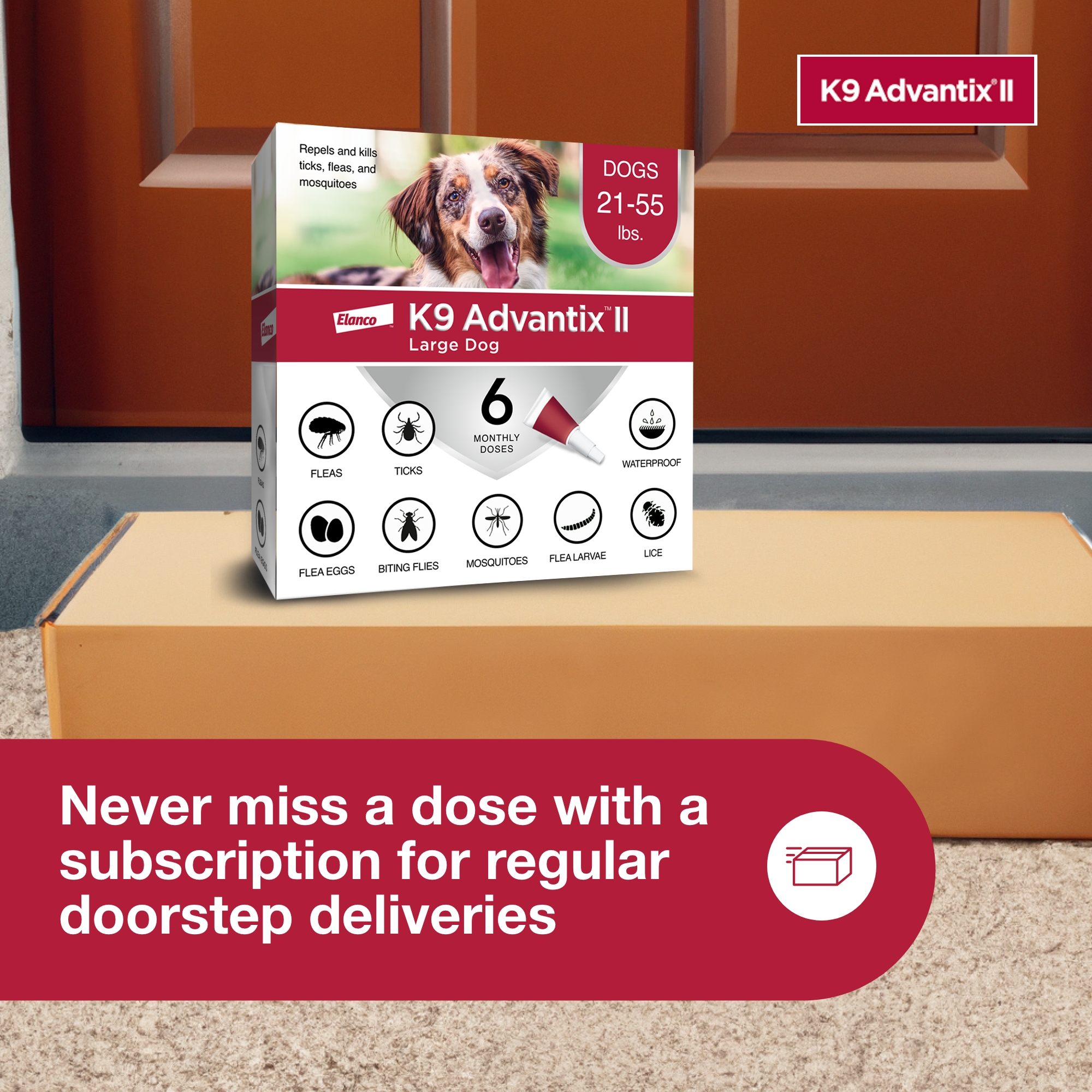 Elanco Item # 86315092 Product Title K9 Advantix II Large Dog Vet-Recommended Flea, Tick & Mosquito Treatment & Prevention | Dogs 21 - 55 lbs. | 6-Mo Supply Product Class OTC Each - UPC 00724089204028 Brand K9 Advantix II Item Name K9 Advantix II Large 6-ct Country of Origin Germany Long Description K9 Advantix II Large Dog is the veterinarian-recommended formula that helps defend your dog against five pests: fleas, ticks, mosquitoes, biting flies and lice. And unlike other treatments, K9 Advantix II kills and repels fleas, ticks and mosquitoes. K9 Advantix II topical treatment gets straight to work killing fleas on dogs within 12 hours of initial application. This formula stops existing flea infestations and prevents new ones by killing adult fleas on contact so they can’t lay eggs and they don’t have to bite your dog to die. Fleas, ticks, mosquitoes and other pests not only cause discomfort; they may also transmit disease. Monthly use of K9 Advantix II is important to protect your dog against fleas that may cause transmission of tapeworms. This formula also kills fleas which may cause Flea Allergy Dermatitis and flea bite anemia. That’s why K9 Advantix II Large Dog topical, spot-on formula makes application simple - going on in seconds. It's easier than a flea collar and there are no hard-to-swallow pills. You’ll also love that K9 Advantix II is fragrance-free and waterproof after 24 hours of application. Check the product label for information on application and potential side effects. K9 Advantix II pest protection is effective on both indoor and outdoor dogs. Your dog should be at least 7 weeks old and weigh 21-55 lbs. to use K9 Advantix II Large Dog. For the ultimate convenience in care, K9 Advantix II is available over the counter – no prescription needed. And, you can stock up with 2-dose, 4-dose and 6-dose packs so you never miss a monthly treatment. Once K9 Advantix II is applied, your dog is ready to get right back to big-pup cuddles and racing around the park. K9 Advantix II Large Dog is a trademark of Elanco or its affiliates. Medium Description K9 Advantix II helps defend your dog against fleas, ticks, mosquitoes, biting flies, and lice. Simpler than a flea collar and troublesome pills, this vet-recommended topical formula works within 12 hours of initial application, killing adult fleas on contact to stop existing flea infestations and prevent new ones. Once K9 Advantix II is applied, your dog is ready to get right back to the things it loves most. K9 Advantix II pest protection is effective on both indoor and outdoor dogs. Your dog should be at least 7 weeks old and weigh 21-55 lbs. to use K9 Advantix II Large Dog. K9 Advantix II Large Dog is a trademark of Elanco or its affiliates. Short Description K9 Advantix II Large Dog topical 5-pest treatment & prevention kills & repels fleas, ticks & more on dogs 21- 55 lbs. Key Bullet 1 K9 Advantix II Large Dog 30-day treatment & prevention protects dogs 21-55 lbs. from fleas, ticks, mosquitoes, biting flies and lice Key Bullet 2 Kills fleas within 12 hours of application Key Bullet 3 Vet-recommended formula kills & repels on contact so fleas don’t have to bite your dog to die Key Bullet 4 Easy-to-apply topical treatment is fragrance-free and waterproof after 24 hours Key Bullet 5 No prescription needed Species Dog Directions for Use Use only on dogs. DO NOT USE ON CATS or other animals. Do not apply to dogs weighing less than 4 lbs. Remove applicator tube from the package. Use scissors and peel down foil. Hold applicator tube in an upright position. Pull cap off tube. Turn cap around and place other end of cap back on tube. Twist cap to break seal, then remove cap from tube. The dog should be standing for easy application. Evenly apply entire contents of the tube along the top of the dog's back, from the shoulder down to the base of the tail. The number of spots depends on the size and weight of your dog (please refer to the product label). At each spot, part the hair until skin is visible. Place the tip of the tube on the skin and gently squeeze to expel a portion of the solution on the skin. Do not apply an excessive amount of solution at any one spot that could cause some of the solution to run off the side of the dog. Do not get this product in your dog’s eyes, or allow your dog to ingest this product. Storage Instructions Store in a cool, dry place inaccessible to children and pets. Protect from freezing. Active Ingredients Imidacloprid, Permethrin, Pyriproxyfen Product Form Topical Pet Size Large Pet Lifestage 7 weeks and older Pet Weight 21-55 lbs Product Label URL https://www.elancolabels.com/us/k9-advantix-dog-all-sizes Clamshelled Version? No Each - Package Type Box Dimensions UoM in Weight UoM lb Each - Height 6.625 Each - Length 4.375 Each - Width 1.375 Each - Weight 0.15000000000000002 Inner Case - Qty 6 Master Case - Qty 108 Master Case - UPC/GTIN 10724089150926 Master Case - Height 18.5 Master Case - Length 20.875 Master Case - Width 14.1875 Master Case - Weight 17.7 Inner Packs Per Master 18 Pallet - Number of layers 2 Pallet Height (including pallet) 43.8125 Unit Count 6 Unit Count Type Count Pack Count 6 Prop 65 Warning Required? No State Registration Reqd? Yes CA EPA Reg # 11556-143-ZA EPA Reg # 11556-143