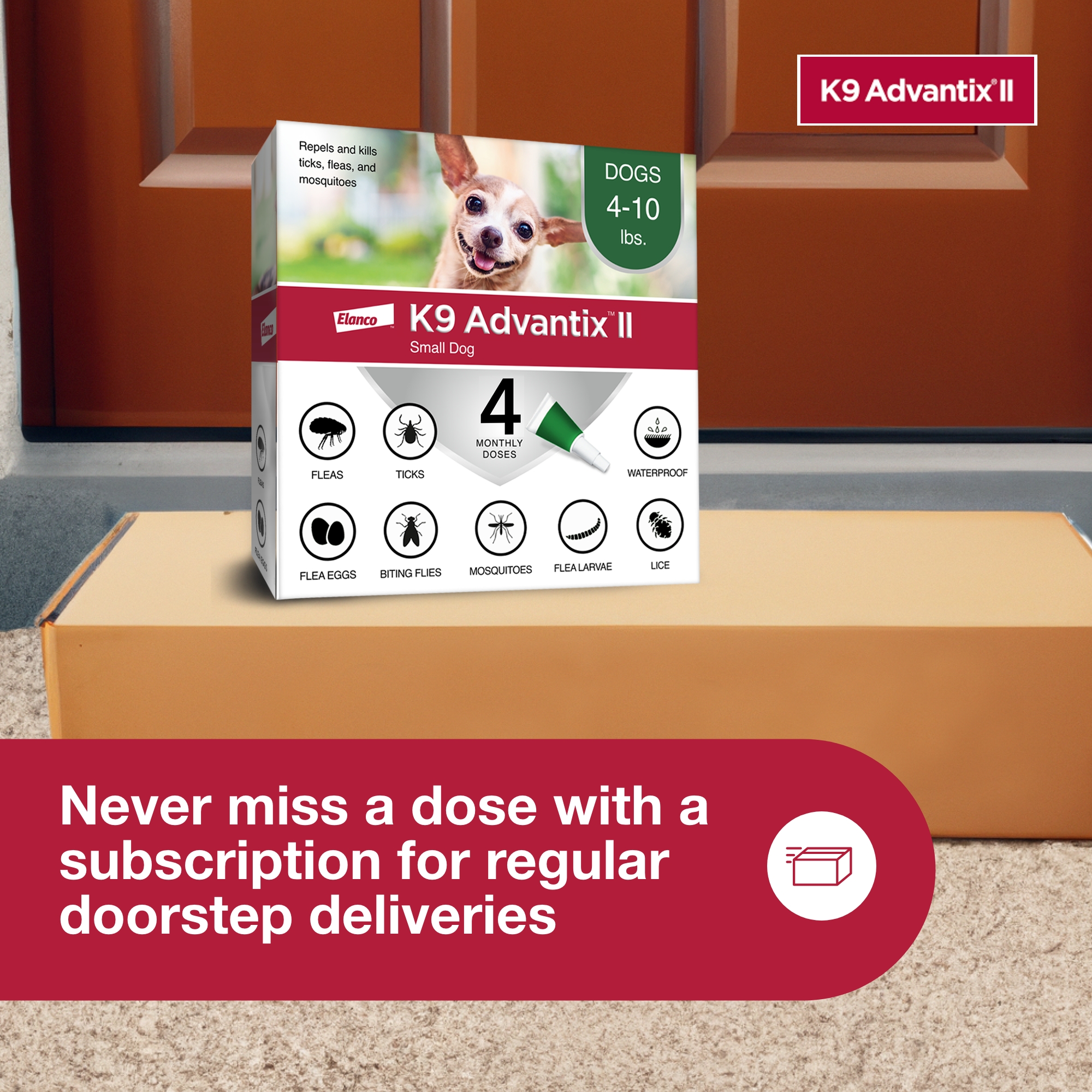 Elanco Item # 86315106 Product Title K9 Advantix II Small Dog Vet-Recommended Flea, Tick & Mosquito Treatment & Prevention | Dogs 4-10 lbs. | 4-Mo Supply Product Class OTC Each - UPC 00724089203489 Brand K9 Advantix II Item Name K9 Advantix II Small 4-ct Country of Origin Germany Long Description K9 Advantix II Small Dog is the veterinarian-recommended formula that helps defend your dog against five pests: fleas, ticks, mosquitoes, biting flies and lice. And unlike other treatments, K9 Advantix II kills and repels fleas, ticks and mosquitoes. K9 Advantix II topical treatment gets straight to work killing fleas on dogs within 12 hours of initial application. This formula stops existing flea infestations and prevents new ones by killing adult fleas on contact so they can’t lay eggs and they don’t have to bite your dog to die. Fleas, ticks, mosquitoes and other pests not only cause discomfort; they may also transmit disease. Monthly use of K9 Advantix II is important to protect your dog against fleas that may cause transmission of tapeworms. This formula also kills fleas which may cause Flea Allergy Dermatitis and flea bite anemia. That’s why K9 Advantix II Small Dog topical, spot-on formula makes application simple - going on in seconds. It's easier than a flea collar and there are no hard-to-swallow pills. You’ll also love that K9 Advantix II is fragrance-free and waterproof after 24 hours of application. Check the product label for information on application and potential side effects. K9 Advantix II pest protection is effective on both indoor and outdoor dogs. Your dog should be at least 7 weeks old and weigh 4-10 lbs. to use K9 Advantix II Small Dog. For the ultimate convenience in care, K9 Advantix II is available over the counter – no prescription needed. And, you can stock up with 2-dose, 4-dose and 6-dose packs so you never miss a monthly treatment. Once K9 Advantix II is applied, your dog is ready to get right back to big-pup cuddles and racing around the park. K9 Advantix II Small Dog is a trademark of Elanco or its affiliates. Medium Description K9 Advantix II helps defend your dog against fleas, ticks, mosquitoes, biting flies, and lice. Simpler than a flea collar and troublesome pills, this vet-recommended topical formula works within 12 hours of initial application, killing adult fleas on contact to stop existing flea infestations and prevent new ones. Once K9 Advantix II is applied, your dog is ready to get right back to the things it loves most. K9 Advantix II pest protection is effective on both indoor and outdoor dogs. Your dog should be at least 7 weeks old and weigh 4-10 lbs. to use K9 Advantix II Small Dog. K9 Advantix II Small Dog is a trademark of Elanco or its affiliates. Short Description K9 Advantix II Small Dog topical 5-pest treatment & prevention kills & repels fleas, ticks & more on dogs 4-10 lbs. Key Bullet 1 K9 Advantix II Small Dog 30-day treatment & prevention protects dogs 4-10 lbs. from fleas, ticks, mosquitoes, biting flies and lice Key Bullet 2 Kills fleas within 12 hours of application Key Bullet 3 Vet-recommended formula kills & repels on contact so fleas don’t have to bite your dog to die Key Bullet 4 Easy-to-apply topical treatment is fragrance-free and waterproof after 24 hours Key Bullet 5 No prescription needed Species Dog Directions for Use Use only on dogs. DO NOT USE ON CATS or other animals. Do not apply to dogs weighing less than 4 lbs. Remove applicator tube from the package. Use scissors and peel down foil. Hold applicator tube in an upright position. Pull cap off tube. Turn cap around and place other end of cap back on tube. Twist cap to break seal, then remove cap from tube. The dog should be standing for easy application. Evenly apply entire contents of the tube along the top of the dog's back, from the shoulder down to the base of the tail. The number of spots depends on the size and weight of your dog (please refer to the product label). At each spot, part the hair until skin is visible. Place the tip of the tube on the skin and gently squeeze to expel a portion of the solution on the skin. Do not apply an excessive amount of solution at any one spot that could cause some of the solution to run off the side of the dog. Do not get this product in your dog’s eyes, or allow your dog to ingest this product. Storage Instructions Store in a cool, dry place inaccessible to children and pets. Protect from freezing. Active Ingredients Imidacloprid, Permethrin, Pyriproxyfen Product Form Topical Pet Size Small Pet Lifestage 7 weeks and older Pet Weight 4-10 lbs Product Label URL https://www.elancolabels.com/us/k9-advantix-dog-all-sizes Clamshelled Version? No Each - Package Type Box Dimensions UoM in Weight UoM lb Each - Height 4.75 Each - Length 4.375 Each - Width 1.375 Each - Weight 0.1 Inner Case - Qty 6 Master Case - Qty 108 Master Case - UPC/GTIN 10724089151060 Master Case - Height 18.5 Master Case - Length 15.3125 Master Case - Width 14.25 Master Case - Weight 13.15 Inner Packs Per Master 18 Pallet - Number of layers 2 Pallet Height (including pallet) 43.8125 Unit Count 4 Unit Count Type Count Pack Count 4 Prop 65 Warning Required? No State Registration Reqd? Yes CA EPA Reg # 11556-141-ZA EPA Reg # 11556-141