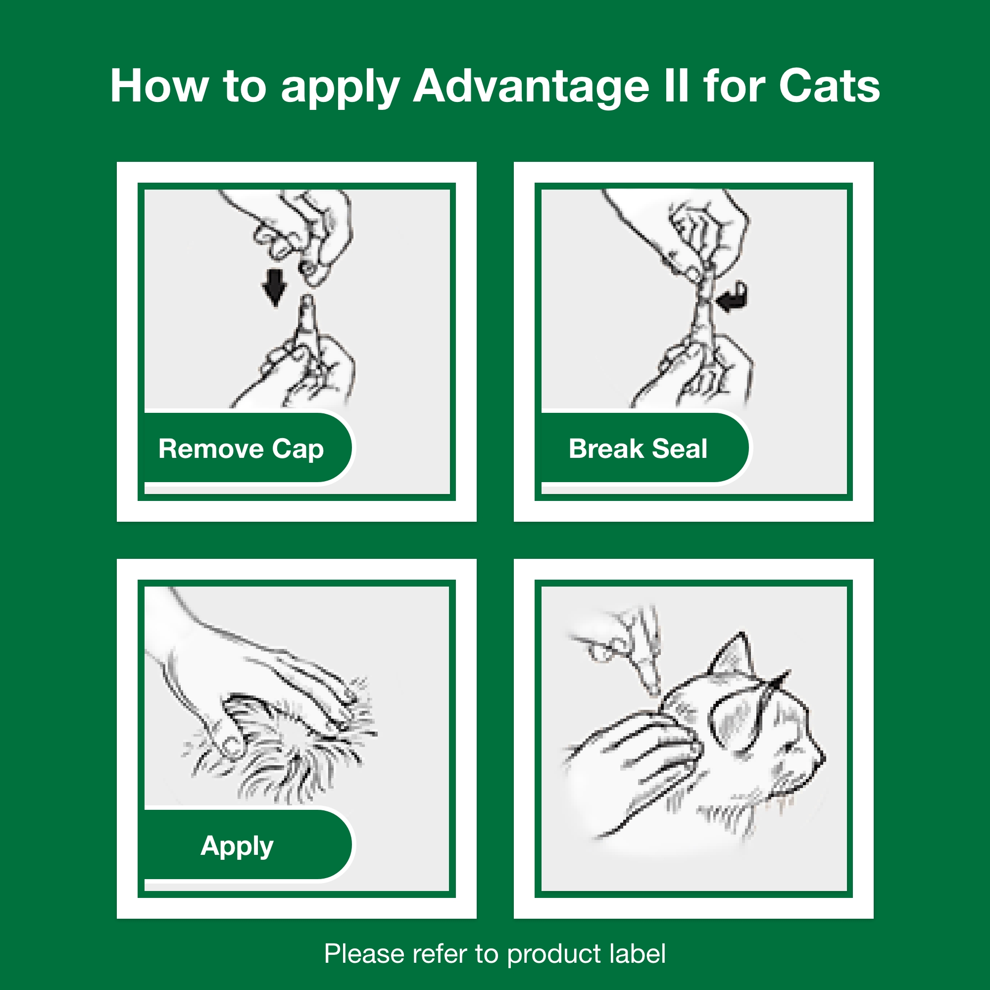 Elanco Item # 86336650 Product Title Advantage II Small Cat Vet-Recommended Flea Treatment & Prevention | Cats 5-9 lbs. | 2-Month Supply Product Class OTC Each - UPC 00724089682437 Brand Advantage II Item Name Advantage II Cat Small 2-ct Country of Origin Germany Long Description Advantage II Small Cat is a vet-recommended, leading brand in cat flea protection. Advantage II Small Cat flea treatment and prevention kills adult fleas, flea larvae and flea eggs to deliver total flea protection to your cat or kitten. Within 12 hours of application, Advantage II Small Cat topical treatment gets straight to work killing fleas through contact, so they don’t have to bite your cat to die. This treatment works hard for 30 days following application, effectively breaking the flea life cycle, controlling existing flea infestations and preventing further infestations all month long. Fleas not only cause discomfort; they can also pose other health risks. Monthly use of Advantage II Small Cat is important to protect your cat against fleas that may cause transmission of tapeworms, Flea Allergy Dermatitis and flea bite anemia. That’s why Advantage II Small Cat makes applying treatment simple. This convenient, spot-on application goes on the back of your cat’s neck at the base of the skull. You’ll simply place the tip of the tube on the skin and squeeze the tube to expel the entire contents directly on the skin. It goes on in seconds! It's easier than a flea collar and there are no hard-to-swallow pills. You’ll also love that Advantage II Small Cat is fragrance-free and waterproof after 24 hours of application. Check the product label for information on application and potential side effects. Advantage II Small Cat flea protection is effective on both indoor and outdoor cats. Your cat should be at least 8 weeks old and weigh 5-9 lbs. to use Advantage II Small Cat. For the ultimate convenience in care, Advantage II Small Cat is available over the counter – no prescription needed. And, you can stock up with a subscription for regular doorstep deliveries so you never miss a monthly treatment. Advantage II Small Cat is a trademark of Elanco or its affiliates. Medium Description Deliver total flea protection to your cat or kitten with Advantage II Small Cat. This vet-recommended, topical treatment and prevention formula kills adult fleas, flea larvae, and flea eggs on contact within 12 hours of application - meaning fleas can be eliminated before they bite or lay new eggs. Effectively break the flea life cycle, control existing flea and lice infestations, and prevent further infestations with one simple application. Advantage II Small Cat flea protection is effective on both indoor and outdoor cats. Your cat should be at least 8 weeks old and weigh 5-9 lbs. to use Advantage II Small Cat. Advantage II Small Cat is a trademark of Elanco or its affiliates. Short Description Advantage II Small Cat vet-recommended flea treatment & prevention is a monthly treatment for small cats 5-9 lbs. Key Bullet 1 Advantage II Small Cat is a leading brand in cat flea treatment and prevention for small cats 5-9 lbs., at least 8 weeks of age Key Bullet 2 Vet-recommended, easy-to-apply monthly topical treatment – no hard-to-swallow pills, no prescription needed Key Bullet 3 Delivers total flea protection – kills adult fleas, flea larvae and flea eggs through contact Key Bullet 4 Same-day effectiveness – kills fleas within 12 hours of application and keeps working for 30 days Key Bullet 5 Fragrance-free formula, waterproof after 24 hours of application Species Cat Directions for Use Application Instructions: 1. Use only on cats. 2. Hold applicator tube in an upright position. Pull cap off tube. 3. Turn the cap around and place other end of cap back on tube. Twist cap to break seal, then remove cap from tube. 4. Part the hair at the base of the cat’s skull until skin is visible. 5. Evenly apply the entire contents of the Advantage II tube directly on the skin by squeezing the entirety of the contents in that one spot. Do not get this product in your cat’s eyes, or allow your cat to ingest this product. Storage Instructions Store in a cool, dry place inaccessible to children and pets. Active Ingredients Imidacloprid, Pyriproxyfen Product Form Topical Pet Size Small Pet Lifestage 8 weeks and older Pet Weight 5-9 lbs Clamshelled Version? No Each - Package Type Box Dimensions UoM in Weight UoM lb Each - Height 4.75 Each - Length 1 Each - Width 4.375 Each - Weight 0.1 Inner Case - Qty 6 Master Case - Qty 72 Master Case - UPC/GTIN 10724089366501 Master Case - Height 12.8125 Master Case - Length 14.0625 Master Case - Width 11.25 Master Case - Weight 6.65 Inner Packs Per Master 12 Pallet - Number of layers 2 Pallet Height (including pallet) 43.8125 Unit Count 2 Unit Count Type Count Pack Count 2 Prop 65 Warning Required? No State Registration Reqd? Yes CA EPA Reg # 11556- 151-ZB EPA Reg # 11556-151