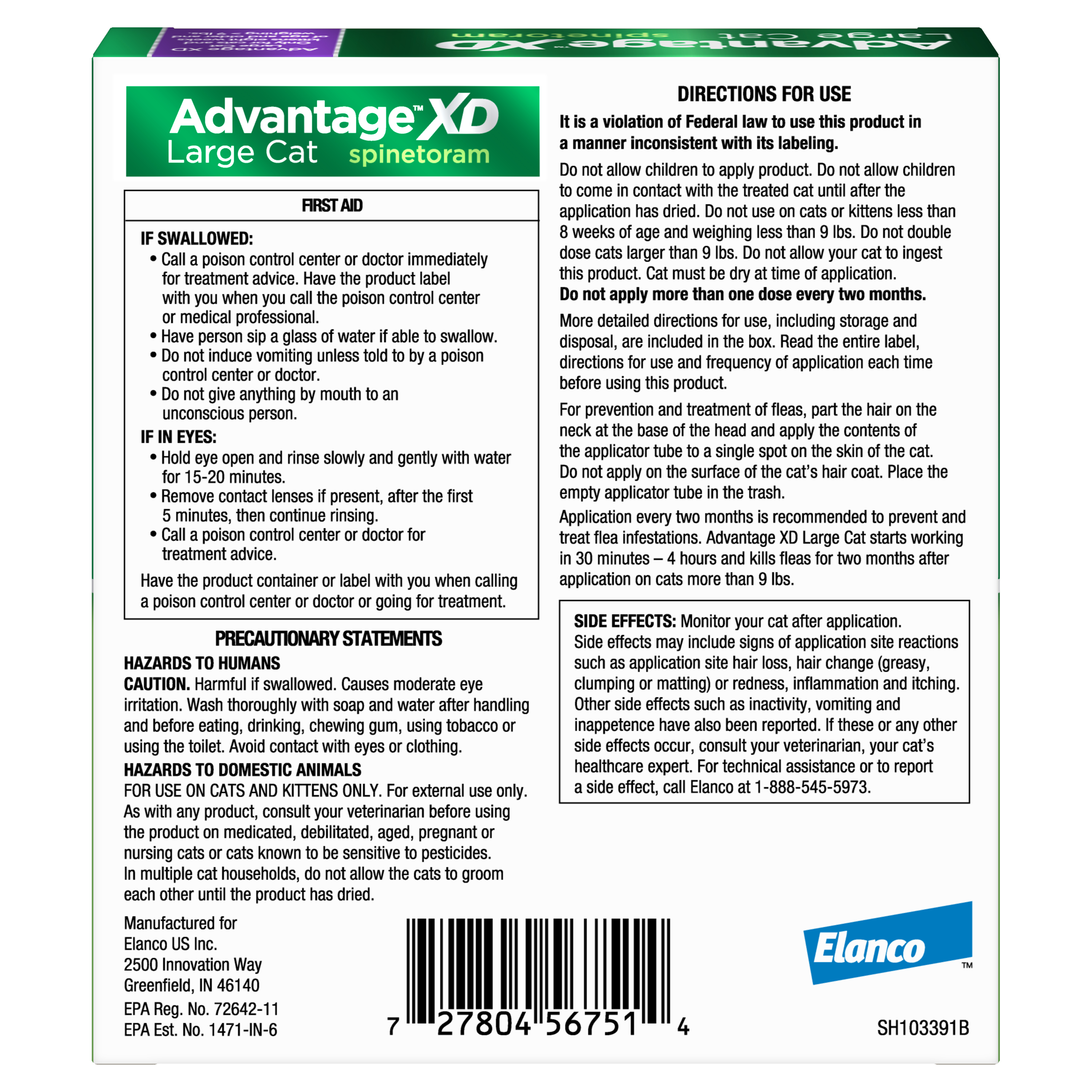 Elanco Item # CA4242024AM Product Title Advantage XD Large Cat Flea Prevention & Treatment For Cats over 9lbs. | 4-Topical Doses, 2-Months of Protection Per Dose Product Class OTC Each - UPC 00727804567514 Brand Advantage XD Item Name Advantage XD Large Cat - 4 pack Country of Origin United States Long Description Cat lovers choose Advantage XD for double the lasting protection against fleas vs. other 1-month options. Advantage XD for large cats and kittens packs two full months of treatment and continuous protection in each dose, so your cat is protected for longer than the traditional 1-month formula.* If your cat has already tousled with fleas, you’ll love that Advantage XD topical treatment starts killing fleas within 30 minutes to 4 hours through contact so they don’t have to bite and die. And with Advantage XD extended duration formula, that flea prevention remains effective for 8 weeks, outlasting the typical 6-week flea life cycle and preventing reinfestation. Find Advantage XD topical flea treatment available in a variety of pack sizes, from 2 months protection (1 dose), to 4 months protection (2 doses), or 8 months protection (4 doses). This fragrance-free formula contains Spinetoram, a naturally derived, Green Chemistry Award-winning** ingredient. Advantage XD flea infestation prevention is effective on both indoor and outdoor cats. Your cat should be at least 8 weeks old and weigh over 9 lbs. to use Advantage XD for large cats. Even with the squirmiest of kittens and cats, application is easy. The single, topical, spot-on application goes on the back of your cat’s neck at the base of the skull. You’ll simply place the tip of the tube on the skin and squeeze the tube to expel the entire contents directly on the skin. It's easier, there are no hard-to-swallow pills; this topical treatment goes on in seconds. See product label for more information. For the ultimate convenience in care, Advantage XD is available over the counter – no prescription needed. Once Advantage XD is applied, your cat is ready to get right back to exploring the outdoors or finding a cozy spot for a nap, while you get to enjoy peace of mind. *Based on label claims **US EPA Presidential Green Chemistry Challenge. Designing Greener Chemicals Award. 2008. Medium Description Advantage XD Large Cat offers lasting protection against fleas, packing two months of continuous treatment into just one dose. This topical treatment starts killing fleas through contact in 30 minutes to 4 hours, eliminating fleas before they can bite your cat. With Advantage XD extended duration formula, flea prevention remains effective for 8 weeks, outlasting the typical 6-week flea life cycle and preventing reinfestation. For your convenience, Advantage XD is available over the counter – no prescription needed. Advantage XD Large Cat is effective on both indoor and outdoor cats at least 8 weeks of age and weighing over 9lbs. Short Description Advantage XD Large Cat flea treatment and prevention protects cats over 9 lbs. for 2 months with each dose. Key Bullet 1 8 months (4 doses) flea treatment and prevention for indoor and outdoor cats and kittens over 9 lbs., 8 weeks or older Key Bullet 2 Longer-lasting protection vs. other topical products;* 2 months protection per dose, outlasting the typical flea life cycle *Based on label claims Key Bullet 3 Fast-acting treatment starts killing fleas within 30 minutes to 4 hours through contact Key Bullet 4 Easy-to-apply topical treatment, no prescription needed Key Bullet 5 Fragrance-free formula, containing a naturally derived ingredient Spinetoram - winner of a Green Chemistry award** **US EPA Presidential Green Chemistry Challenge. Designing Greener Chemicals Award. 2008. Species Cat Directions for Use Application Instructions: 1. Remove one applicator tube from tray. 2. Hold applicator tube in an upright position. 3. Open applicator tube by twisting the nozzle tip. 4. Part the hair on the neck at the base of the head unti the skin is visible. Place the tip of the tube directly above the skin. For best results, apply at the base of the head, not between the shoulder blades. Avoid getting the product in your cat's eyes or mouth. Treatment at the base of the head will minimize the opportunity for the cat to directly lick the product. 5. Discard empty applicator tube in the trash. Storage Instructions Store in cool, dry place. Protect from freezing. Keep out of reach of children. Active Ingredients Spinetoram Product Form Topical Pet Size Large Pet Lifestage 8 weeks and older Pet Weight over 9 lbs Product Label URL https://www.elancolabels.com/us/advantage-xd Clamshelled Version? No Each - Package Type Box Dimensions UoM in Weight UoM lb Each - Height 0.875 Each - Length 4.75 Each - Width 4.25 Each - Weight 0.07 Inner Case - Qty 6 Master Case - Qty 72 Master Case - UPC/GTIN 20727804567518 Master Case - Height 10.5 Master Case - Length 17 Master Case - Width 9.5 Master Case - Weight 5.25 Inner Packs Per Master 12 Pallet Height (including pallet) 48 Unit Count 4 Unit Count Type Count Pack Count 4 Prop 65 Warning Required? No State Registration Reqd? Yes CA EPA Reg # 72642-11-ZA EPA Reg # 72642-11