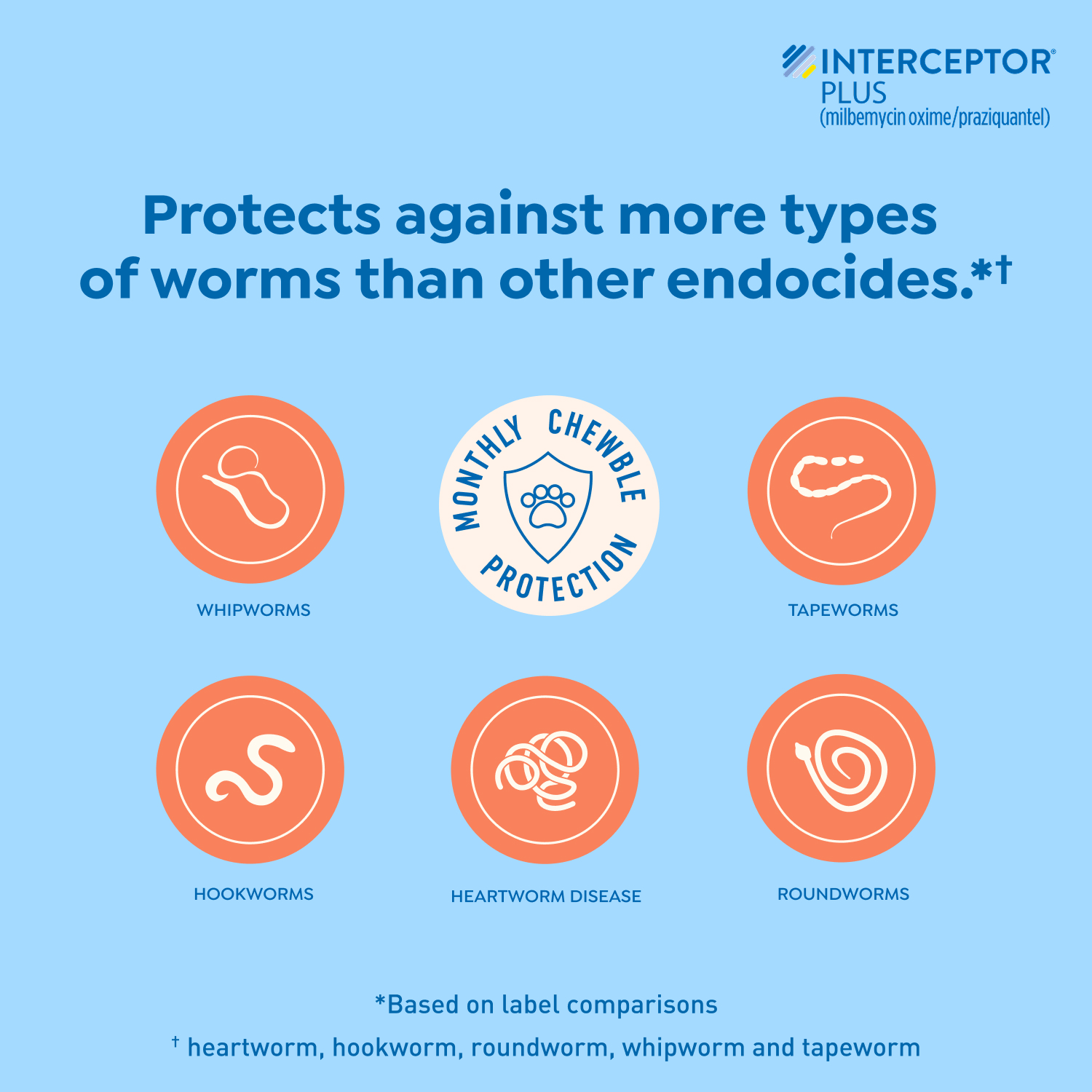 Elanco Item # CA544469VAM Product Title Interceptor Plus Prevention for Heartworm + 4 Other Worms for Dogs 8.1-25 lbs. | 6 Chews, 6-Month Supply Product Class Rx Each - UPC 727804561659 Brand Interceptor Plus Item Name Interceptor Plus - 6 doses/card - Green (5.7 mg/57 mg) Country of Origin France Long Description If your dog is only protected from heartworm disease, there’s a gap in their coverage. Close the gap with Interceptor Plus. Interceptor Plus also treats and controls four other major worms including adult roundworm, hookworm, whipworm and tapeworm infections in dogs and puppies. That’s protection against more types of worms than Heartgard Plus. Unlike Interceptor Plus, both Heartgard Plus (ivermectin/pyrantel) and Simparica Trio (sarolaner, moxidectin, and pyrantel chewable tablets) do not cover tapeworm or whipworm.* When untreated, intestinal worms can cause discomfort and fatigue with diarrhea, weight loss, anemia and more. That’s why Interceptor Plus makes dosing easy and convenient with 5-in-1 protection in a tasty, chicken-flavored chew. No need to hide pills in food-pockets. This chewable heartworm prevention goes down easy and keeps the protection going strong for a month. Interceptor Plus heartworm prevention is only available by prescription. Dogs must be at least six weeks old and weigh 8.1 - 25.0 lbs. to use this dose of Interceptor Plus. Never miss a monthly treatment when you subscribe to convenient, regular doorstep deliveries of 1-dose, 6-dose or 12-dose packs. Before starting any heartworm prevention program, it’s important for your veterinarian to test your dog for an existing heartworm infection. At your next visit, tell your veterinarian you want PLUS-level protection for your loyal pup so you can enjoy peace of mind in all of their favorite places – from the backyard to the dog park. Interceptor Plus is a trademark of Elanco or its affiliates. All other product names are trademarks of their respective owners *Heartgard Plus protects against heartworm disease, hookworms (A. caninum, U. stenocephala, A. braziliense), and roundworms. Simparica TRIO protects against heartworm disease, hookworms (A. caninum, U. stenocephala), and roundworms. Short Description Interceptor Plus for dogs 8.1 - 25.0 lbs offers 5-in-1 protection from major worms in a tasty, monthly chew. Key Bullet 1 Interceptor PLUS protects against more types of worms* than other formulas Key Bullet 2 Tasty, monthly chicken-flavored chew with real chicken, making dosing easy Key Bullet 3 Prevents heartworm disease plus treats and controls adult hookworm, roundworm, whipworm and tapeworm infections Key Bullet 4 Covers worms* commonly found in dog parks trails, backyards or carried by mosquitoes Key Bullet 5 Delivers protection for a full month * Heartworm, hookworm, roundworm, whipworm and tapeworm Species Dog Directions for Use You can give Interceptor Plus to your dog by hand or by adding it to a small amount of dog food. Administer the chewable in a manner that encourages your dog to chew, rather than swallow without chewing. If your dog normally swallows treats whole, you may break the chewable into pieces and feed them to your dog. Make sure that your dog consumes the complete dose and observe your pet for a few minutes after the administration to ensure that no part of the dose is lost or rejected. If you suspect that any of the dose has been lost, redosing is recommended. Consult your veterinarian regarding the need for year-round administration of Interceptor Plus. To help you remember to dose monthly, each box contains stick-on labels for your calendar. Storage Instructions Store at room temperature, between 59° and 77°F (15-25°C). Active Ingredients Milbemycin Oxime; Praziquantel Product Form Chewable Tablet Pet Size Medium Pet Lifestage 6 weeks and older Pet Weight 8.1-25 lbs Product Label URL https://www.elancolabels.com/us/interceptor-plus Clamshelled Version? No Each - Package Type Box Dimensions UoM in Each - Height 6.25 Each - Length 1.5 Each - Width 3.8 Master Case - Qty 60 Master Case - Height 13.125 Master Case - Length 16.375 Master Case - Width 12.25 Pallet Height (including pallet) 45.5 Pack Count 6 Prop 65 Warning Required? No State Registration Reqd? No