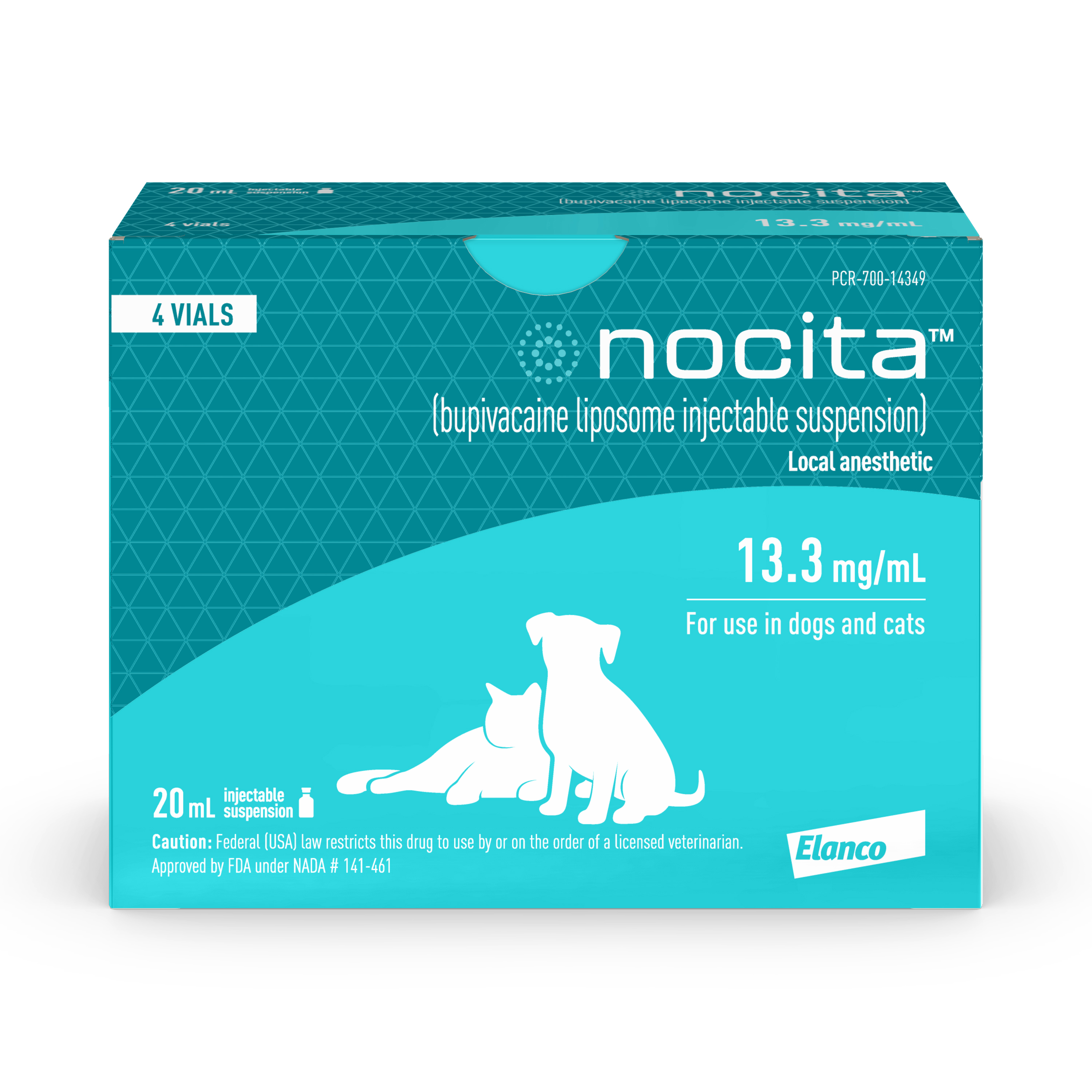 Elanco Item # CA553120HAMAP Product Title Nocita 20 mL, 4 Count Product Class Rx Each - UPC 00727804562519 Brand Nocita Item Name NOCITA 20ML 1DOSE X4VIAL AMAP Species Cat Storage Instructions Unopened vials should be stored refrigerated between 36°F to 46°F (2°C to 8°C). NOCITA may be held at a controlled room temperature of 68°F to 77°F (20°C to 25°C) for up to 30 days in sealed, intact (unopened) vials. Do not re-refrigerate. Do Not Freeze. Active Ingredients Bupivacaine Product Form Liquid Pet Lifestage 5 months and older Pet Weight All Product Label URL https://www.elancolabels.com/us/nocita Clamshelled Version? No Each - Package Type Box Pack Count 1 Prop 65 Warning Required? No State Registration Reqd? No