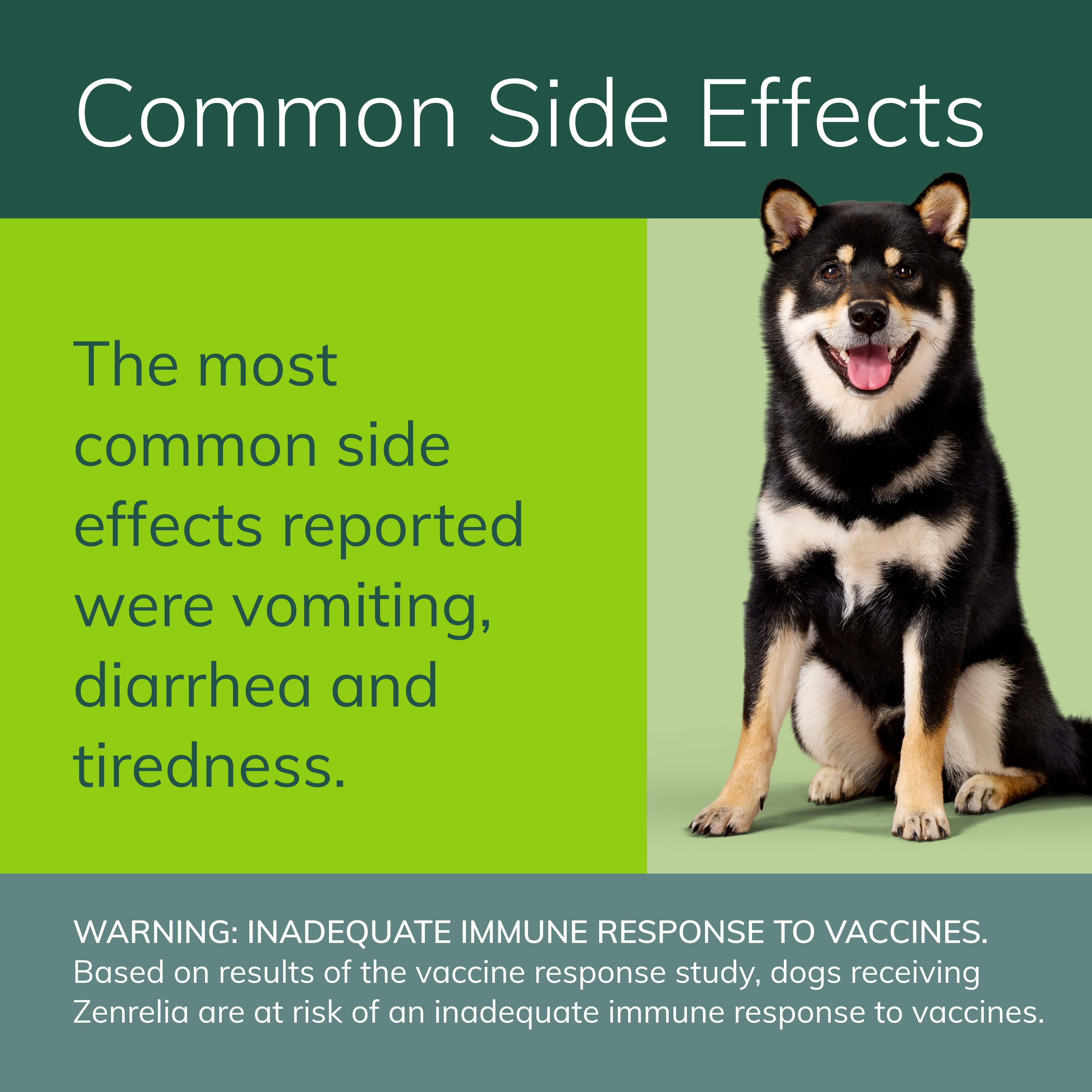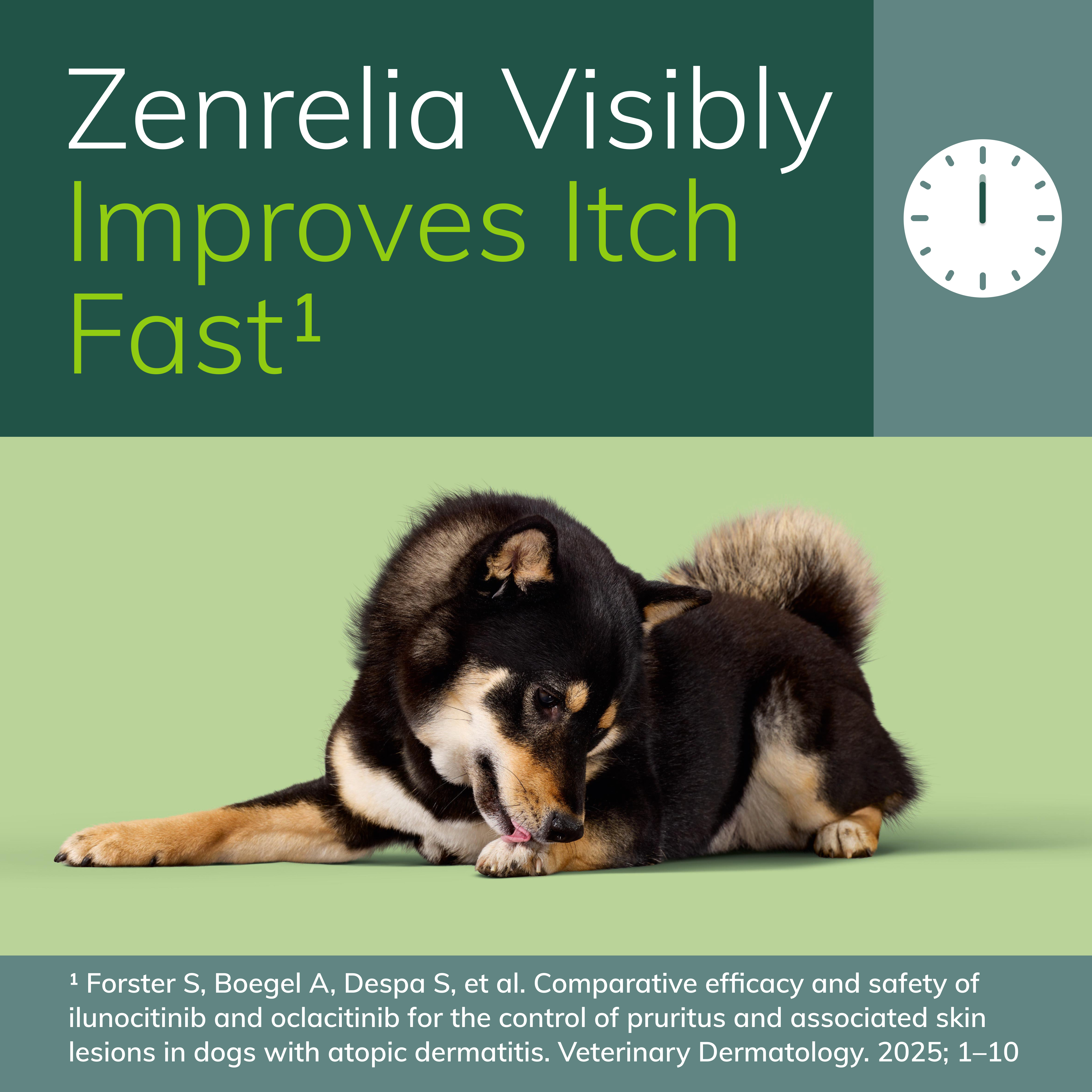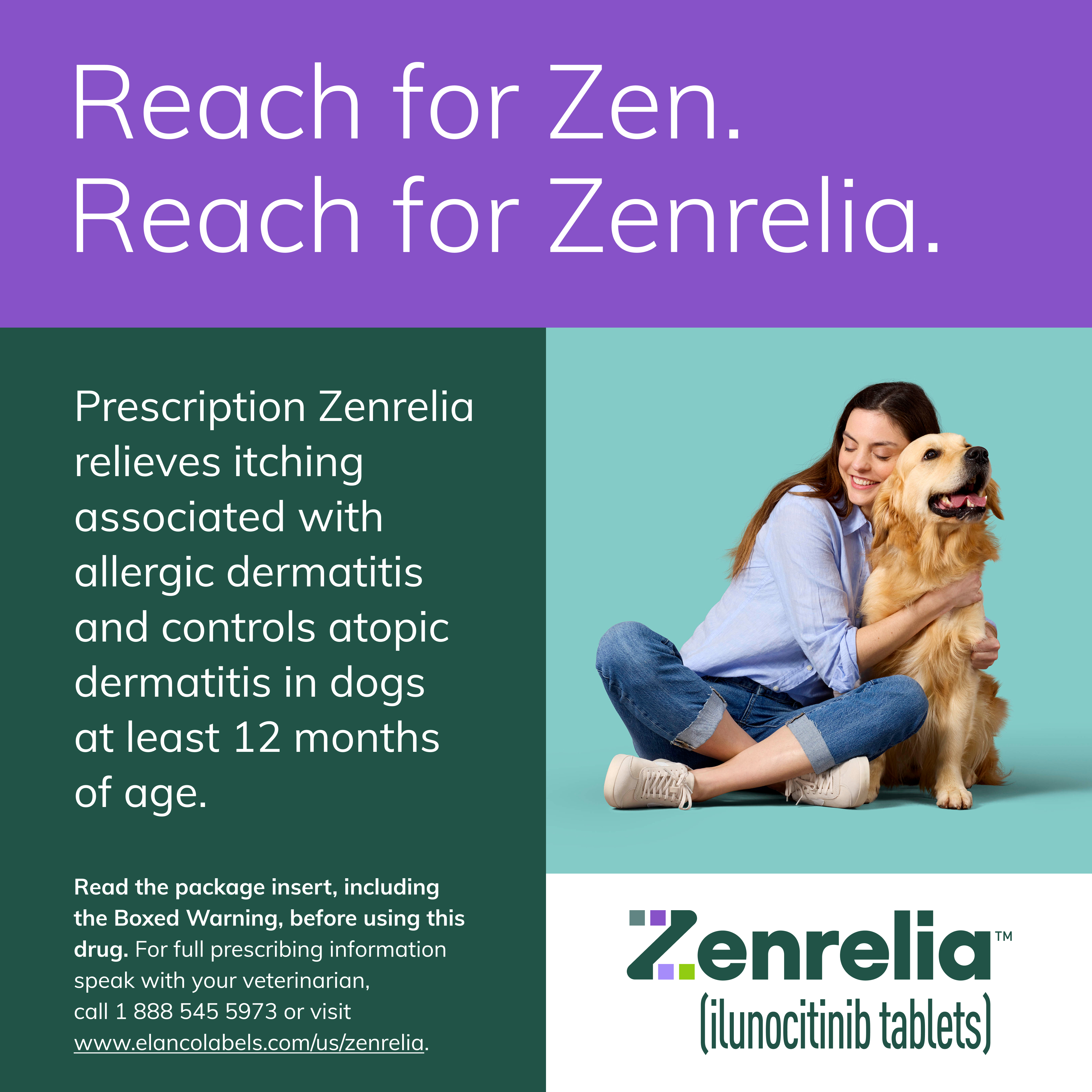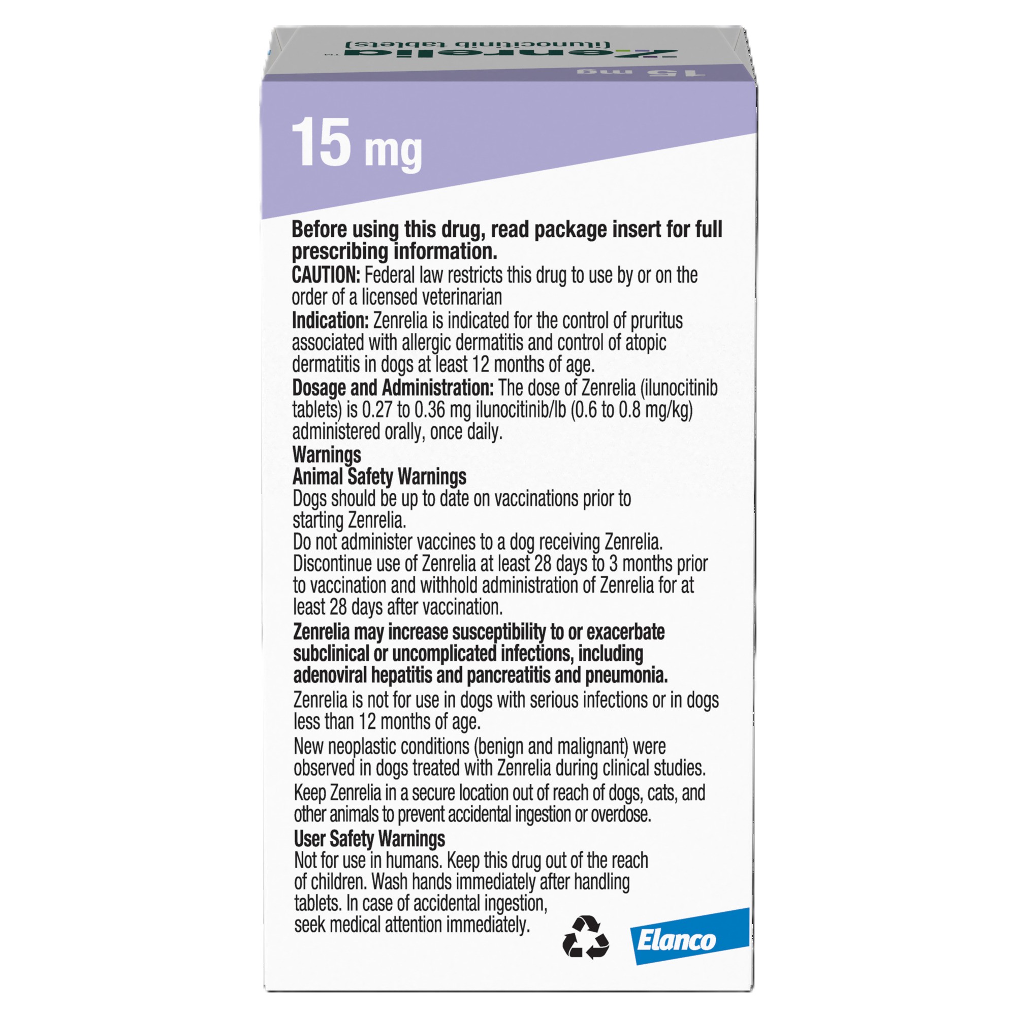 Elanco Item # CA5539090AM Product Title Zenrelia (Ilunocitinib Tablet) | Once Daily Prescription Itch Relief for Dogs | 15 mg (90 Count) Product Class Rx Each - UPC 00727804002145 Brand Zenrelia Item Name Zenrelia for Dogs 15 mg - 90 Tablets Country of Origin Germany Long Description Allergic dermatitis can make your dog very uncomfortable. Symptoms like excessive itching, scratching, and biting aren't only disruptive to you and your pet, but they can also cause more severe problems over time, including hair loss and skin infection. Zenrelia (ilunocitinib tablets) is a once-daily tablet that relieves itching due to allergic dermatitis and controls atopic dermatitis. Zenrelia is designed to begin working rapidly.* The active ingredient, ilunocitinib, reduces the inflammatory response in your dog's skin caused by allergies, making your dog feel less itchy. What's more, Zenrelia is designed to deliver continuous efficacy over the long term and can get your dog back to normal**. Dogs should not take Zenrelia for at least 28 days to 3 months prior to vaccination and should not take Zenrelia for at least 28 days after vaccination. Discuss your dog’s vaccine schedule with your veterinarian. Zenrelia is given once a day with or without food, so it may be easier to incorporate into your daily routine. Always follow your veterinarian's instructions. The most common side effects reported with this dog dermatitis treatment were vomiting, diarrhea and tiredness; see package insert including the Boxed Warning. Zenrelia is a prescription itch relief medication for dogs at least 12 months of age. Ask your veterinarian if Zenrelia can relieve itching in your dog due to allergic and atopic dermatitis. Fast relief for your best friend is also a relief for you. Spend more time doing the things you love, like cuddling and playing, and less time managing your dog's allergy symptoms. * Forster S, Boegel A, Despa S, et al. Comparative efficacy and safety of ilunocitinib and oclacitinib for the control of pruritus and associated skin lesions in dogs with atopic dermatitis. Veterinary Dermatology. 2025; 1–10 ** Clinical remission of itch demonstrated by a Normal-PVAS<2 Medium Description Zenrelia (ilunocitinib tablets) is a prescription itch relief medication for dogs that relieves itching due to allergic dermatitis and controls atopic dermatitis. The active ingredient, ilunocitinib, reduces the inflammatory response in your dog's skin caused by allergies, making them feel less itchy. What's more, Zenrelia is designed to deliver continuous efficacy over the long term and can get your dog back to normal**. Dogs should not take Zenrelia for at least 28 days to 3 months prior to vaccination and should not take Zenrelia for at least 28 days after vaccination. Discuss your dog’s vaccine schedule with your veterinarian. **Clinical remission of itch demonstrated by a Normal-PVAS<2 Short Description Zenrelia (ilunocitinib tablets) is a prescription itch relief medication for dogs that relieves itching due to allergic dermatitis and controls atopic dermatitis. The active ingredient, ilunocitinib, reduces the inflammatory response in your dog's skin caused by allergies, making them feel less itchy. What's more, Zenrelia is designed to deliver continuous efficacy over the long term and can get your dog back to normal**. Dogs should not take Zenrelia for at least 28 days to 3 months prior to vaccination and should not take Zenrelia for at least 28 days after vaccination. Discuss your dog’s vaccine schedule with your veterinarian. **Clinical remission of itch demonstrated by a Normal-PVAS<2 Key Bullet 1 Zenrelia relieves itching in dogs due to allergic dermatitis and controls atopic dermatitis Key Bullet 2 Zenrelia works fast, providing visible improvements in itch* * Forster S, Boegel A, Despa S, et al. Comparative efficacy and safety of ilunocitinib and oclacitinib for the control of pruritus and associated skin lesions in dogs with atopic dermatitis. Veterinary Dermatology. 2025; 1–10 Key Bullet 3 Ilunocitinib, the active ingredient in Zenrelia, works by reducing the itch and inflammatory response in your dog's skin due to allergies Key Bullet 4 The most common side effects reported with this dog dermatitis treatment were vomiting, diarrhea and tiredness; see package insert including the Boxed Warning Key Bullet 5 The once-daily tablet can be given with or without food from the comfort of your home Species Dog Directions for Use Once daily, oral tablet for the control of itch associated with allergic and atopic dermatitis, in dogs 12 months and up. Storage Instructions Store at room temperature between 15-25 C (59 to 77 F) Active Ingredients ilunocitinib Product Form Tablet Product Label URL http://www.elancolabels.com/us/zenrelia Clamshelled Version? No Dimensions UoM in Weight UoM lb Master Case - Height 8.5 Master Case - Length 12.75 Master Case - Width 8.9 Master Case - Weight 9.67