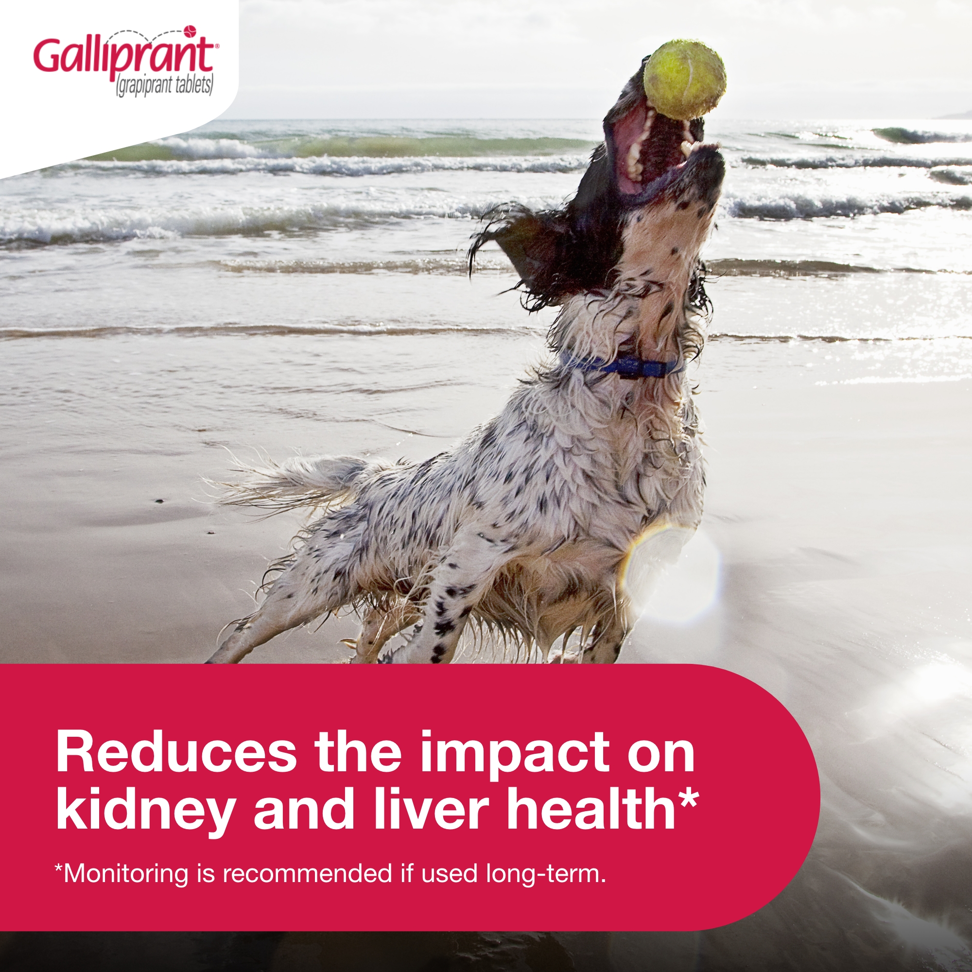 Elanco Item # CA5812090AM Product Title Galliprant Osteoarthritis Pain & Inflammation Control for Dogs | 100 mg | 90 Flavored Tablets Product Class Rx Each - UPC 00854981006083 Brand Galliprant Item Name GALLIPRANT 100MG 90TAB X1BOTL AM Country of Origin United States Long Description Galliprant is the first-of-its-kind, non-steroidal, anti-inflammatory (NSAID) drug that delivers osteoarthritis (OA) pain and inflammation relief to your dog. Unlike traditional anti-inflammatories, Galliprant works differently by targeting osteoarthritis pain and inflammation at the source, while reducing the impact on kidney and liver health of treated dogs.* This unique drug is safe and approved to use daily, and can be used right from the start of your dog’s osteoarthritis treatment plan for as long as needed – which is important for dogs with a chronic disease like OA.** Osteoarthritis can be triggered by genetics, breed, body shape, or a number of other risk factors. Once osteoarthritis pain sets in, your dog is less likely to move and may experience weight gain. This can lead to more stress on joints and even more inflammation and pain. But Galliprant helps you bring that joy back to your pup’s daily routine. Galliprant’s unique treatment aims to break the osteoarthritis pain cycle: less pain and inflammation leads to more movement, and that can mean less weight gain and less joint stress for your dog. That’s why Galliprant makes delivering pain and inflammation relief so easy. Galliprant is a once-daily, pork-flavored, chewable tablet delivering the ultimate convenience in care. It can be given with or without food. Check the product label for information on potential side effects. Galliprant is available by prescription in 20mg, 60mg and 100mg doses in 30-count and 90-count packs. Your dog must be at least nine months old and weigh more than 8 lbs. to use Galliprant. The earlier osteoarthritis pain is detected, the sooner your veterinarian can start your dog on treatment. At your next visit, ask your veterinarian if Galliprant could help your dog and protect the moments that matter. Galliprant is a trademark of Elanco or its affiliates. *Monitoring is recommended if used long-term. ** Approved for use in dogs older than 9 months of age and greater than 8 pounds. Short Description Galliprant is a first-of-its-kind chewable that delivers osteoarthritis pain & inflammation relief to dogs. Key Bullet 1 Galliprant is the first-of-its-kind targeted non-steroidal anti-inflammatory drug (NSAID) for osteoarthritis (OA) pain and inflammation relief in dogs Key Bullet 2 Targets the source of the pain while reducing impact on kidney and liver health (Monitoring is recommended if used long-term.) Key Bullet 3 Targets canine OA pain and inflammation from first diagnosis (Approved for use in dogs older than 9 months of age and greater than 8 pounds) Key Bullet 4 Tasty, pork-flavored chewable tablet for easy daily dosing Key Bullet 5 Helps break the osteoarthritis pain cycle – more movement means less weight gain and less joint stress Species Dog Directions for Use Galliprant is admisitered orally. Consult your veterinarian for specific dosing instructions. Storage Instructions Store at or below 86°F (30°C). Active Ingredients Grapiprant Product Form Tablet Pet Lifestage 9 months and older Pet Weight 75.1-150 lbs Product Label URL https://www.elancolabels.com/us/galliprant-with-tear-off Clamshelled Version? No Each - Package Type Box Dimensions UoM in Each - Height 5 Each - Length 2.51 Each - Width 2.51 Master Case - Qty 48 Pack Count 90 Prop 65 Warning Required? No State Registration Reqd? No