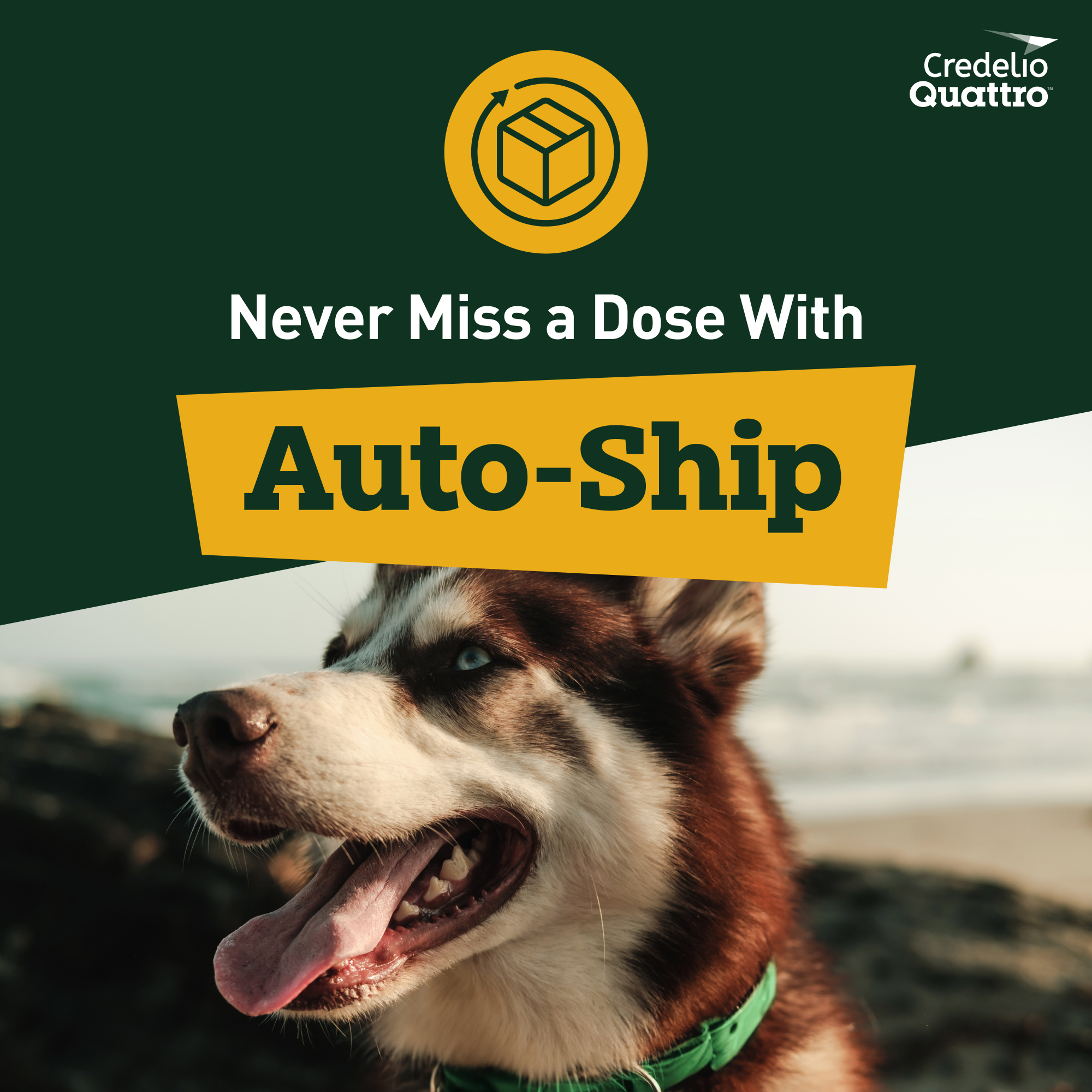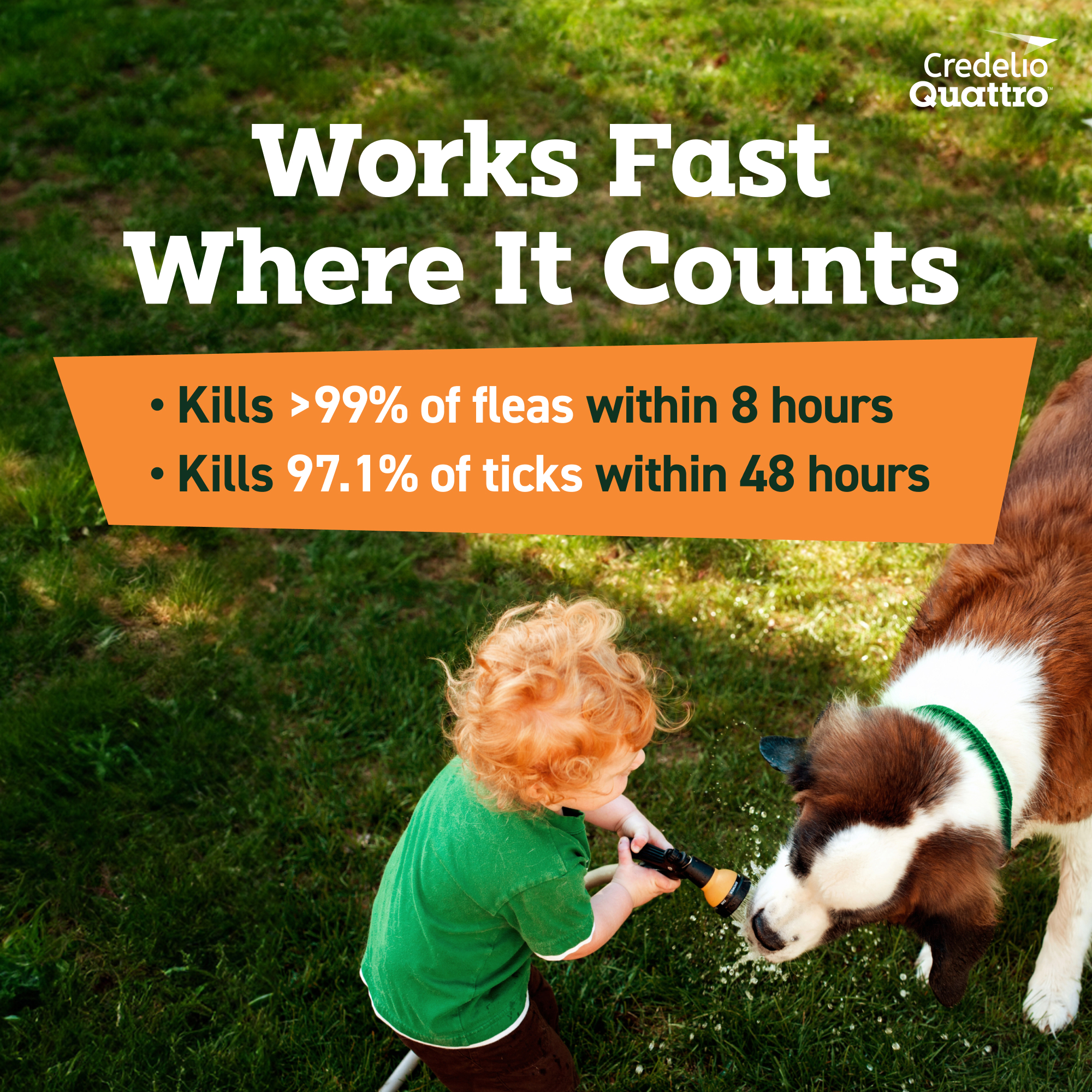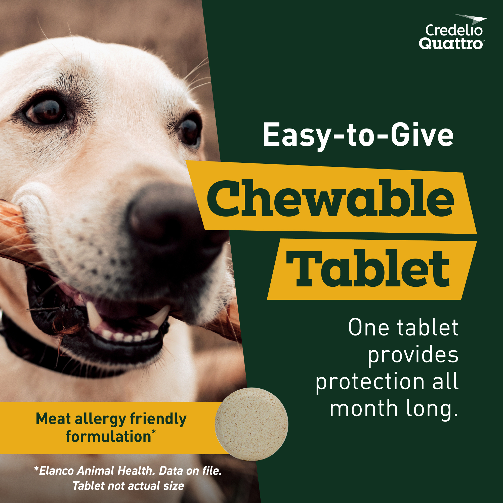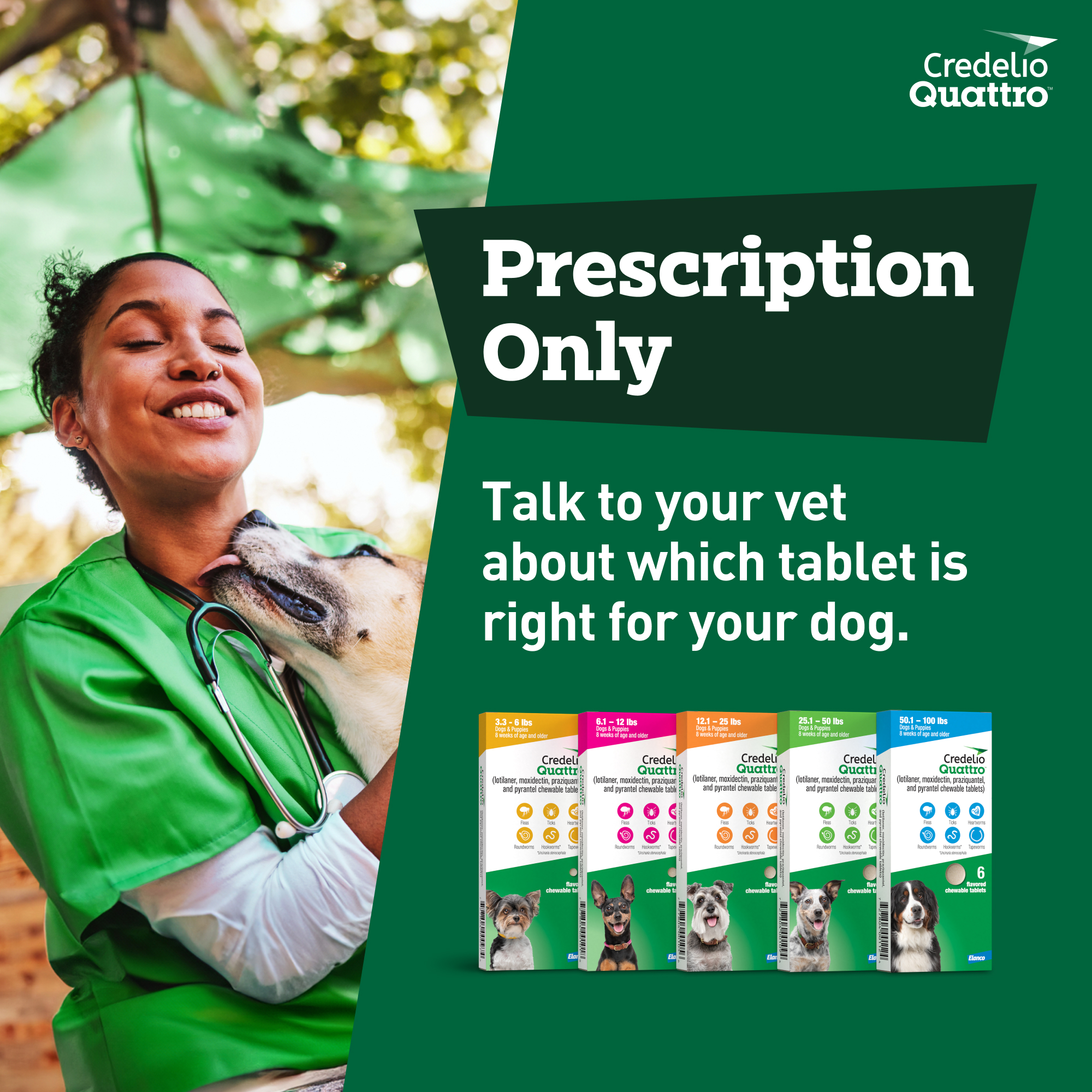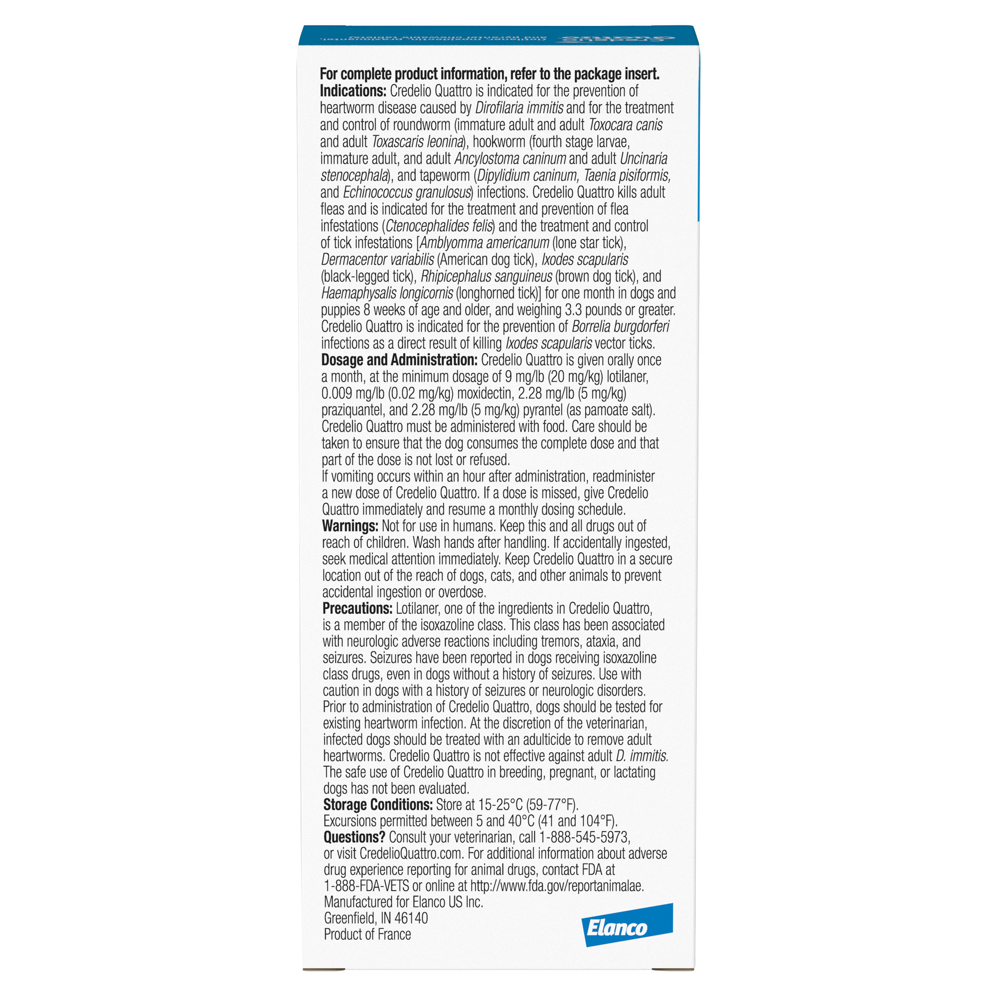 Elanco Item # CA5829006AM Product Title Credelio Quattro Chewable Tablets for Dogs 50.1-100 lbs, 6-in-1 Parasite Protection (6 Month Supply) Product Class Rx Each - UPC 00727804001148 Brand Credelio Quattro Item Name CREDELIO QUATTRO 900MG 3TAB X2BC AM Country of Origin France Long Description Credelio Quattro (lotilaner, moxidectin, praziquantel, and pyrantel chewable tablets) is the broadest parasite protection of its kind* covering 6 types of parasites in one chewable tablet. It protects against ticks, fleas, heartworm disease and the three intestinal worms that can be passed to humans — tapeworms, roundworms and hookworms. Credelio Quattro is effective and works fast where it counts. It kills >99% of fleas within 8 hours of administration and remains effective for an entire month. What's more, Credelio Quattro contains lotilaner that kills ticks** faster† than sarolaner in Simparica Trio and afoxolaner in NexGard1. This FDA-approved medication delivers all the protection your dog needs in a convenient monthly chewable. It uses four powerful ingredients to provide the broadest* protection that lasts all month long by covering 6 types of parasites. Credelio Quattro comes in a tasty, easy-to-give chewable that's also meat allergy friendly***. In fact, Credelio Quattro was accepted by nearly 9 out of 10 dogs. * Based on label comparison of the number of parasite types covered in a chewable that targets ticks ** Amblyomma americanum (lone star tick) *** Elanco Animal Health. Data on file. † Based on the time to statistical significance vs. control in a study. The study compared Credelio (lotilaner)—not Credelio Quattro, which contains lotilaner as well as moxidectin, praziquantel, and pyrantel—to the active ingredients in Simparica Trio (sarolaner, moxidectin, and pyrantel) and NexGard (afoxolaner). 1Reif KE, Kollasch T M, Neilson JC, Herrin BH, Ryan WG, Bell MC, Beltz MS, Dryden MW, Jesudoss Chelladurai JRJ, Miller KR, Sutherland CJ. Comparative speed of kill provided by lotilaner (Credelio), sarolaner (Simparica Trio), and afoxolaner (NexGard) to control Amblyomma americanum infestations on dogs. Parasit Vectors. 2024 Jul 20;17(1):313. Medium Description Credelio Quattro (lotilaner, moxidectin, praziquantel, and pyrantel chewable tablets) is the broadest parasite protection of its kind* covering 6 types of parasites in one chewable tablet. It protects against ticks, fleas, heartworm disease and three intestinal worms that can be passed to humans — tapeworms, roundworms and hookworms. Accepted by nearly 9 out of 10 dogs, Credelio Quattro comes in a tasty, easy-to-give chewable that's also meat allergy friendly** and gentle enough for puppies as small as 3.3 pounds and as young as 8 weeks. * Based on label comparison of the number of parasite types covered in a chewable that targets ticks ** Elanco Animal Health. Data on file. Short Description Credelio Quattro (lotilaner, moxidectin, praziquantel, and pyrantel chewable tablets) is the broadest parasite protection of its kind* covering 6 types of parasites in one chewable tablet. It protects against ticks, fleas, heartworm disease and three intestinal worms that can be passed to humans — tapeworms, roundworms and hookworms†. Accepted by nearly 9 out of 10 dogs, Credelio Quattro comes in a tasty, easy-to-give chewable that's also meat allergy friendly** and gentle enough for puppies as small as 3.3 pounds and as young as 8 weeks. * Based on label comparison of the number of parasite types covered in a chewable that targets ticks ** Elanco Animal Health. Data on file. Key Bullet 1 Credelio Quattro: The broadest parasite protection of its kind* covering 6 types of parasites in one chewable tablet *Based on label comparison of the number of parasite types covered in a chewable that targets ticks Key Bullet 2 Brings Peace of Mind: This monthly flea and tick treatment also protects against heartworm disease and three intestinal worms that can be passed to humans – roundworms, hookworms and tapeworms Key Bullet 3 Easy-to-Give Chewable: This FDA-approved parasite protection comes in a flavored chewable tablet that is given once a month with food Key Bullet 4 Prescription Only: Credelio Quattro is a prescription medication for puppies and dogs at least 8 weeks old and weighing at least 3.3 lbs. Key Bullet 5 6 Monthly Tablets: Contains a six-month supply of Credelio Quattro for Puppies & Dogs 50.1-100 lbs. (6 tablets) Species Dog Directions for Use Once monthly, flavored chewable tablet that protects dogs from ticks, fleas, heartworm disease and 3 types of intestinal worms, including tapeworms. Storage Instructions Store at 15-25 °C (59-77 °F). Excursions permitted between 5 and 40 °C (41 and 104 °F). Product Form Chewable Tablet Product Label URL http://elancolabels.com/us/credelio-quattro Clamshelled Version? No Dimensions UoM in Weight UoM lb Each - Height 0.79 Each - Length 5.6 Each - Width 2.4 Each - Weight 0.097788241 Inner Case - Qty 10 Master Case - Qty 120 Master Case - Height 14.375 Master Case - Length 18.125 Master Case - Width 10.56 Master Case - Weight 6559.72 Inner Packs Per Master 12