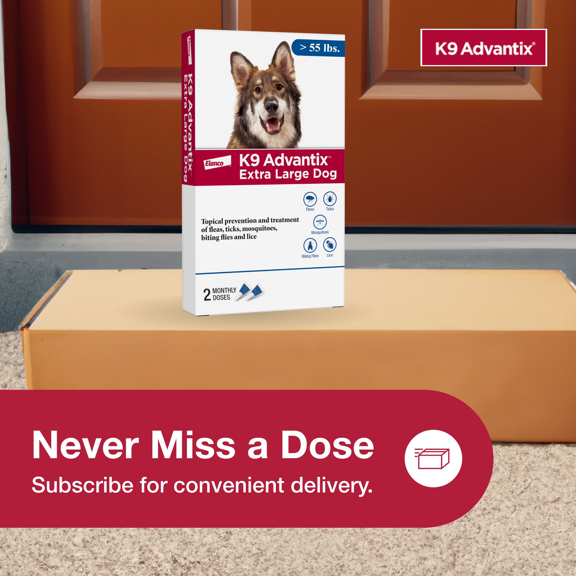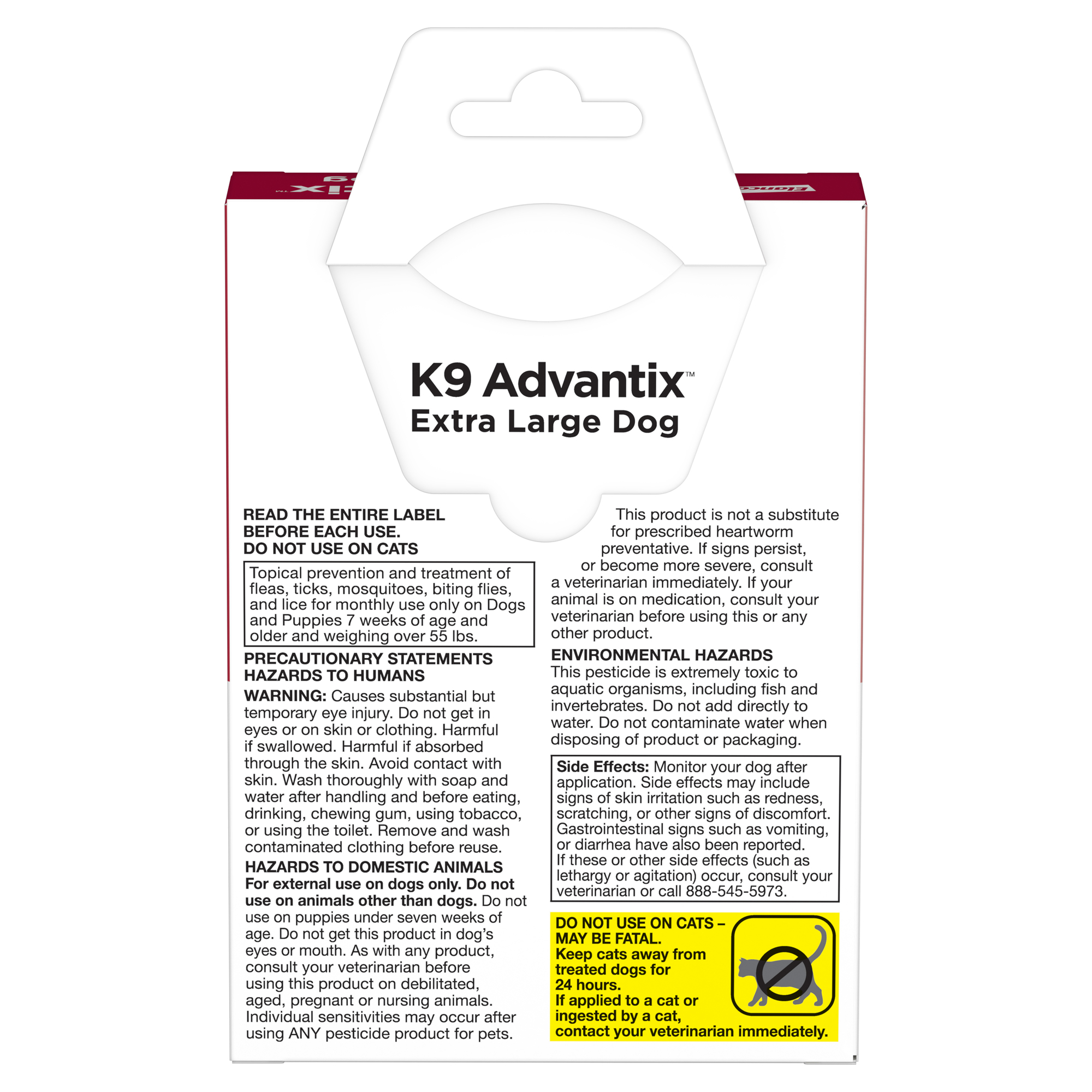 Elanco Item # CA999524AAM01 Product Title K9 Advantix Flea, Tick & Mosquito Prevention & Treatment for Dogs Over 55 lbs. | Flea Drops for Extra Large Dogs | Apply Monthly | 2 Treatments Product Class OTC Each - UPC 727804566562 Brand K9 Advantix Item Name K9 Advantix Flea, Tick & Mosquito Prevention for Extra Large Dogs Over 55 lbs., 2-Monthly Treatments Country of Origin Germany Long Description K9 Advantix is a topical prevention and treatment of fleas, ticks, mosquitoes, biting flies, and lice on dogs. These flea drops for extra-large dogs kill fleas within 12 hours of application. K9 Advantix doesn't just stop existing flea infestations on dogs, it also prevents new ones by killing adult fleas through contact before they lay new eggs. What's more, this topical flea treatment is fragrance-free and it's waterproof after 24 hours of initial application. Best of all, K9 Advantix is available without a prescription. K9 Advantix helps you and your dog get back to the things you love most. Your dog must be at least 7 weeks old and weigh over 55 lbs. to use K9 Advantix Extra Large Dog. Use as directed by label. Do not use on cats. Medium Description K9 Advantix is a topical prevention and treatment of fleas, ticks, mosquitoes, biting flies, and lice on dogs. These flea drops for extra-large dogs kill fleas within 12 hours of application. K9 Advantix doesn't just stop existing flea infestations on dogs, it also prevents new ones by killing adult fleas through contact before they lay new eggs. What's more, this topical flea treatment is fragrance-free and it's waterproof after 24 hours of initial application. Best of all, K9 Advantix is available without a prescription. K9 Advantix helps you and your dog get back to the things you love most. Your dog must be at least 7 weeks old and weigh over 55 lbs. to use K9 Advantix Extra Large Dog. Use as directed by label. Do not use on cats. Short Description K9 Advantix is a topical prevention and treatment of fleas, ticks, mosquitoes, biting flies, and lice on dogs. These flea drops for extra-large dogs kill fleas within 12 hours of application. K9 Advantix doesn't just stop existing flea infestations on dogs, it also prevents new ones by killing adult fleas through contact before they lay new eggs. What's more, this topical flea treatment is fragrance-free and it's waterproof after 24 hours of initial application. No prescription needed. Your dog must be at least 7 weeks old and weigh over 55 lbs. to use K9 Advantix Extra Large Dog. Use as directed by label. Do not use on cats. Key Bullet 1 An excellent value from the K9 Advantix brand Key Bullet 2 K9 Advantix Extra Large Dog 30-day treatment & prevention protects dogs over 55 lbs. from fleas, ticks, mosquitoes, biting flies, and lice Key Bullet 3 Effective formula works through contact to kill fleas on dogs within 12 hours of application Key Bullet 4 Easy-to-apply topical treatment is fragrance-free and waterproof after 24 hours Key Bullet 5 No prescription needed Key Bullet 6 Contains: Two (2) monthly doses of K9 Advantix Flea, Tick & Mosquito Prevention & Treatment for Extra Large Dogs Over 55 lbs. Species Dog Directions for Use Use only on dogs. DO NOT USE ON CATS or other animals. Do not apply to dogs weighing less than 4 lbs. Remove applicator tube from the package. Use scissors and peel down foil. Hold applicator tube in an upright position. Pull cap off tube. Turn cap around and place other end of cap back on tube. Twist cap to break seal, then remove cap from tube. The dog should be standing for easy application. Evenly apply entire contents of the tube along the top of the dog's back, from the shoulder down to the base of the tail. The number of spots depends on the size and weight of your dog (please refer to the product label). At each spot, part the hair until skin is visible. Place the tip of the tube on the skin and gently squeeze to expel a portion of the solution on the skin. Do not apply an excessive amount of solution at any one spot that could cause some of the solution to run off the side of the dog. Do not get this product in your dog’s eyes, or allow your dog to ingest this product. Storage Instructions Store in a cool, dry place. Protect from freezing. Active Ingredients Imidacloprid Permethrin Product Form Topical Pet Size Extra Large Pet Lifestage 7 weeks and older Pet Weight Over 55 lbs Clamshelled Version? Yes Each - Height 6.3 Each - Length 1.5 Each - Width 4.5 Each - Weight 0.04 Inner Case - Qty 4 Master Case - Qty 24 Master Case - UPC/GTIN 20727804003689 Master Case - Height 7.2 Master Case - Length 19.3 Master Case - Width 9.7 Master Case - Weight 2.2 Pallet - Number of layers 6 Pallet Height (including pallet) 49 Unit Count 2 Unit Count Type Count Pack Count 2 Prop 65 Warning Required? No EPA Reg # 11556-134