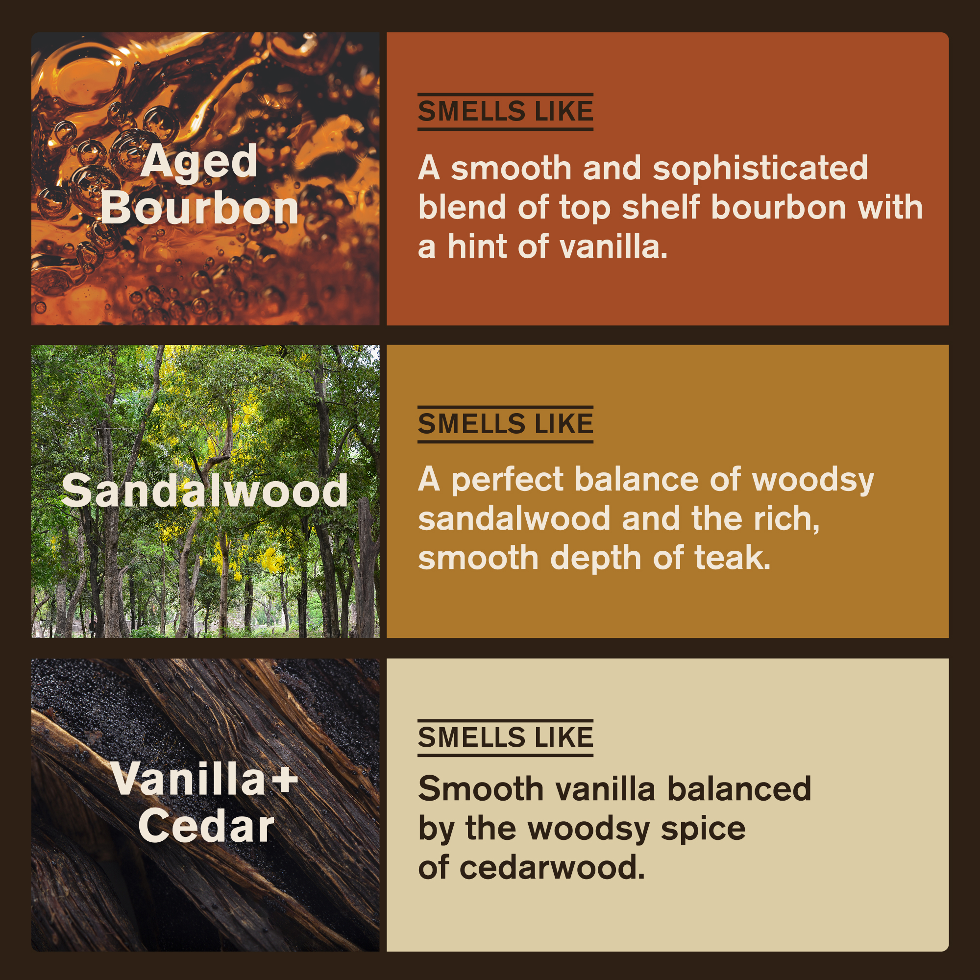 | Bullet Point 2 | OUTDOOR INSPIRED SCENTS: Our Sandalwood has a warm amber and sandalwood scent complemented by vetiver and vanilla; our Aged Bourbon is sweet and smooth, with a perky hint of conifers; our Vanilla + Cedar is smooth with a hint of ruggedness. |