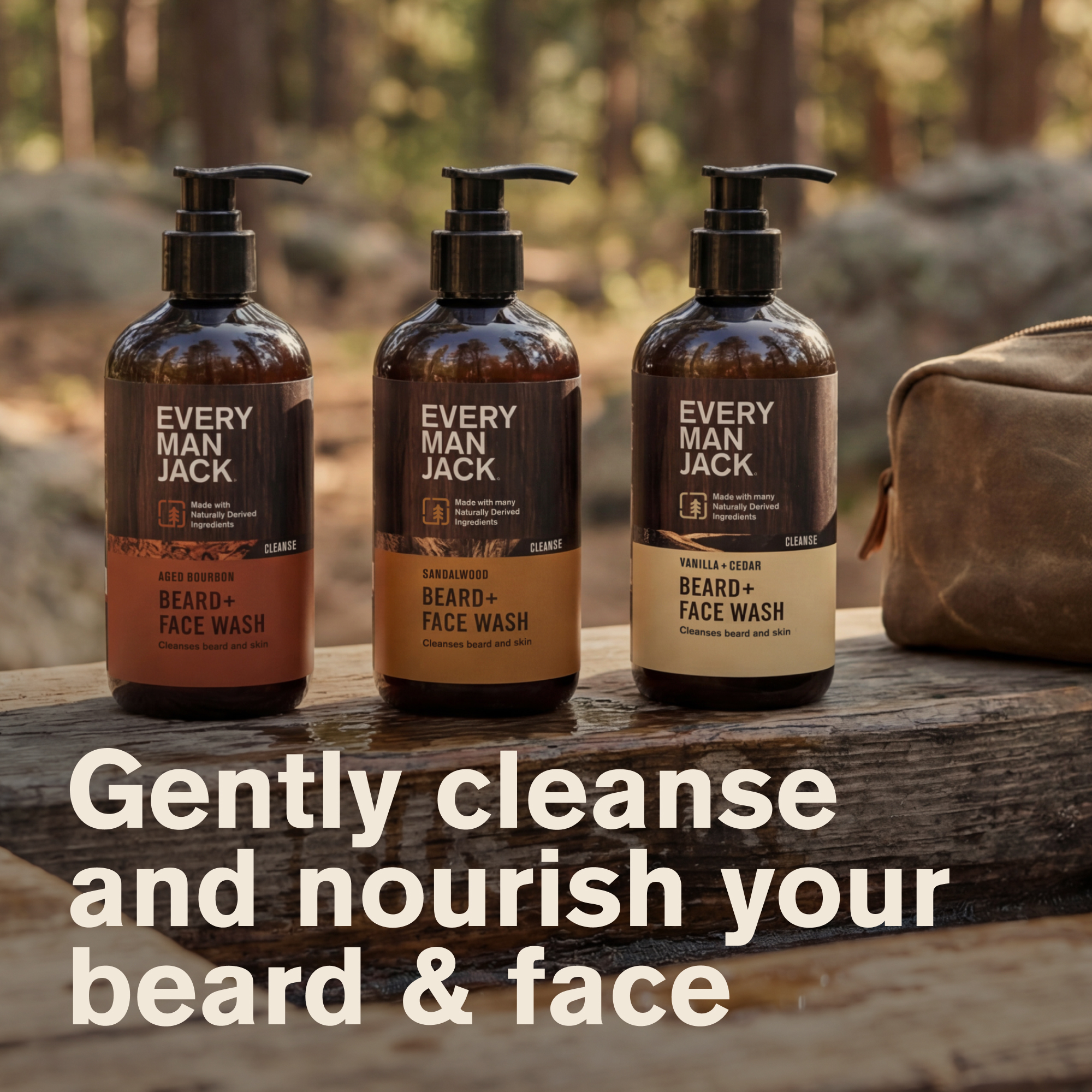 | Amazon Product Description | Every Man Jack Beard Wash Variety Pack for Men – Full Size 3-Pack Variety with Sandalwood, Vanilla + Cedar & Aged Bourbon Scents – Naturally Derived w/Aloe and Glycerin – 6.7 fl oz (3 Pack). This beard wash cleanses and nourishes your beard, starting your beard care routine with a fresh face by washing off sweat and sandwiches without drying out your follicles. The variety pack features outdoor inspired scents including Sandalwood with a warm amber and sandalwood scent complemented by vetiver and vanilla, Aged Bourbon that is sweet and smooth with a perky hint of conifers, and Vanilla + Cedar that is smooth with a hint of ruggedness. The formula contains naturally derived ingredients that gently cleanse and hydrate your beard and the face below with coconut-based cleansers and Aloe Vera. The brand is trusted by more than 5 million men, born at the base of Mt. Tam, CA, proudly made in the US and B Corp Certified, and loved by millions of men the world over. Every Man Jack offers the dream team of beard care products from daily beard wash and hydrating oil to moisturizing butter or styling balm, putting together an all-star squad to complete your beard care routine. |