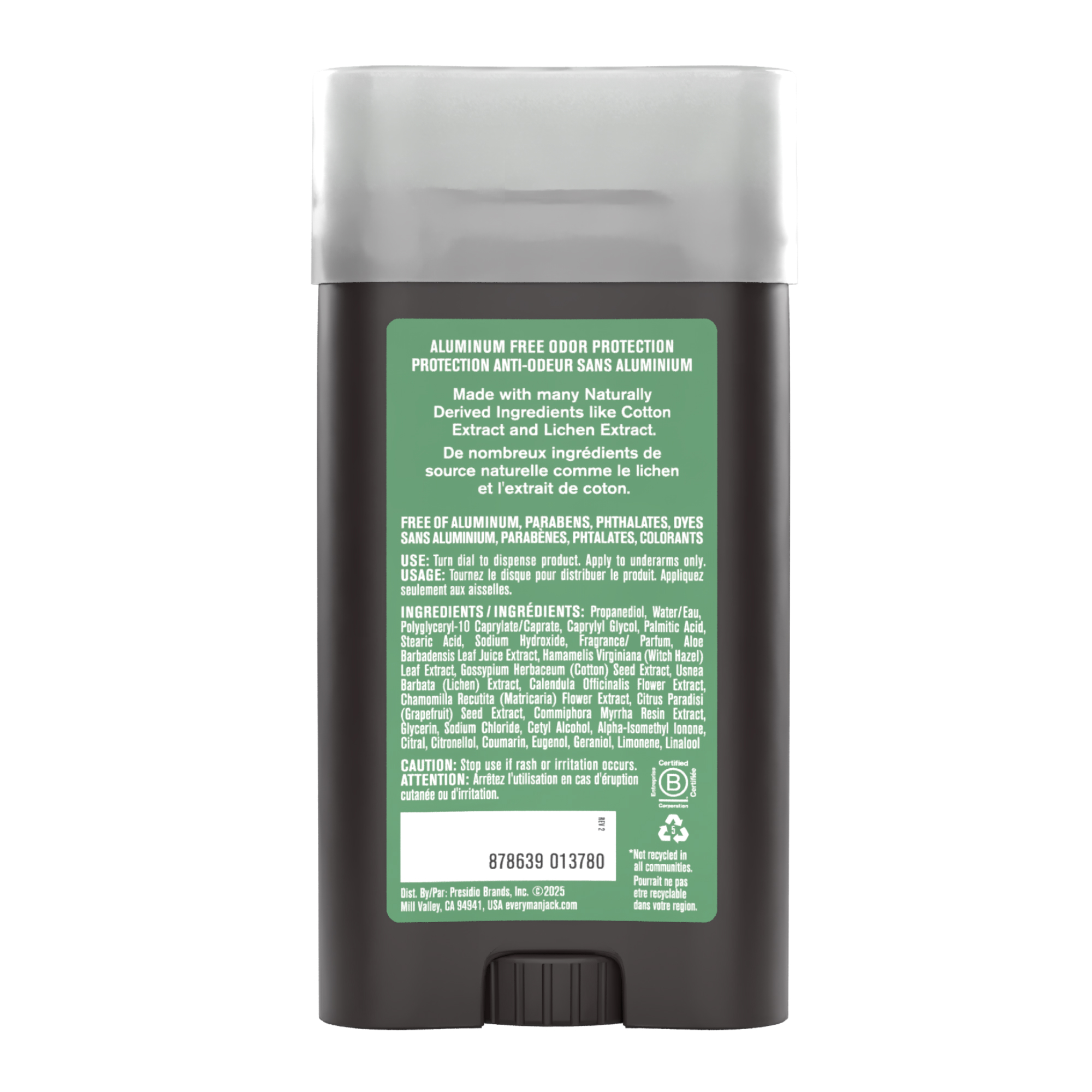 | Product Description | Long-lasting odor protection for every skin type. Each stick is packed with moisture absorbing Cotton Extract and Lichen Extract to help fight odor while corn-derived propanediol instead of aluminum conditions the skin. |