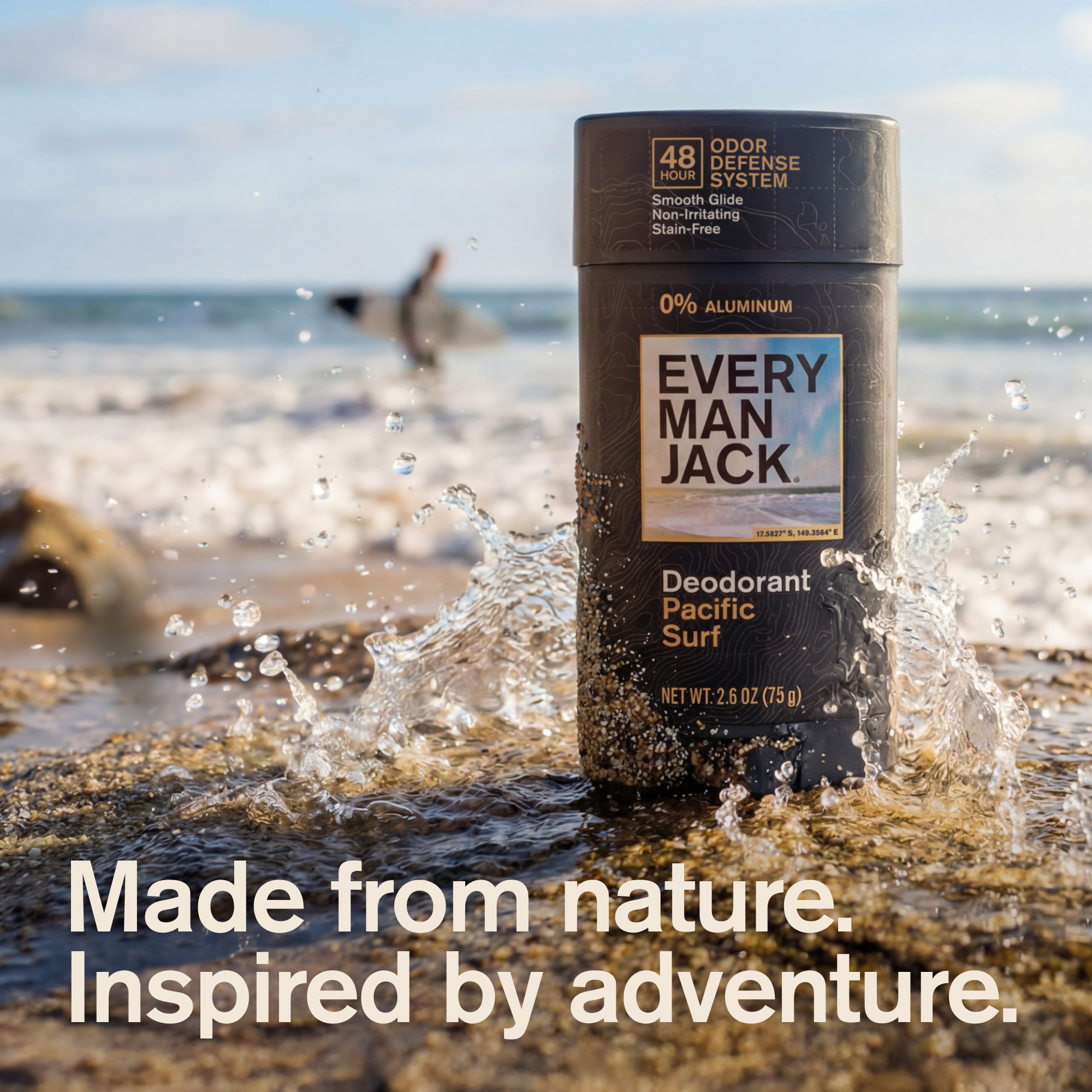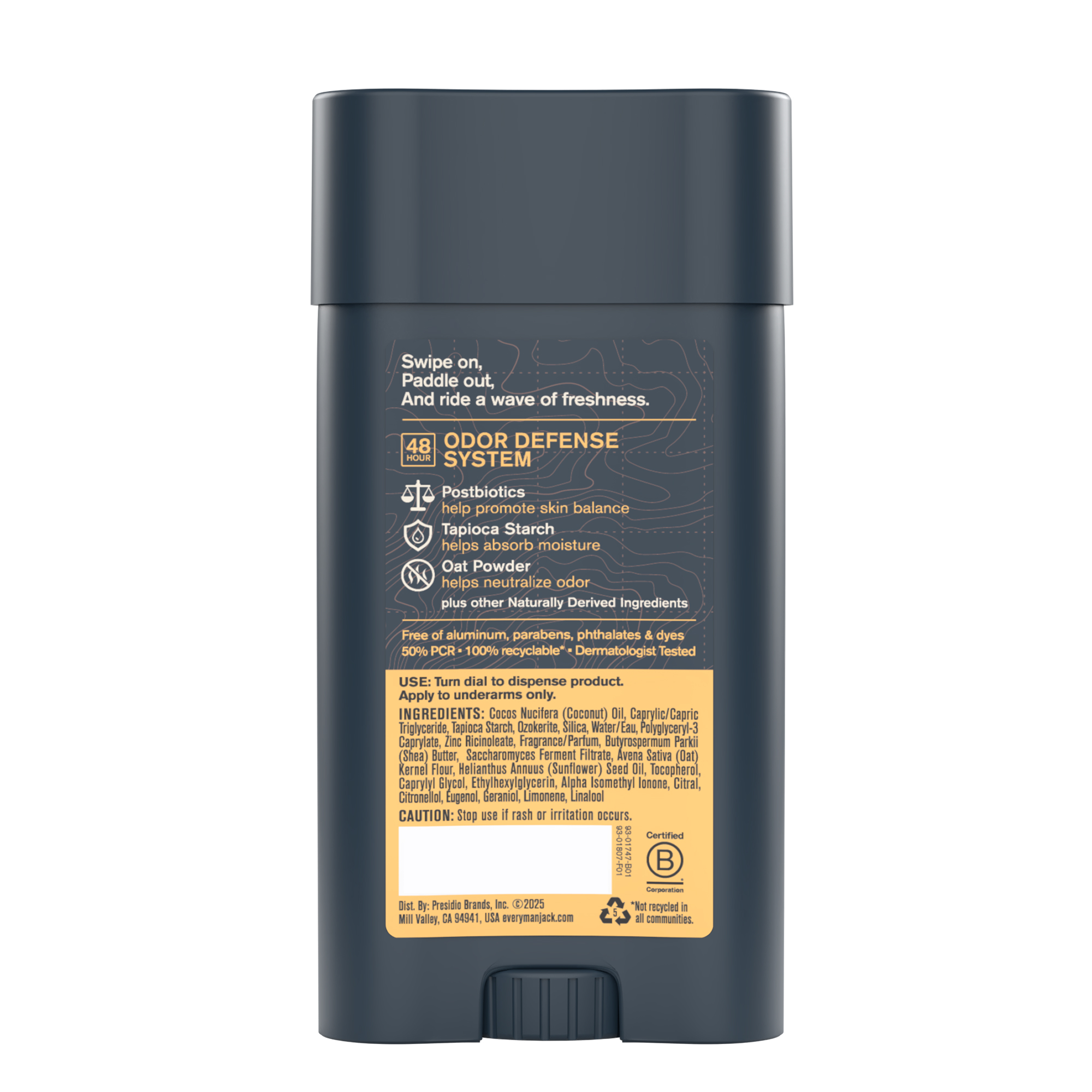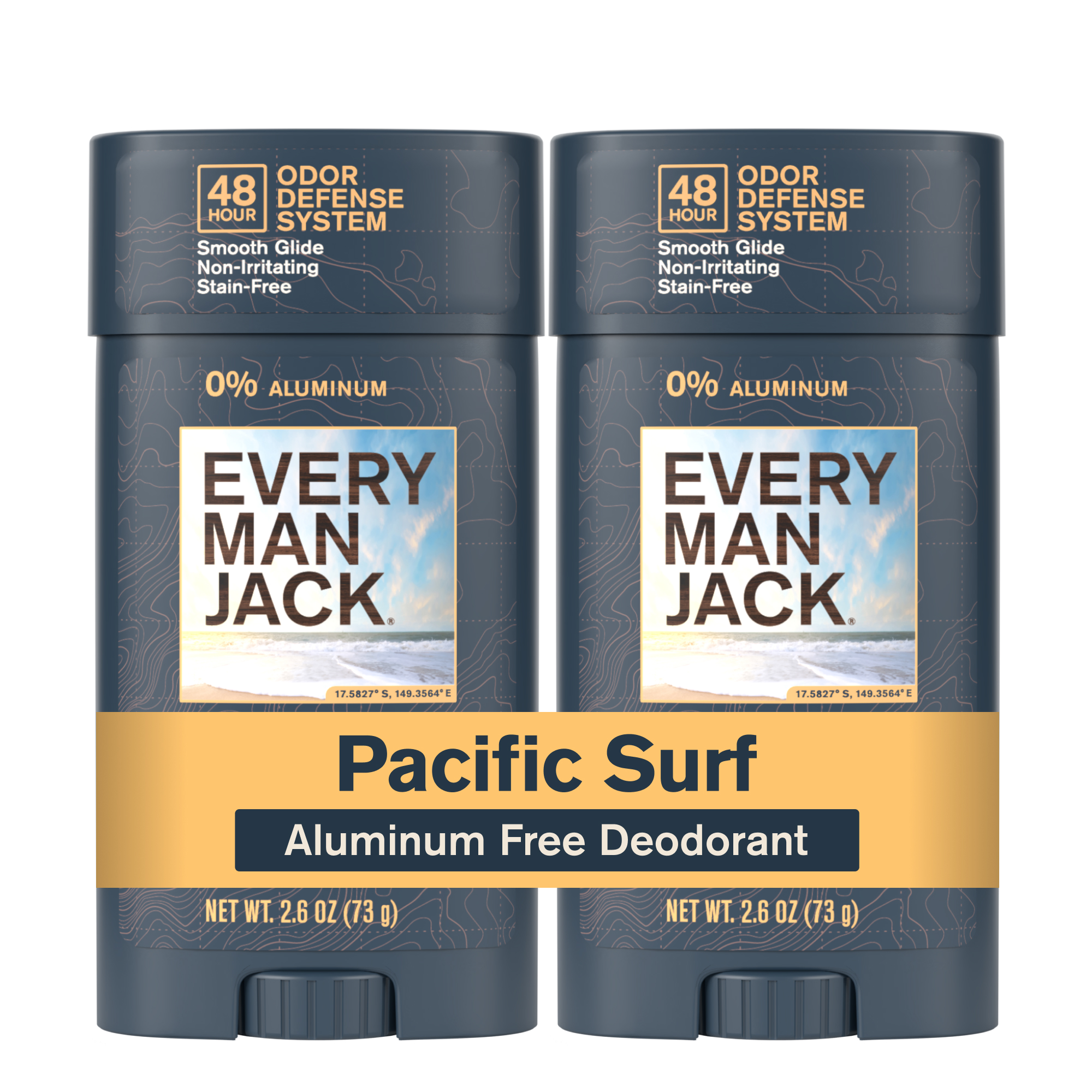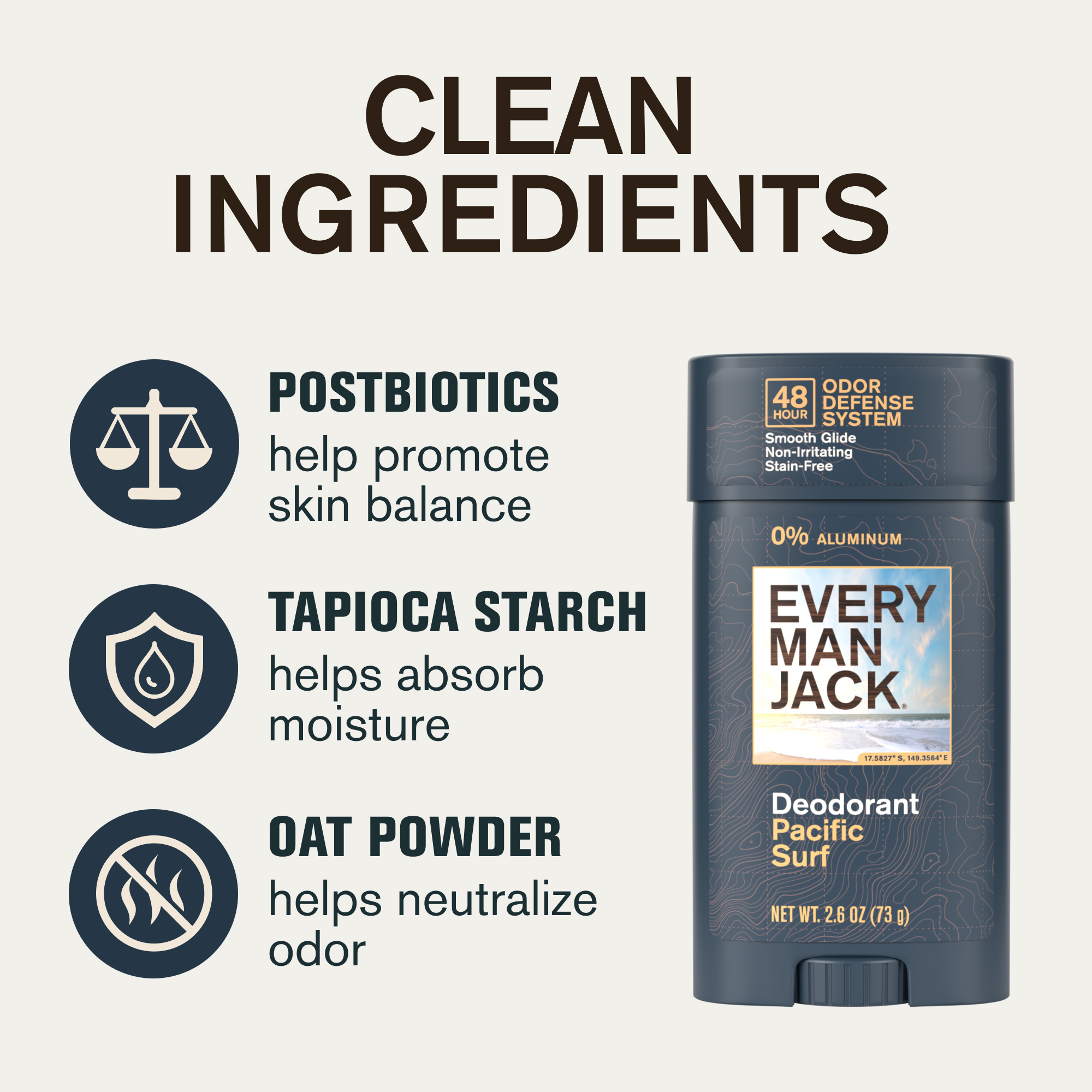 | Amazon Product Description | Every Man Jack Men's Deodorant - 48-Hour Odor Defense Blend - Aluminum Free - Contains Postbiotics, Tapioca Starch & Oat Powder - Pacific Surf Scent - 2.6 oz (2 Pack). This deodorant features state of the art pit protection with gentle, naturally derived ingredients that are incredible at neutralizing odor, a dermatologist-tested, aluminum free, non-irritating formula that goes on silky smooth without staining, and a sleek container that's 100% recyclable. The formula is a 48 hour odor fighter with ingredients that absorb moisture (tapioca starch), help neutralize odor (oat powder), and help support your skin's PH balance (postbiotics), featuring a squad of heavy hitters that work together to keep you smelling dangerously good for two days straight. The Pacific Surf scent lets you dive under the salty surf of the Pacific coast with the cool, invigorating scent of ocean air and refreshing citrus. The smarter packaging uses a flask design that's completely recyclable and uses 50% PCR (post-consumer recycled) material, for a smarter, more sustainable package to use 40% less plastic. Every Man Jack offers essentials upgraded, from body wash to beard care, hydrating lotions to odor-fighting deodorants, with rugged, masculine scents inspired by nature's best to give his routine a serious confidence boost. The brand is trusted by more than 5 million men, born at the base of Mt. Tam, CA, proudly made in the US and B Corp certified, and loved by millions of men the world over. |