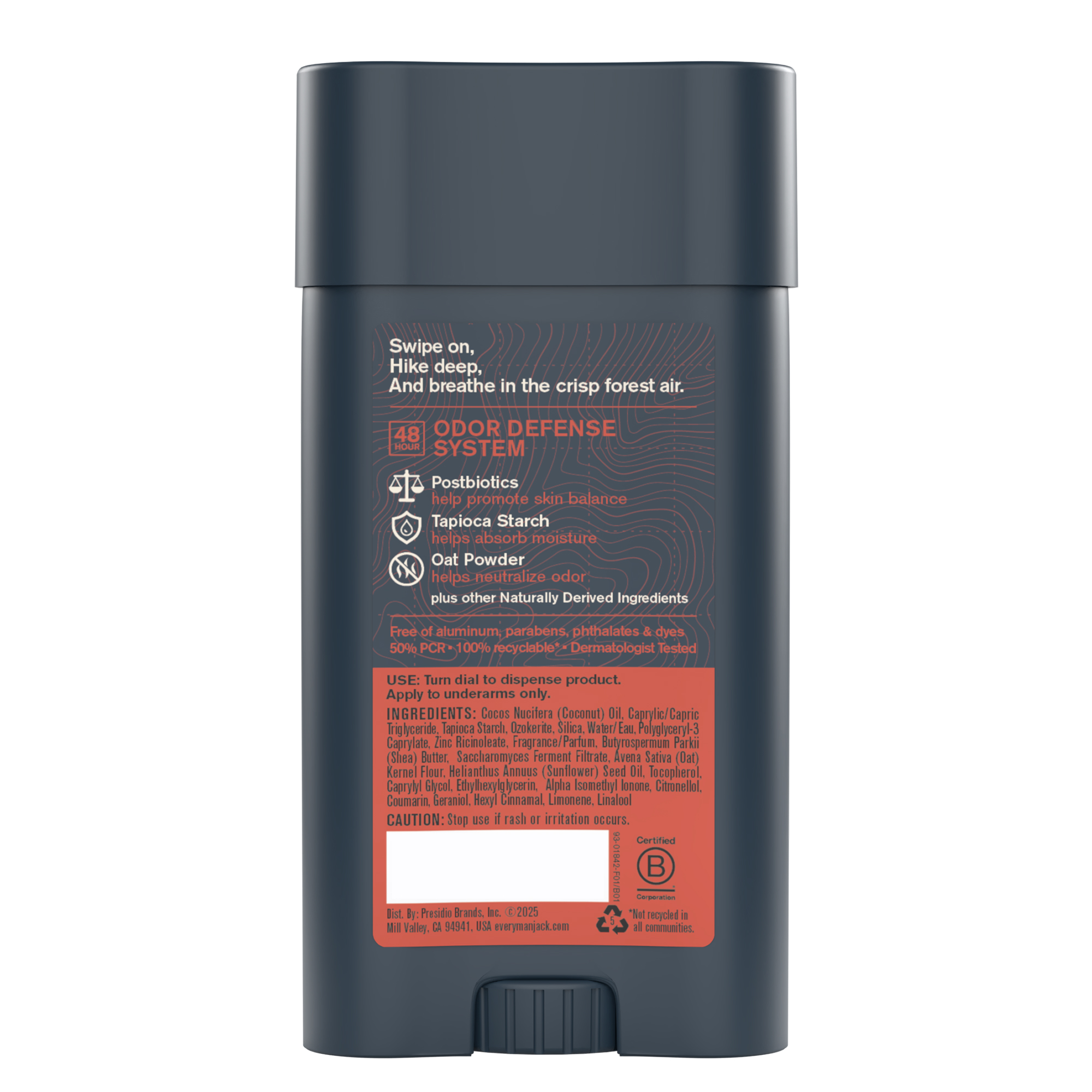 | Product Description | Get 48 hours of odor protection with our most advanced deodorant ever. Our Deodorant is state-of-the-art pit science, with powerful ingredients like tapioca starch, oat powder, and postbiotics that absorb moisture and lock out odor for two straight days. A formula that eliminates stink but goes on smooth? Smells like pure adventure but won’t stain your shirts? Crafted naturally without aluminum? Yeah, we don’t know how we did it either. |