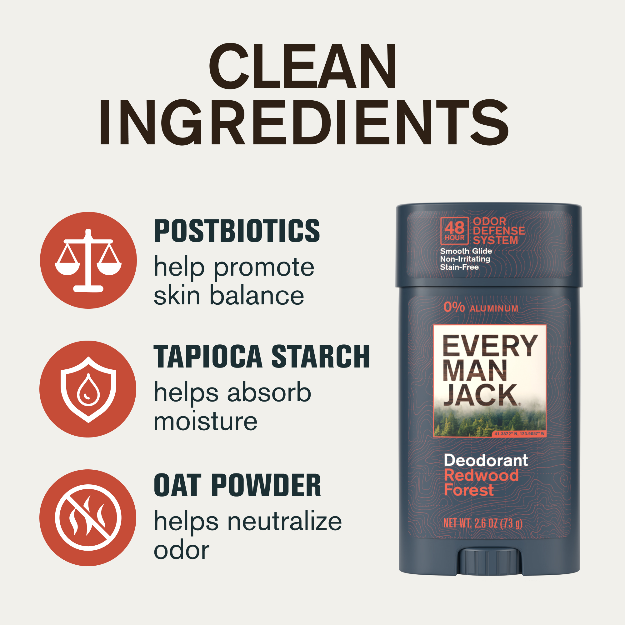 | Amazon Product Description | Every Man Jack Men's Deodorant - 48-Hour Odor Defense Blend - Aluminum Free - Contains Postbiotics, Tapioca Starch & Oat Powder - Redwood Forest Scent - 2.6 oz (2 Pack). This deodorant features state of the art pit protection with gentle, naturally derived ingredients that are incredible at neutralizing odor, a dermatologist-tested, aluminum free, non-irritating formula that goes on silky smooth without staining, and a sleek container that's 100% recyclable. The formula is a 48 hour odor fighter with ingredients that absorb moisture (tapioca starch), help neutralize odor (oat powder), and help support your skin's PH balance (postbiotics), featuring a squad of heavy hitters that work together to keep you smelling dangerously good for two days straight. The Redwood Forest scent is like wandering through a grove of towering redwood trees as you crush pine needles underfoot, evoking a crisp, shady hike through a lost forest. The smarter packaging uses a flask design that's completely recyclable and uses 50% PCR (post-consumer recycled) material, for a smarter, more sustainable package to use 40% less plastic. Every Man Jack offers essentials upgraded, from body wash to beard care, hydrating lotions to odor-fighting deodorants, with rugged, masculine scents inspired by nature's best to give his routine a serious confidence boost. The brand is trusted by more than 5 million men, born at the base of Mt. Tam, CA, proudly made in the US and B Corp certified, and loved by millions of men the world over. |