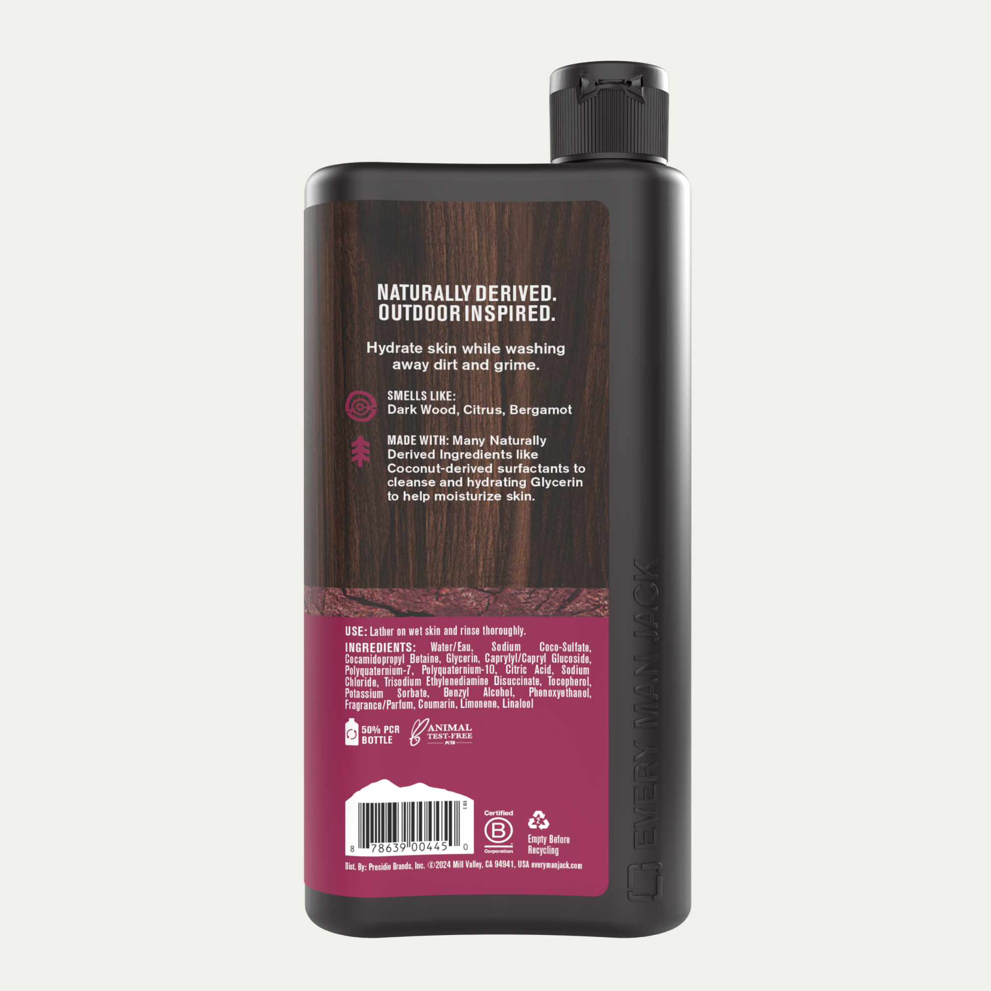 | Target Description | Our body wash deep cleans and moisturizes, leaving you smelling fresh and feeling hydrated. We stacked our formula with naturally-derived ingredients like Coconut-Derived Surfactants and Glycerin to give you a classic clean with a rugged, outdoor twist. Born at the base of Mt. Tam in Marin County, California. Over 16 years of inspiring men to take care of themselves and connect to the world around them. Our efficacious products draw from our passion for the outdoors with Naturally Derived Ingredients and scents that bring the best of nature into our bottles and bars. Packaging contains >30% recycled content |