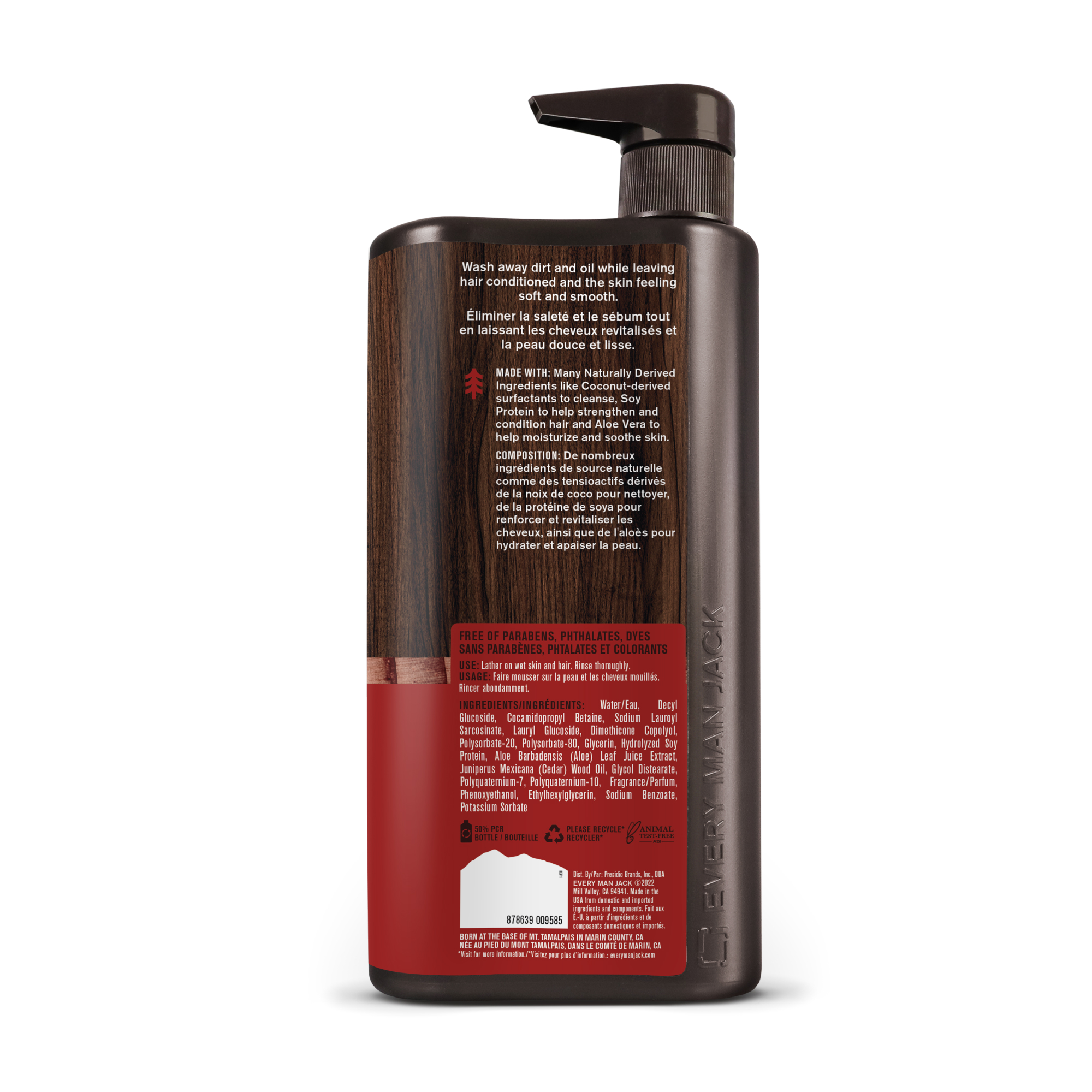 | Ingredients Statement | Water/Eau, Decyl Glucoside, Cocamidopropyl Betaine, Sodium Lauroyl Sarcosinate, Lauryl Glucoside, Dimethicone Copolyol, Polysorbate-20, Polysorbate-80, Glycerin, Aloe Barbadensis (Aloe) Leaf Juice Extract, Juniperus Mexicana (Cedar) Wood Oil, Hydrolyzed Soy Protein, Glycol Distearate, Polyquaternium-7, Polyquaternium-10, Phenoxyethanol, Ethylhexylglycerin, Sodium Benzoate, Potassium Sorbate, Fragrance/Parfum |