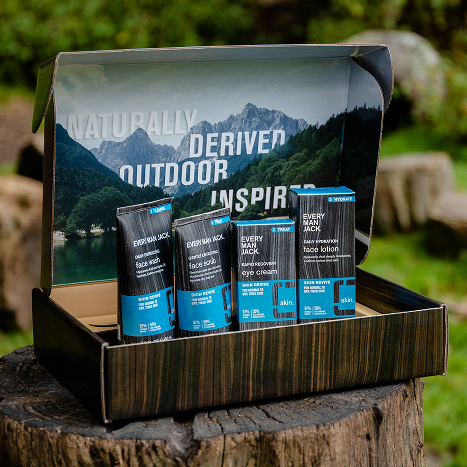 | Product Description | Every Man Jack Skin Revive Regimen Set is the perfect introduction to Skin Revive’s simple 3-step solution to reviving dry, tired skin. Designed with a powerful lineup of effective, Naturally Derived Ingredients, Skin Revive cleanses, treats, and hydrates to help your skin feel awake, revived, and instantly hydrated. This complete Skin Revive set includes Daily Energizing Face Wash, Gentle Exfoliating Face Scrub, Rapid Recovery Eye Cream, and Daily Hydration Face Lotion. Loaded with Hyaluronic Acid to draw in moisture to help skin maintain hydration levels. Antioxidant-rich Green Tea and Persian Silk Extract help promote a youthful appearance, while Caffeine revives and awakens your tired skin. With easy-to-follow steps and everything needed to give tired skin a boost, this set makes the perfect gift for any guy needing to upgrade his skincare routine, including yourself. |