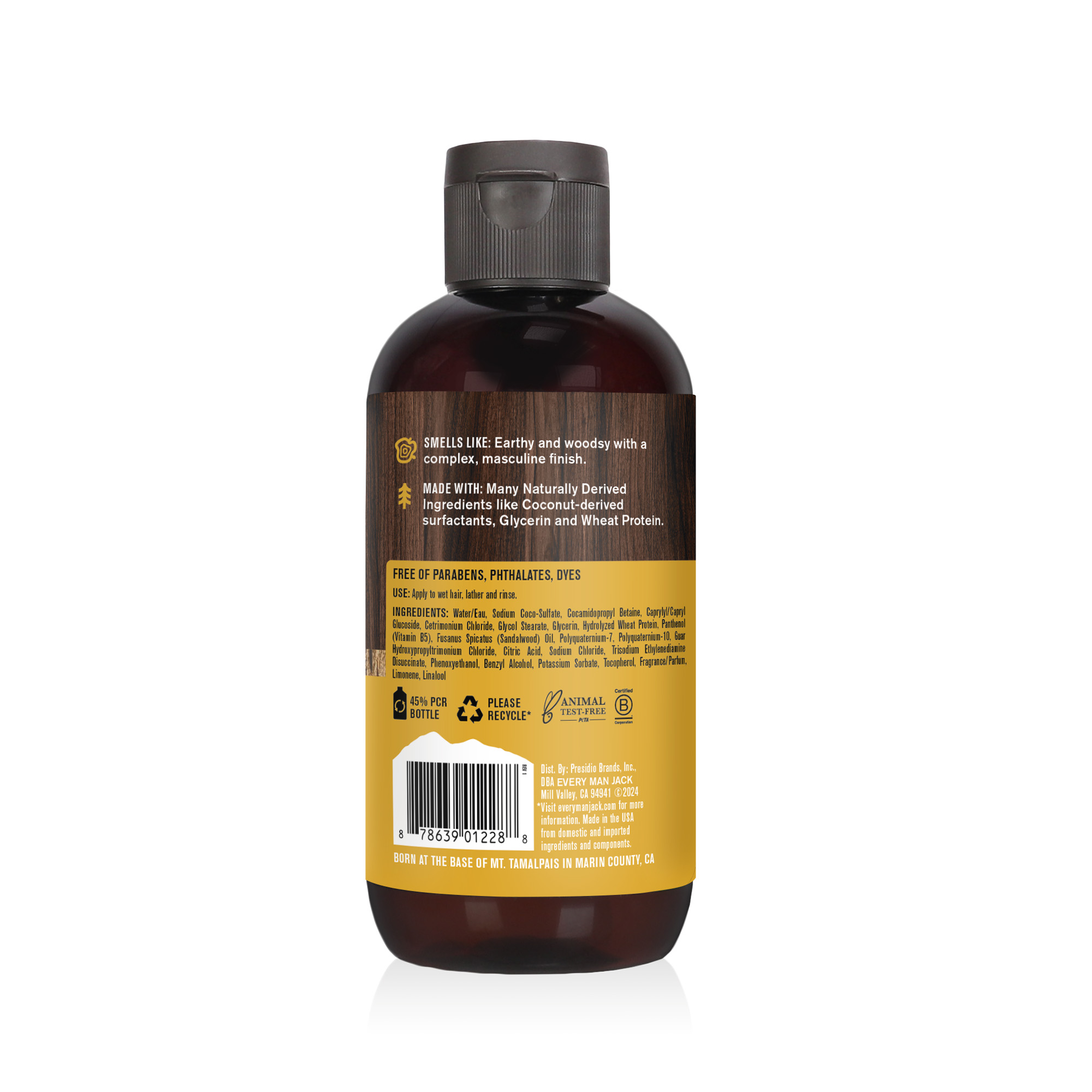 | Ingredients Statement | Water/Eau, Sodium Coco-Sulfate, Cocamidopropyl Betaine, Caprylyl/Capryl Glucoside, Cetrimonium Chloride, Glycol Stearate, Glycerin, Hydrolyzed Wheat Protein, Panthenol (Vitamin B5), Fusanus Spicatus (Sandalwood) Oil, Polyquaternium-7, Polyquaternium-10, Guar Hydroxypropyltrimonium Chloride, Citric Acid, Sodium Chloride, Trisodium Ethylenediamine Disuccinate, Phenoxyethanol, Benzyl Alcohol, Potassium Sorbate, Tocopherol, Fragrance/Parfum, Limonene, Linalool |