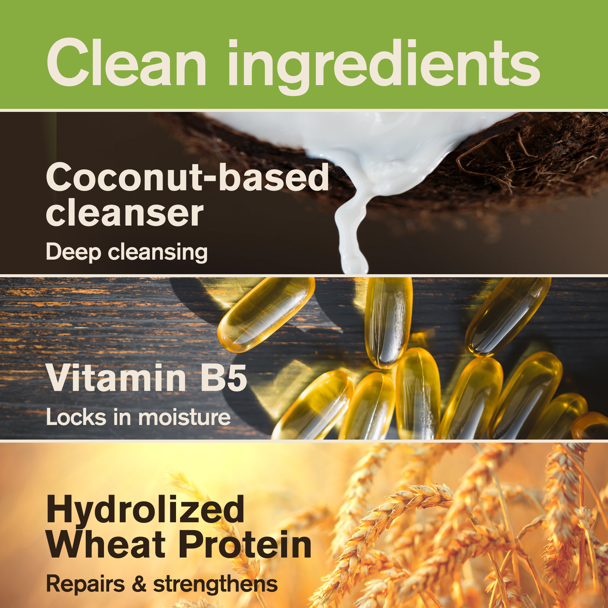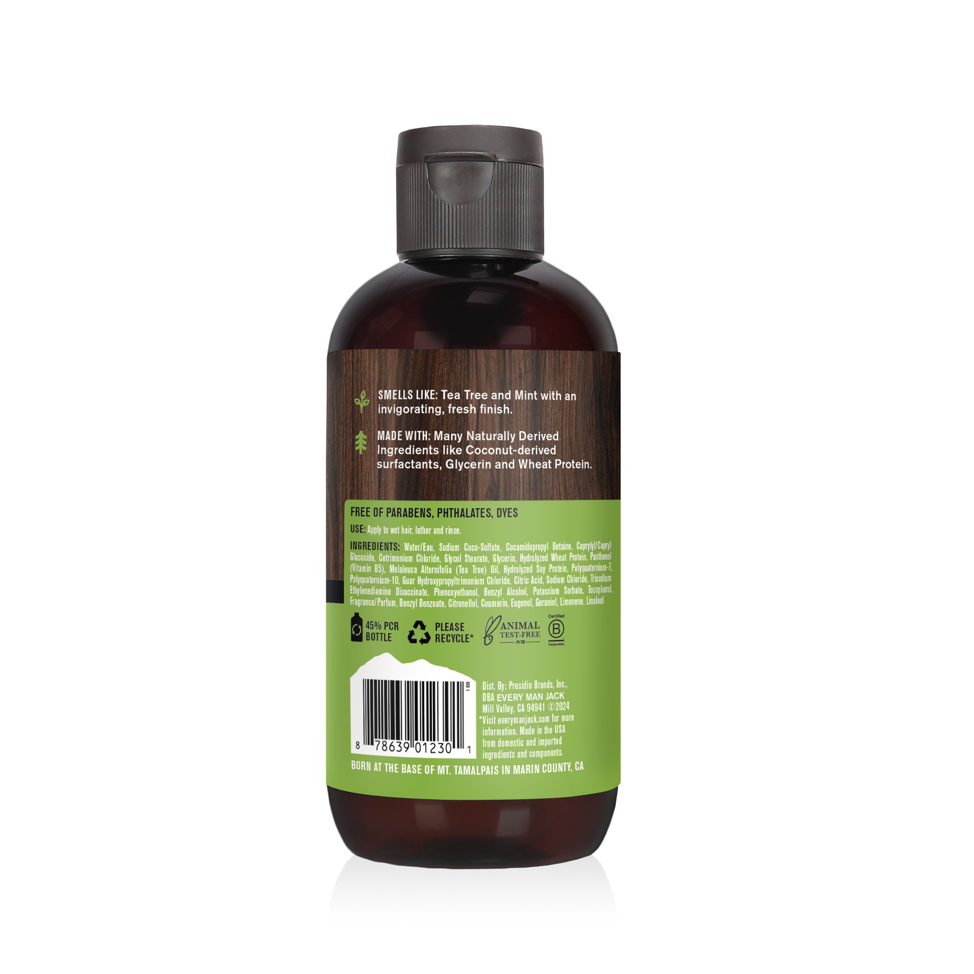 | Inactive Ingredients | Water/Eau, Sodium Coco-Sulfate, Cocamidopropyl Betaine, Caprylyl/Capryl Glucoside, Cetrimonium Chloride, Glycol Stearate, Glycerin, Hydrolyzed Wheat Protein, Panthenol (Vitamin B5), Melaleuca Alternifolia (Tea Tree) Oil, Hydrolyzed Soy Protein, Polyquaternium-7, Polyquaternium-10, Guar Hydroxypropyltrimonium Chloride, Citric Acid, Sodium Chloride, Trisodium Ethylenediamine Disuccinate, Phenoxyethanol, Benzyl Alcohol, Potassium Sorbate, Tocopherol, Fragrance/Parfum, Benzyl Benzoate, Citronellol, Coumarin, Eugenol, Geraniol, Limonene, Linalool |