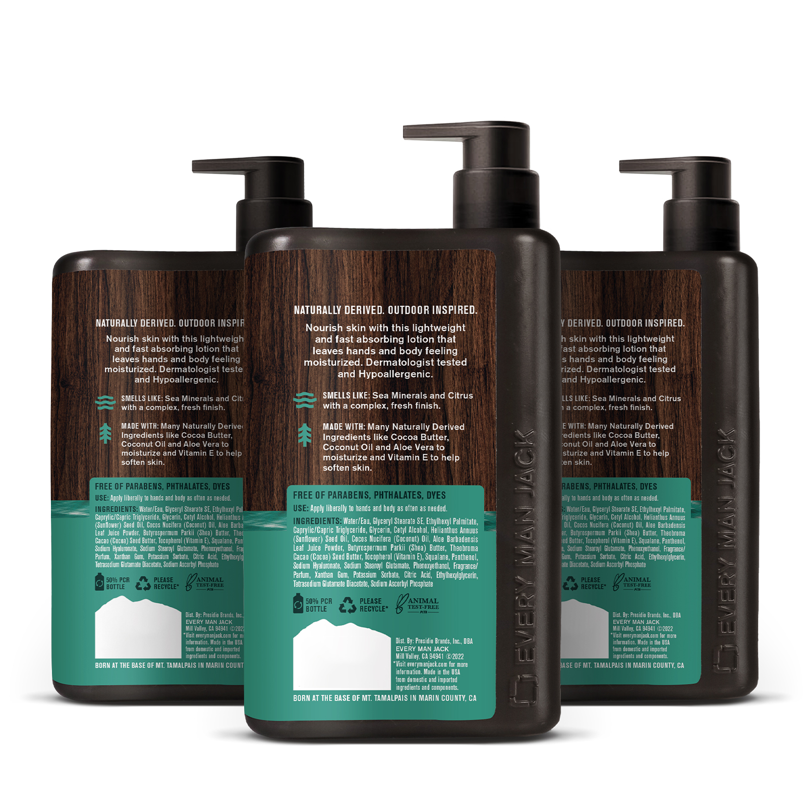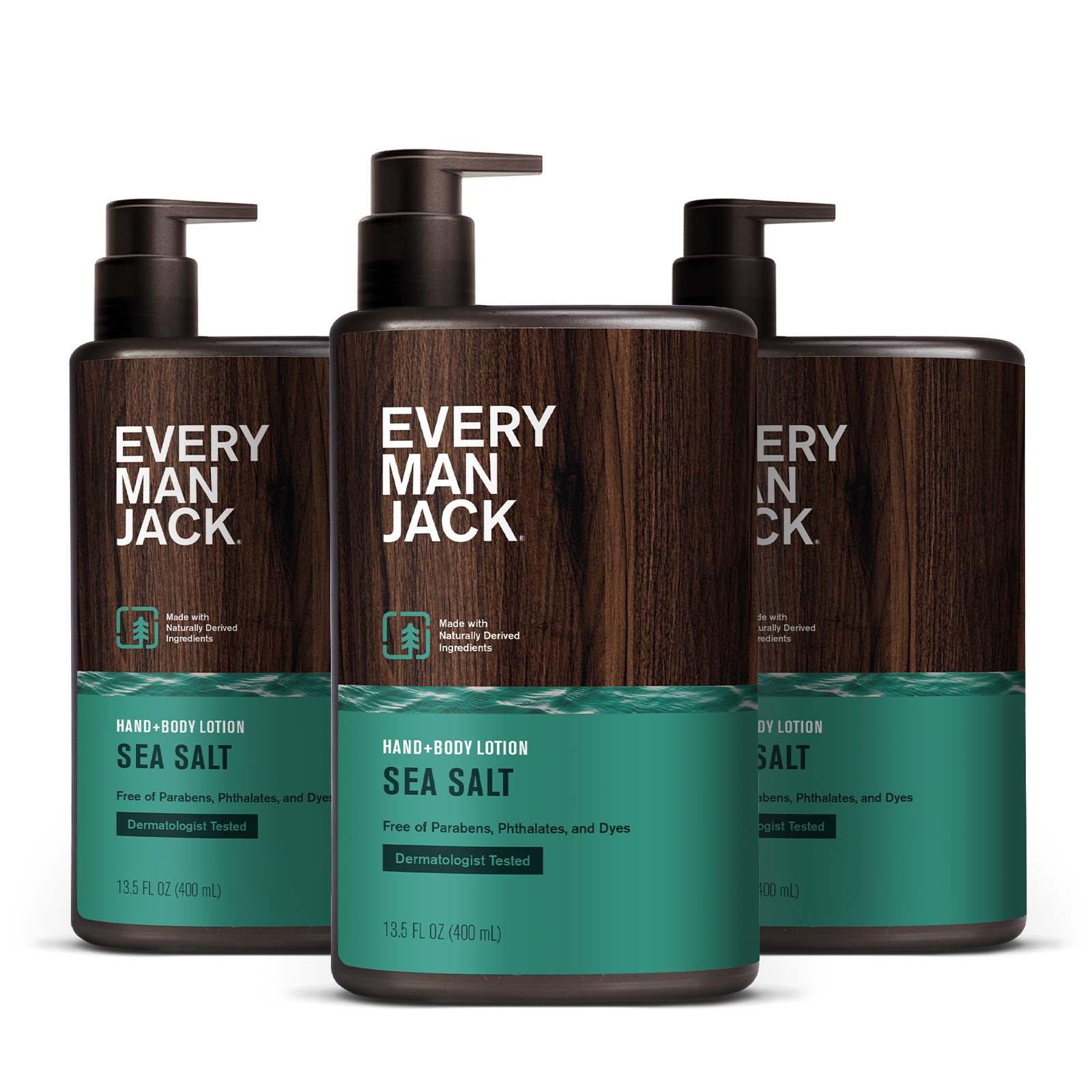 | Amazon Title | Every Man Jack Mens Sea Salt Hand & Body Lotion for All Skin Types - Dermatologist Tested & Hypoallergenic - Nourish Skin with Lightweight Fast Absorbing Lotion - 13.5oz 3 Bottles |