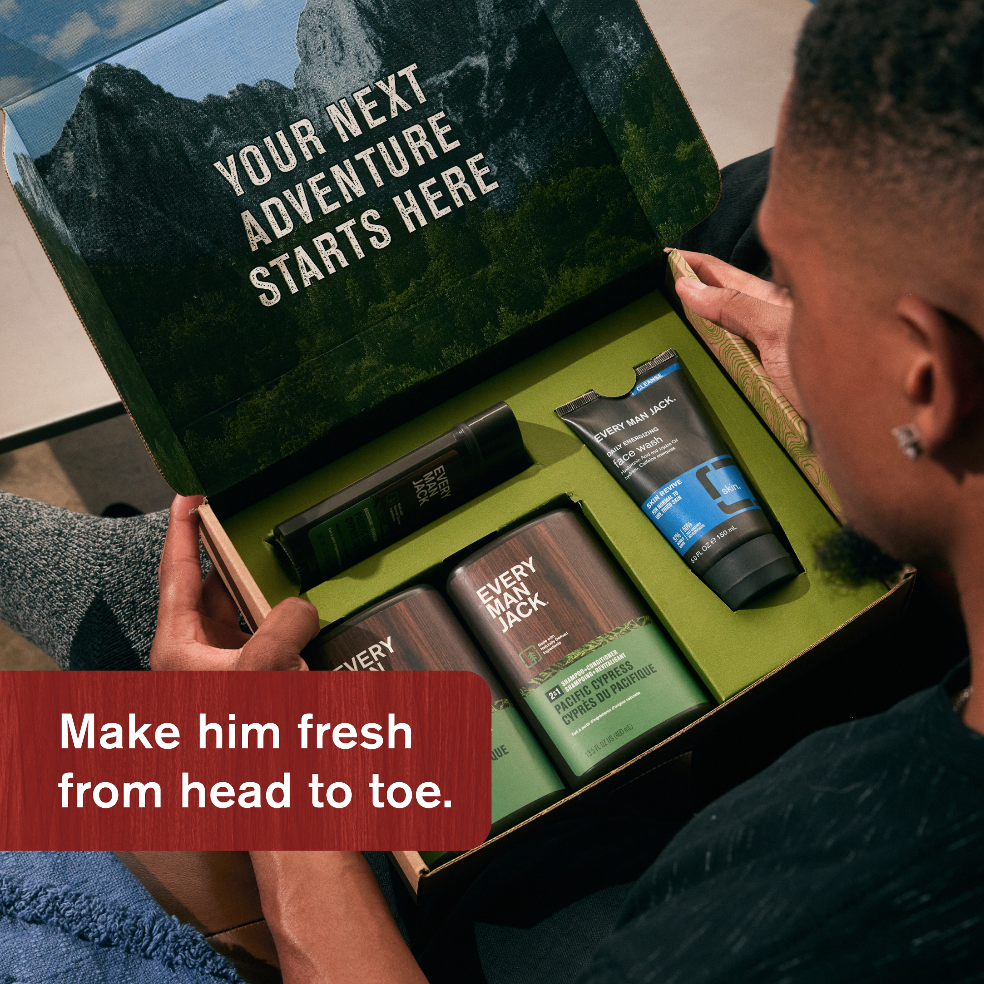| Bullet Point 2 | ROUND OUT HIS ROUTINE: Specially designed to cleanse, condition, and hydrate from head to toe; body care set includes Pacific Cypress Body Wash, 2-in-1 Shampoo + Conditioner, Aluminum Free Deodorant, and Skin Revive Daily Energizing Face Wash |