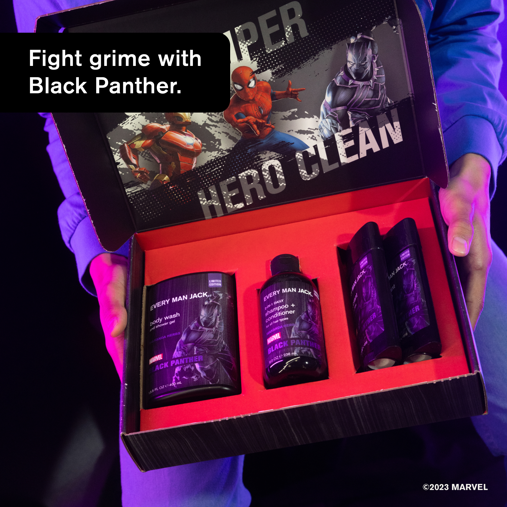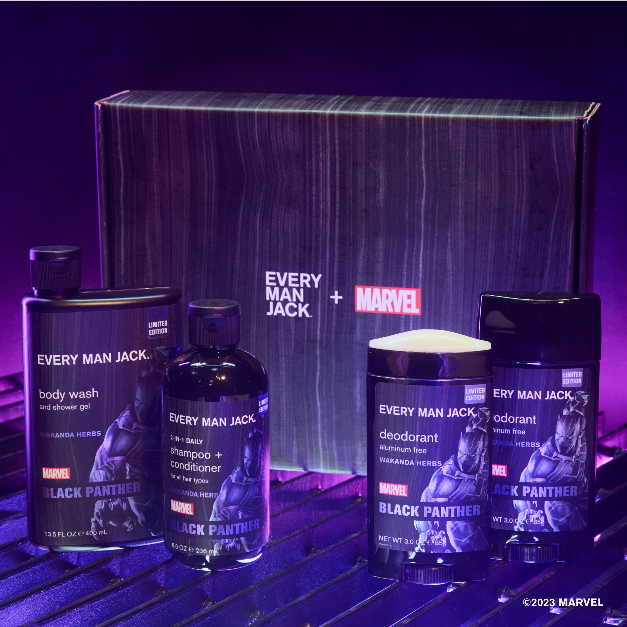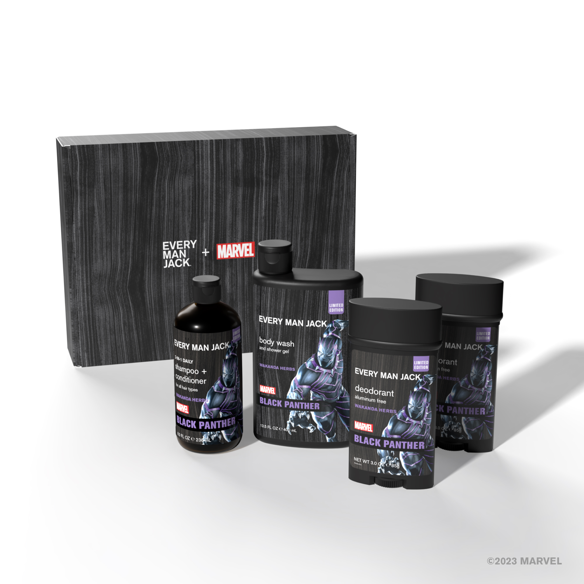 | Product Description | Take his get-ready routine to legendary heights with the Every Man Jack Black Panther Body Set. Packed with powerful, but gentle, Naturally Derived Ingredients. Skin-safe formulations Help any hero, big or small, get head-to-toe fresh with gentle Coconut-derived surfactants to cleanse his skin without overdrying, hydrating Shea Butter to help condition his hair, and Lichen Extract to help fight underarm odors all day long. With a limited-edition Wakanda Herbs scent inspired by the epic Marvel superhero, this Black Panther gift will upgrade his showers with notes inspired by Wakanda Spice, Madagascar Vanilla, Ebony Wood, Sandalwood and Metallic notes of Vibranium. |
