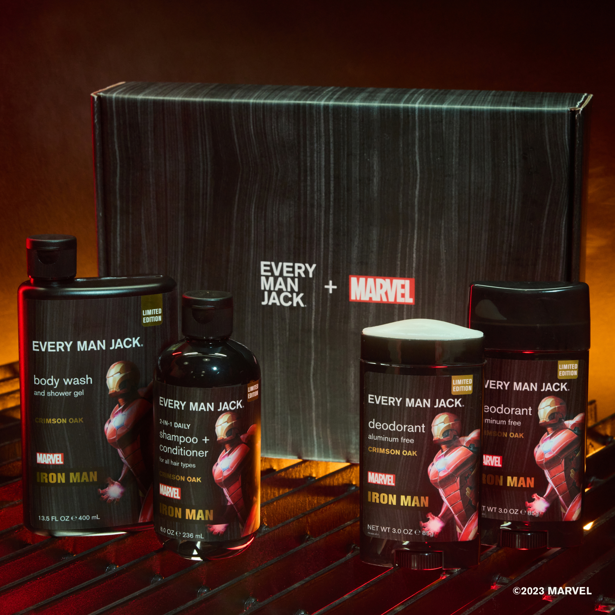 | Product Description | Take his get-ready routine to legendary heights with the Every Man Jack Iron Man Body Set. Packed with powerful, but gentle, Naturally Derived Ingredients, this body care set includes a 13.5oz Iron Man Body Wash, 2-in-1 Shampoo + Conditioner, and a twin pack of Aluminum Free Deodorant. Help any hero, big or small, get head-to-toe fresh with gentle Coconut-derived surfactants to cleanse his skin without overdrying, hydrating Shea Butter to help condition his hair, and Lichen Extract to help fight underarm odors all day long. With a limited-edition Crimson Oak scent inspired by the legendary Marvel superhero, this Iron Man gift will upgrade his showers with notes inspired by Stark leather and robust Oak Wood barrel, and all followed by a sophisticated hint of Scotch. |