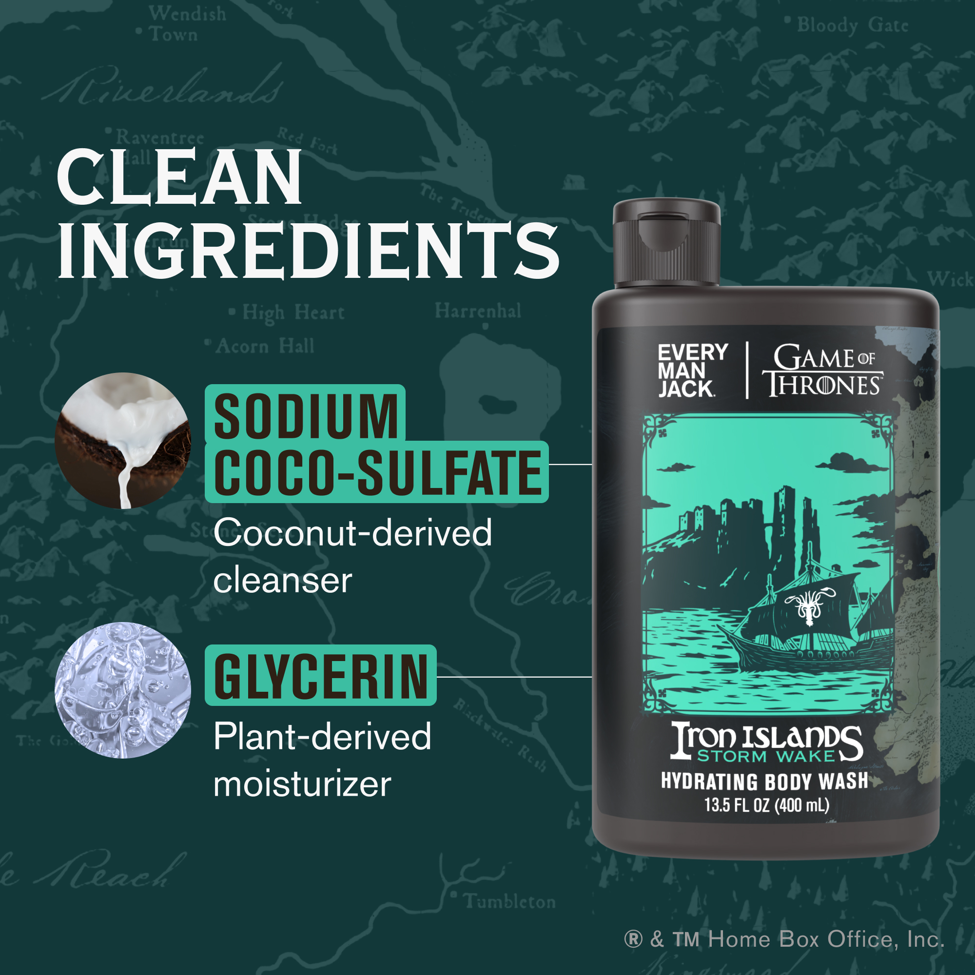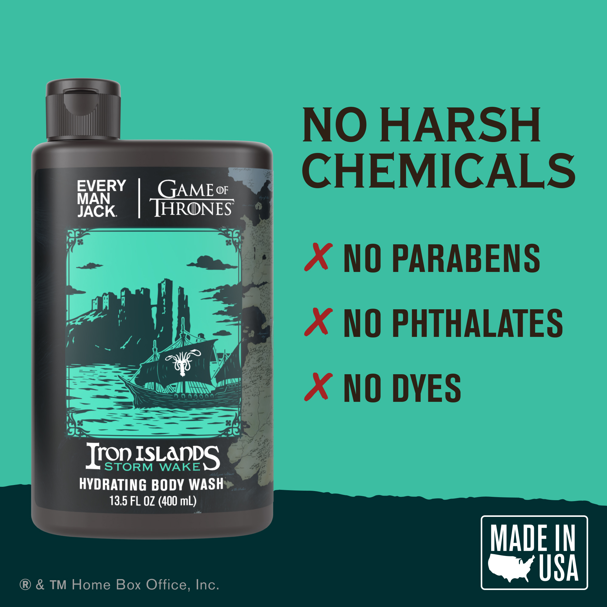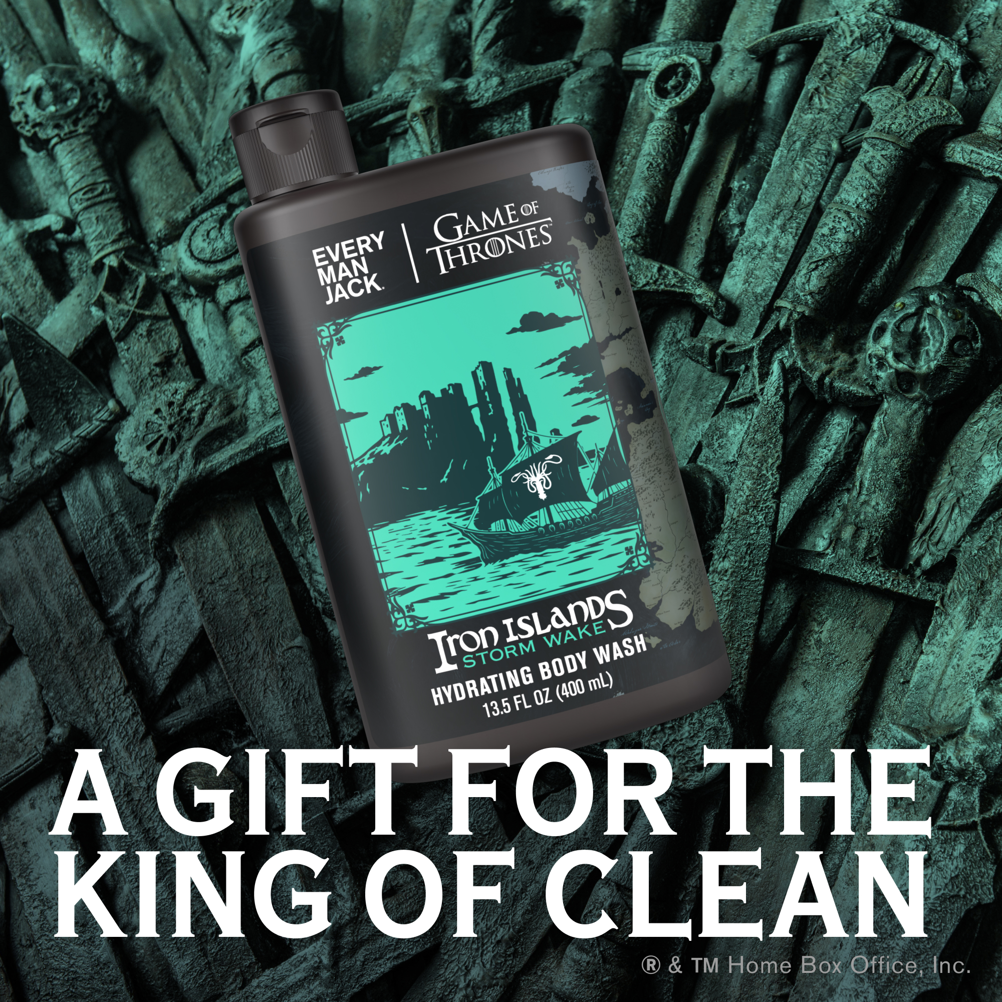 | Bullet Point 2 | CUSTOM COLLECTOR’S BOTTLE: This limited edition Game of Thrones Body Wash features detailed artwork inspired by one of the series’ most iconic kingdoms. One of four in the complete set, “Iron Islands Storm Wake” is a perfect gift for true fans of the series. |
