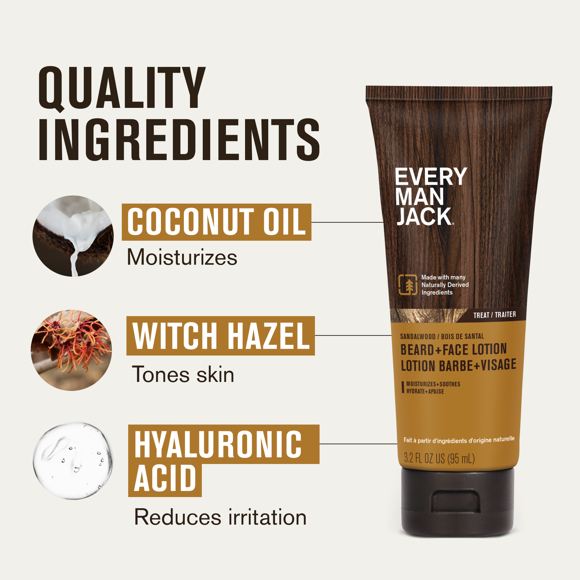 | Name | Every Man Jack Beard + Face Recovery Lotion - Moisturizes Relieves Dry Skin and Beard Itch - Light Sandalwood Scent - Made w/Naturally Derived Ingredients like Coconut Oil, and Witch Hazel - 95 mL - 2 Pack |
