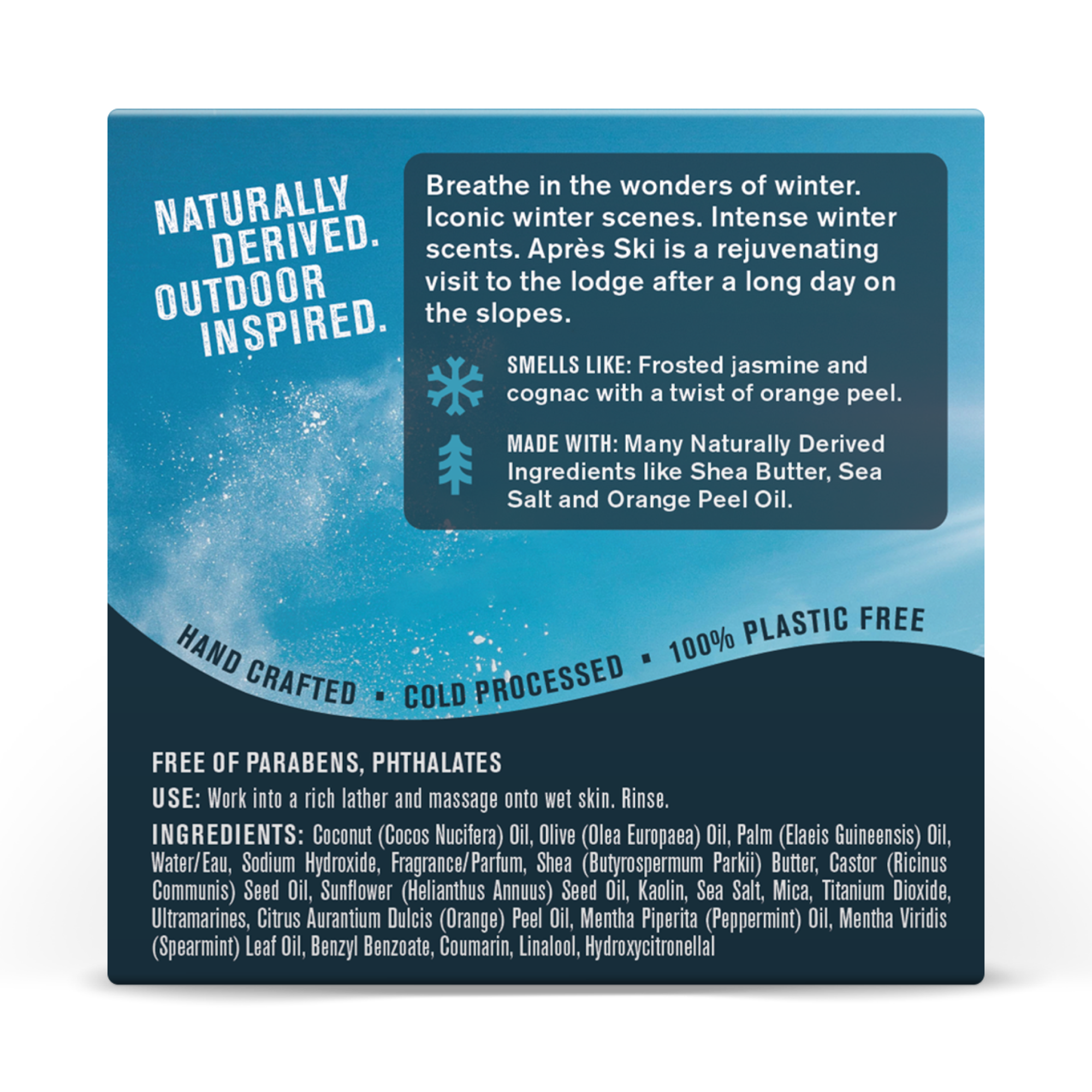 | Product Description | Breathe in the wonders of winter. Experience invigorating winter scents crafted to transport you to snowy mountain retreats and cozy cabin evenings. Formulated with nourishing ingredients, these soaps cleanse and moisturize, leaving your skin refreshed and rejuvenated. |