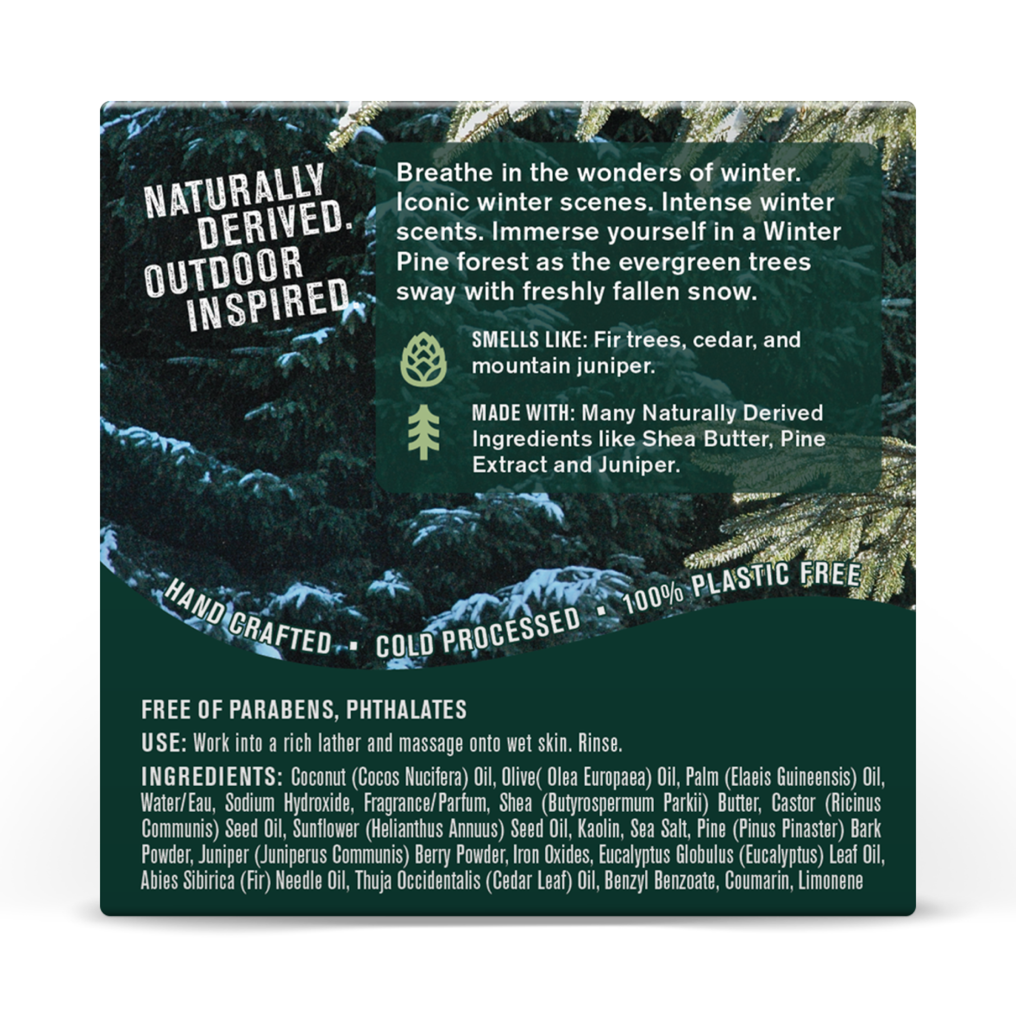| Ingredients Statement | Coconut (Cocos Nucifera) Oil, Olive (Olea Europaea) Oil, Palm (Elaeis Guineensis) Oil, Water/ Eau, Sodium Hydroxide, Fragrance/ Parfum, Shea (Butyrospermum Parkii) Butter, Castor (Ricinus Communis) Seed Oil, Sunflower (Helianthus Annuus) Seed Oil, Kaolin, Sea Salt, Pine (Pinus Pinaster) Bark Powder, Juniper (Juniperus Communis) Berry Powder, Chromium Oxide Greens, Iron Oxides, Eucalyptus Globulus (Eucalyptus) Leaf Oil, Abies Sibirica (Fir) Needle Oil, Thuja Occidentalis (Cedar Leaf) Oil, Benzyl Benzoate, Coumarin, Limonene |