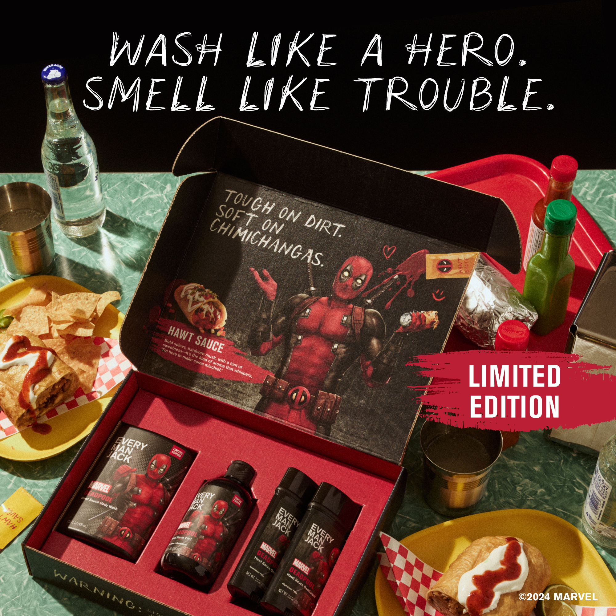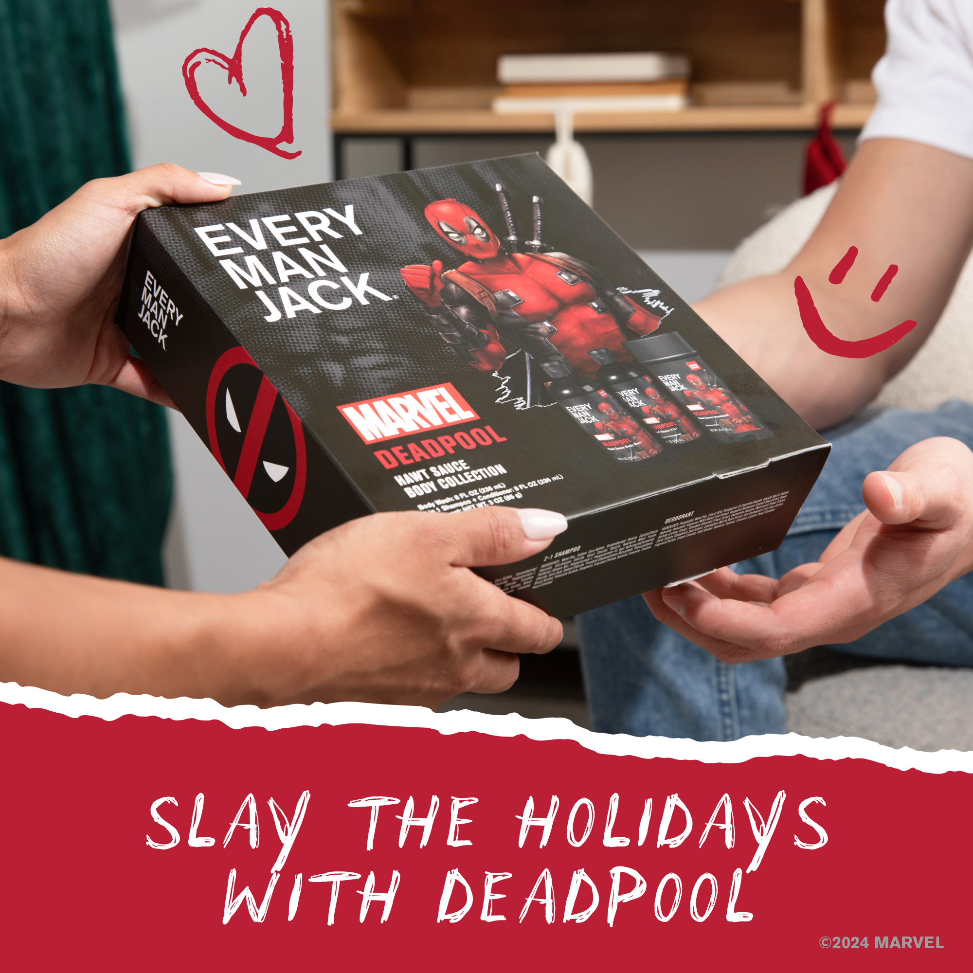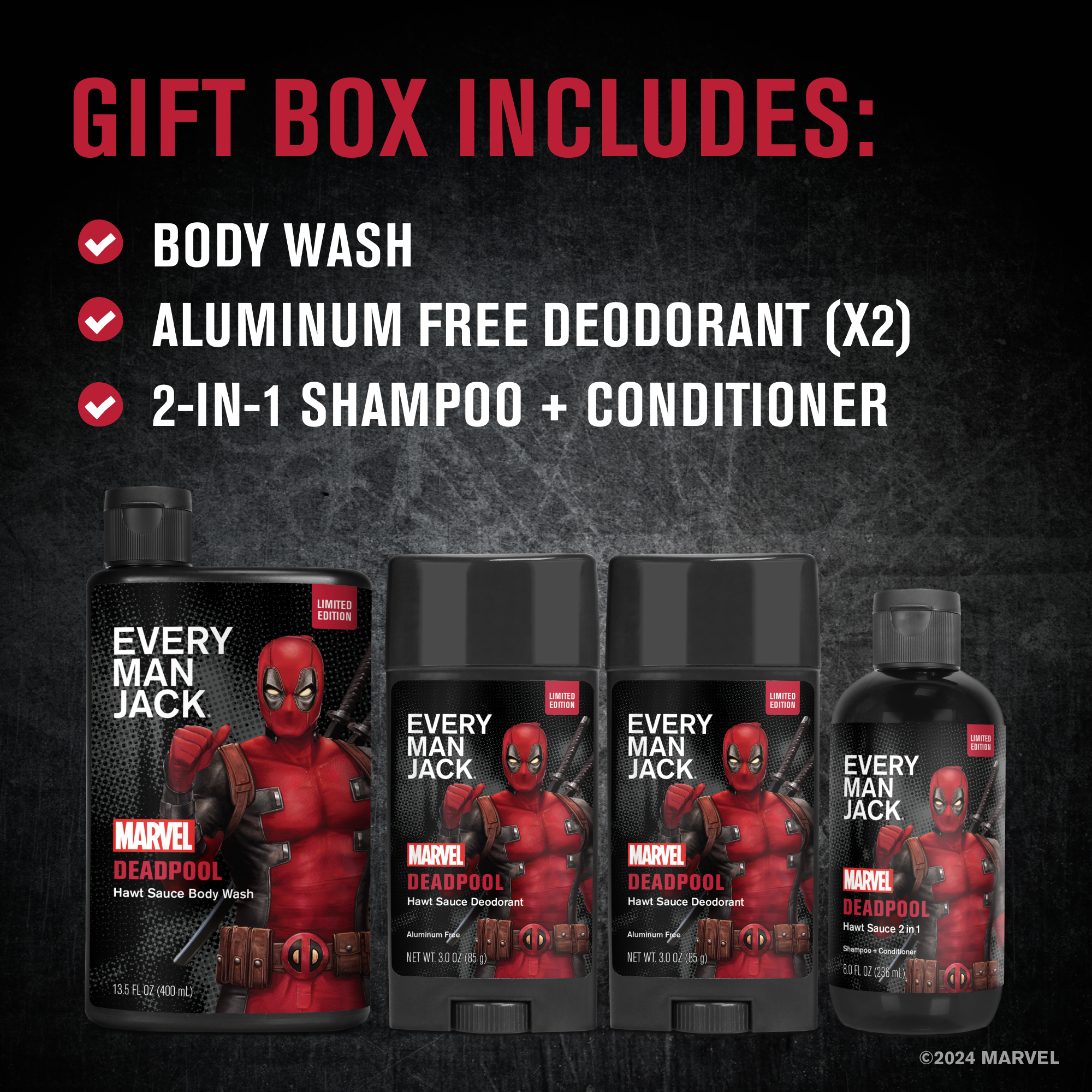 | Product Description | There’s a big difference between smelling like ass and smelling like a badass. Pick a side with the NEW limited edition Deadpool Collector’s Set, exclusively from Every Man Jack. Put some wit in your armpit (and everywhere else) with a trio of “Hawt Sauce” scented deodorant, body wash, and 2-in-1 shampoo. Plus it’s packed with Naturally Derived Ingredients that give your skin so much hydration… it’ll need a lifeguard. |