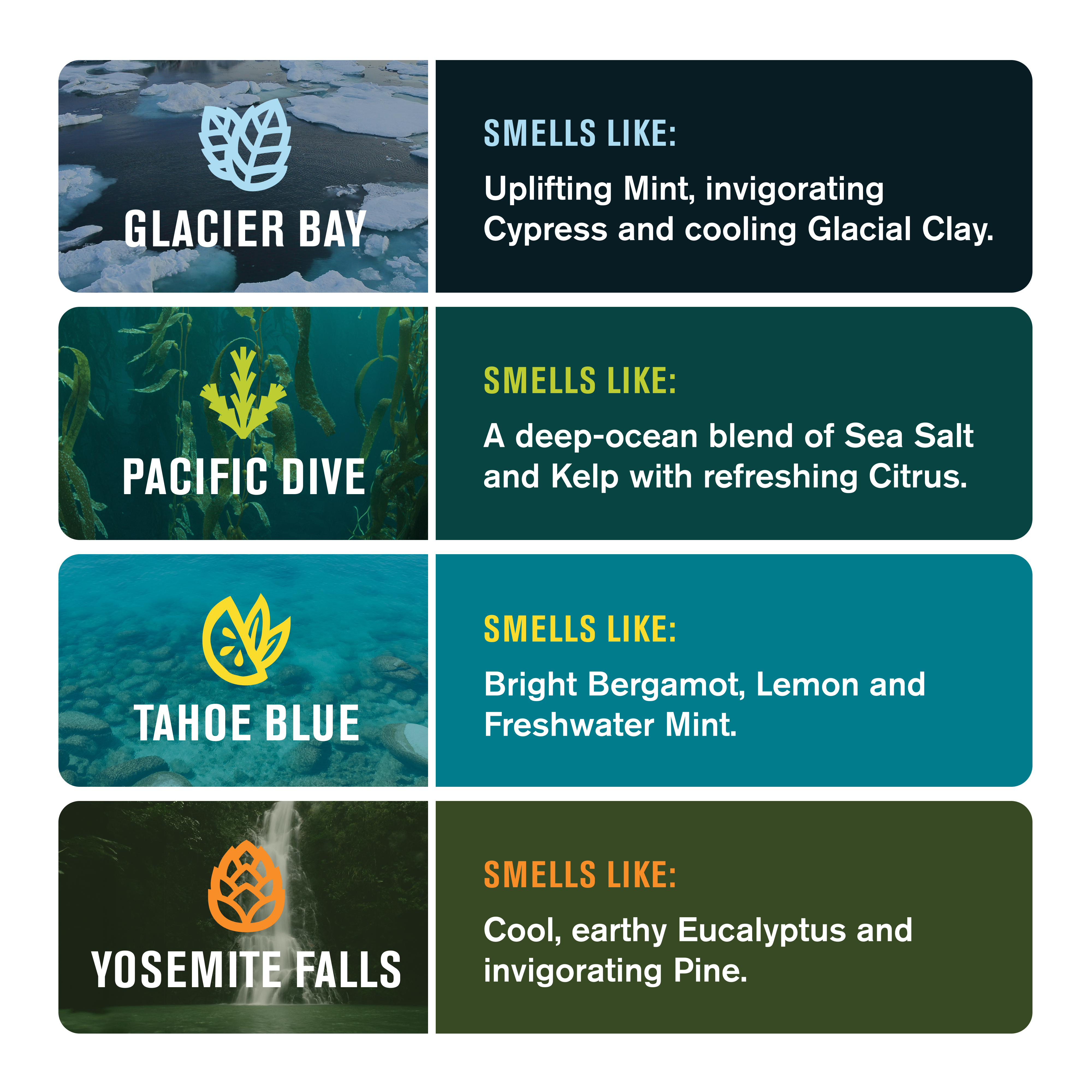 | Bullet Point 1 | SMELL LIKE A NATURAL WONDER: Bring the invigorating scents of the West Coast’s most iconic cold water locales with you into the shower. |