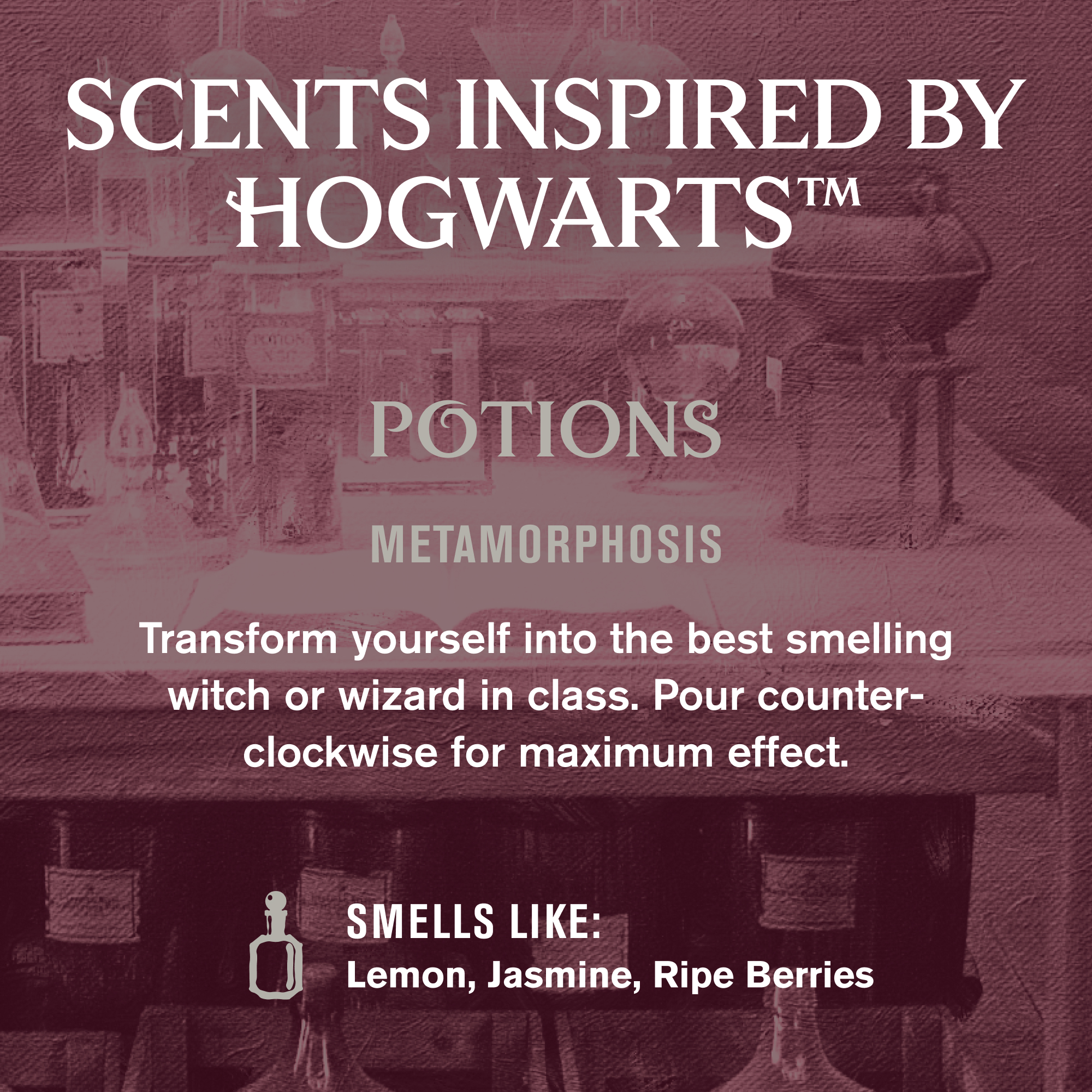 | Product Description | Transform yourself into the best smelling wizard in class with a magical blend of zesty lemon, crisp greens, jasmine, and ripe berries. Inspired by Harry Potter’s adventure in Potions class at Hogwarts™, it’s a captivating brew of Naturally Derived Ingredients that will enchant your skin with moisture. |